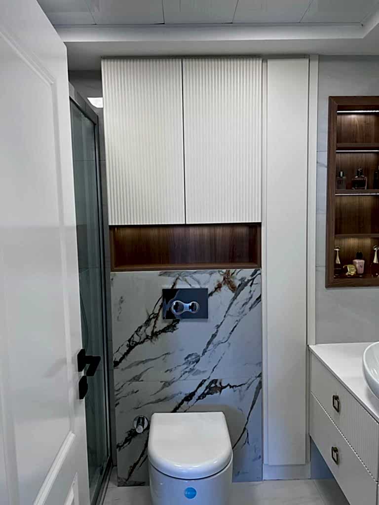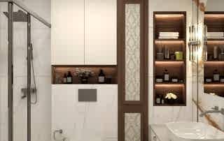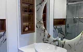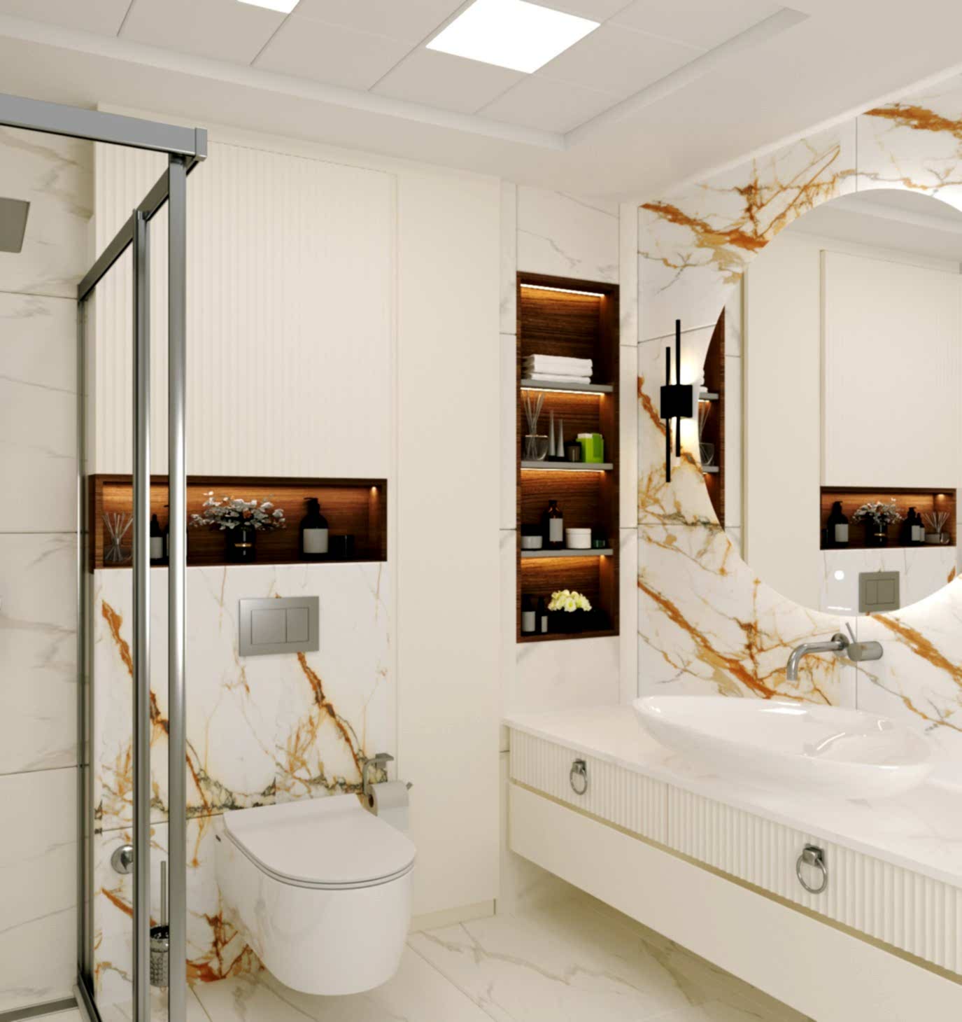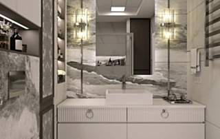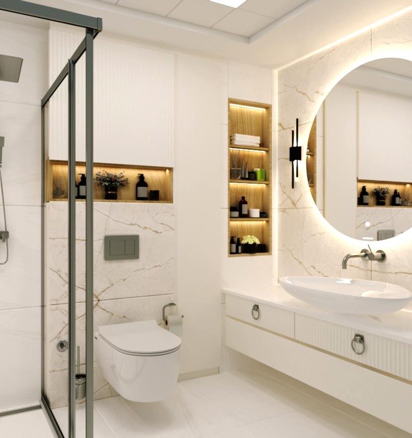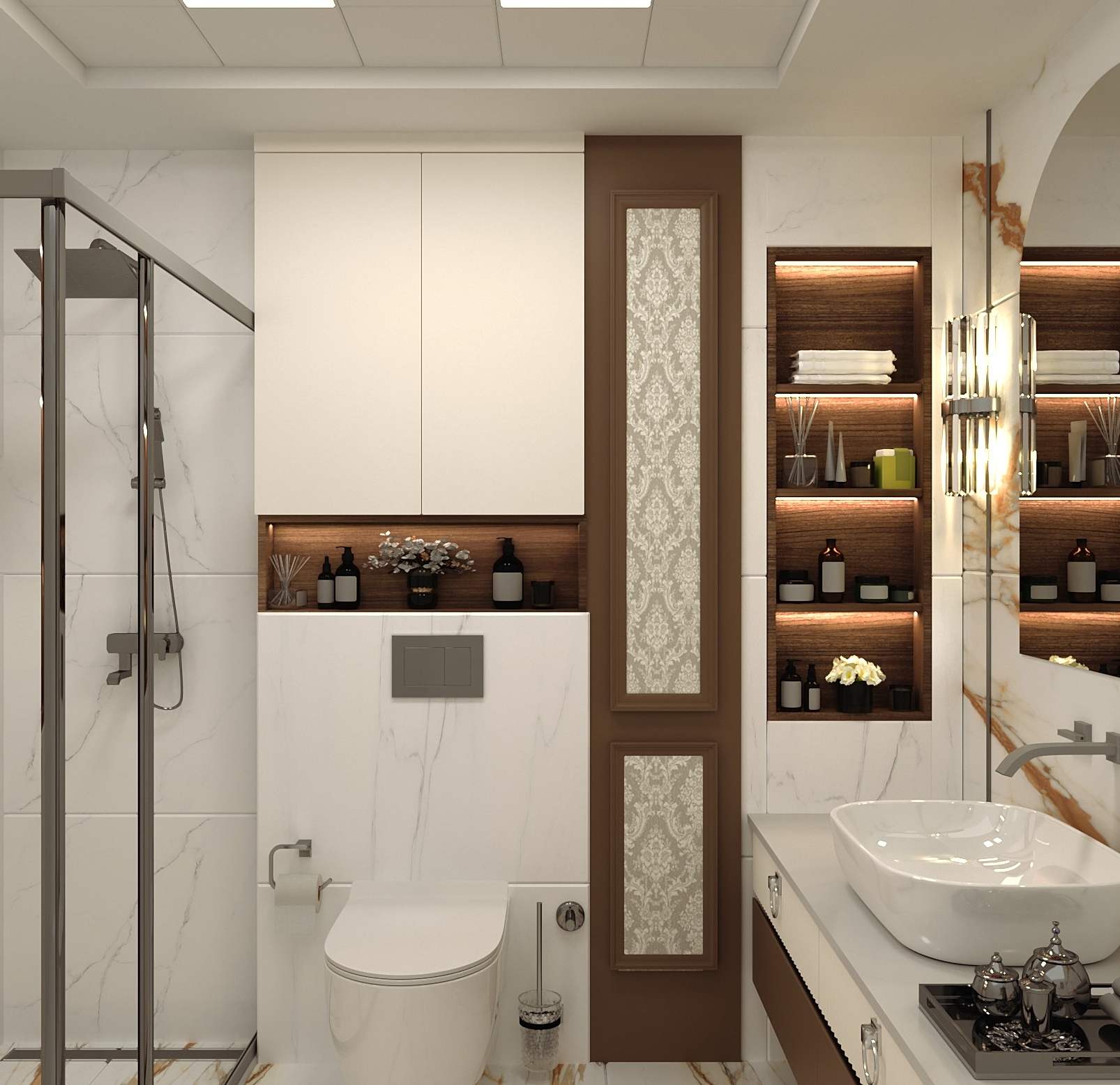 Banyolarda, evin genelindeki klasik tarz devam ettirildi. Hilton dolap yanı niş çalışması ve rezervuar üzerindeki niş, farklı malzemeler kullanılarak vurgulandı ve bu alanlar öne çıkarıldı. Duş alanındaki nişli dolap, alt kısmına entegre edilen düşer kapaklı kirli sepetiyle fonksiyonellik kazandı. Banyolarda genel atmosferi beyaz renk hakim olurken, aksesuar seçimleri ve niş içi led aydınlatmalar, sıcak bir ortam yarattı.