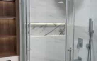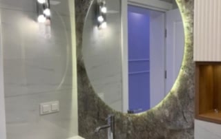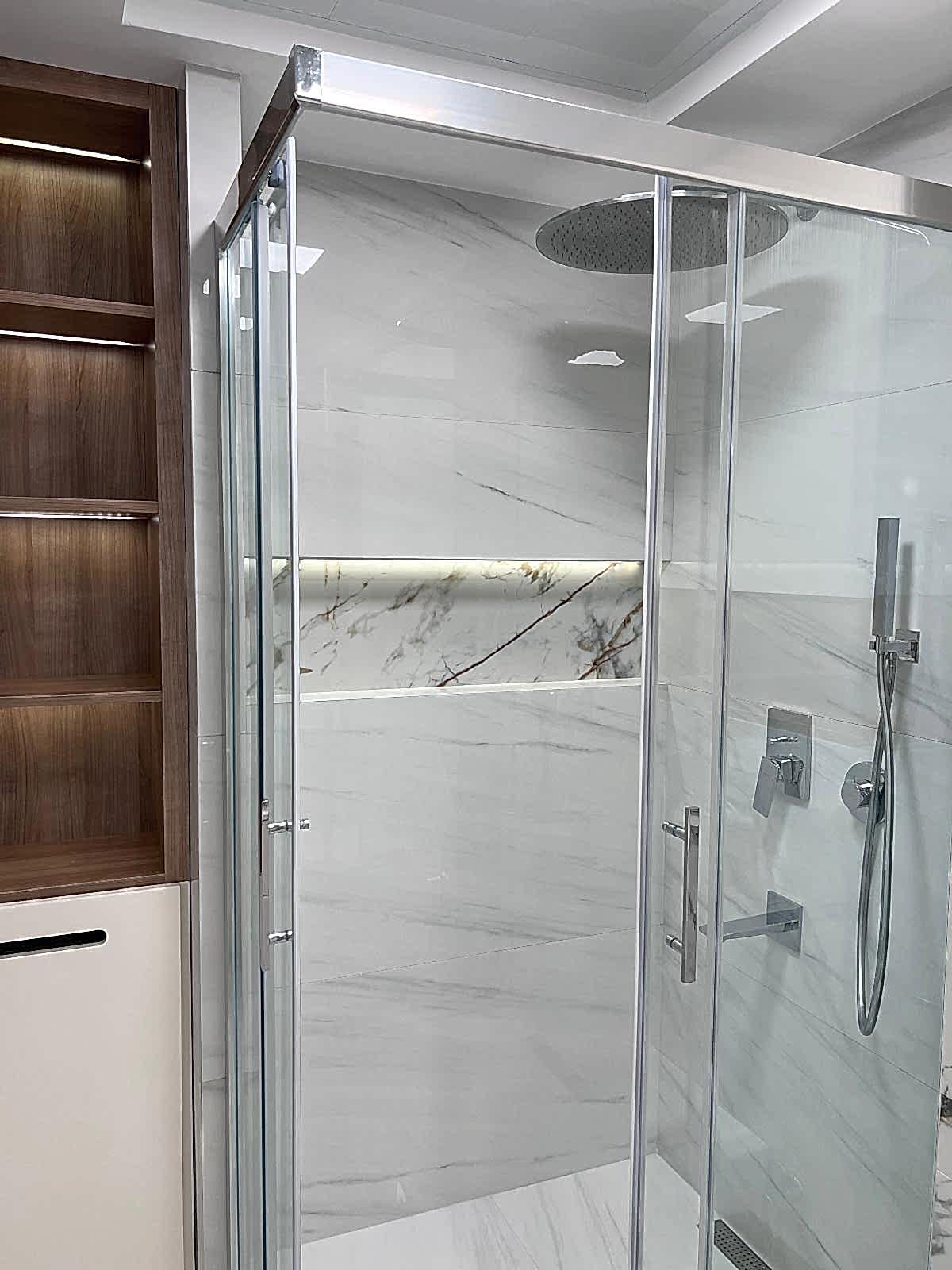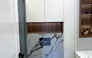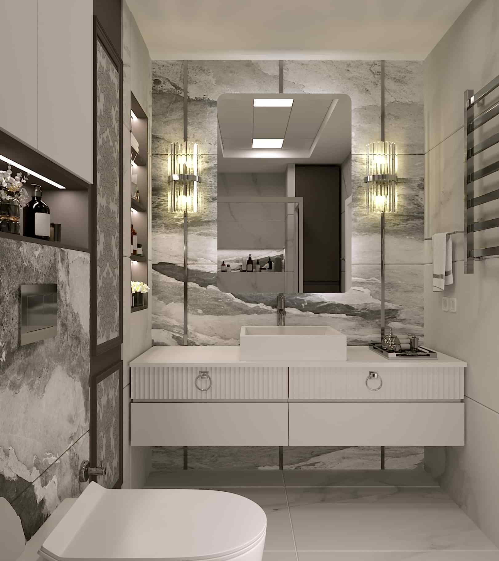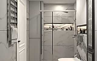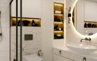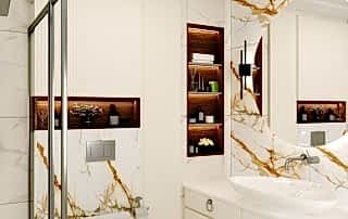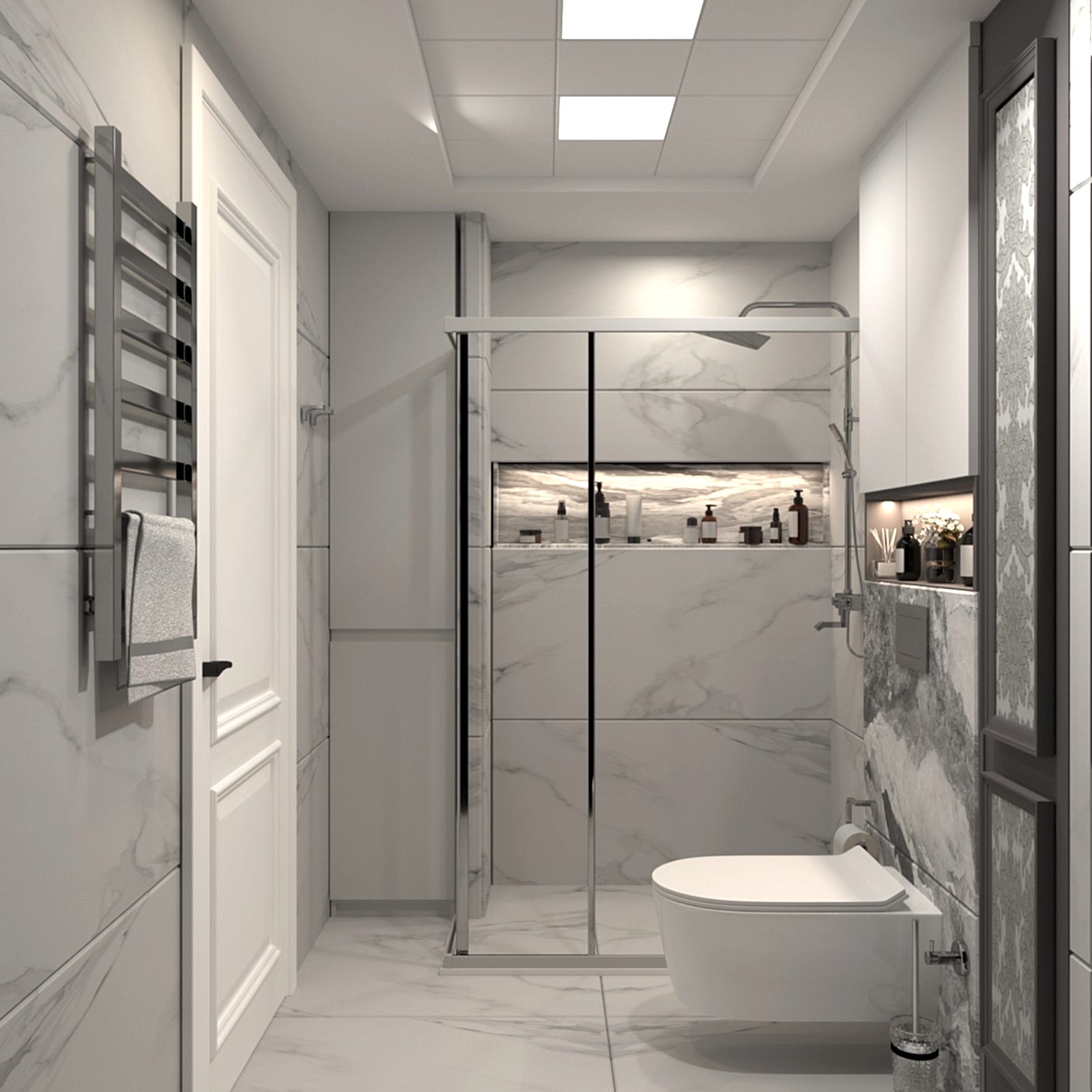 Banyolarda, evin genelindeki klasik tarz devam ettirildi. Hilton dolap yanı niş çalışması ve rezervuar üzerindeki niş, farklı malzemeler kullanılarak vurgulandı ve bu alanlar öne çıkarıldı. Duş alanındaki nişli dolap, alt kısmına entegre edilen düşer kapaklı kirli sepetiyle fonksiyonellik kazandı. Banyolarda genel atmosferi beyaz renk hakim olurken, aksesuar seçimleri ve niş içi led aydınlatmalar, sıcak bir ortam yarattı.