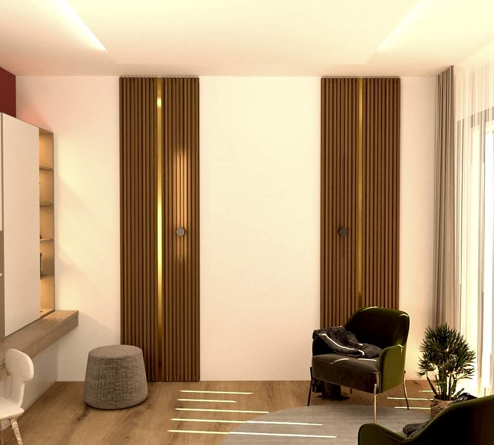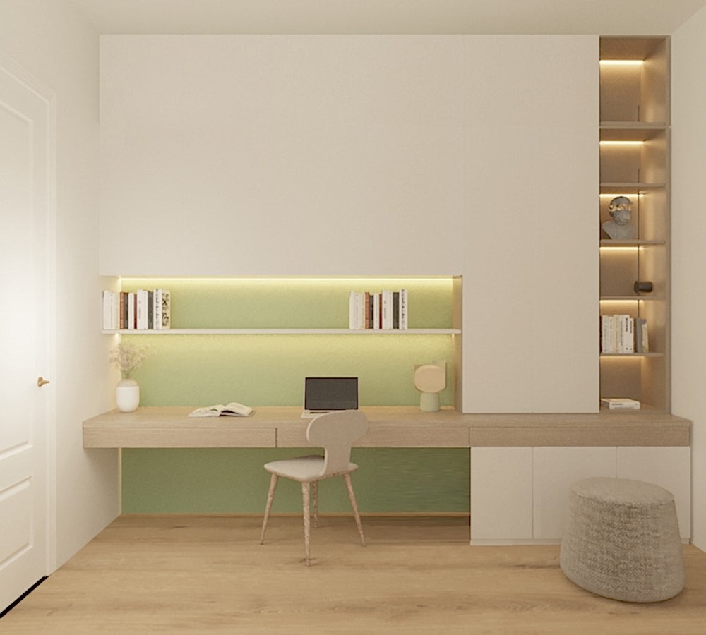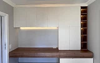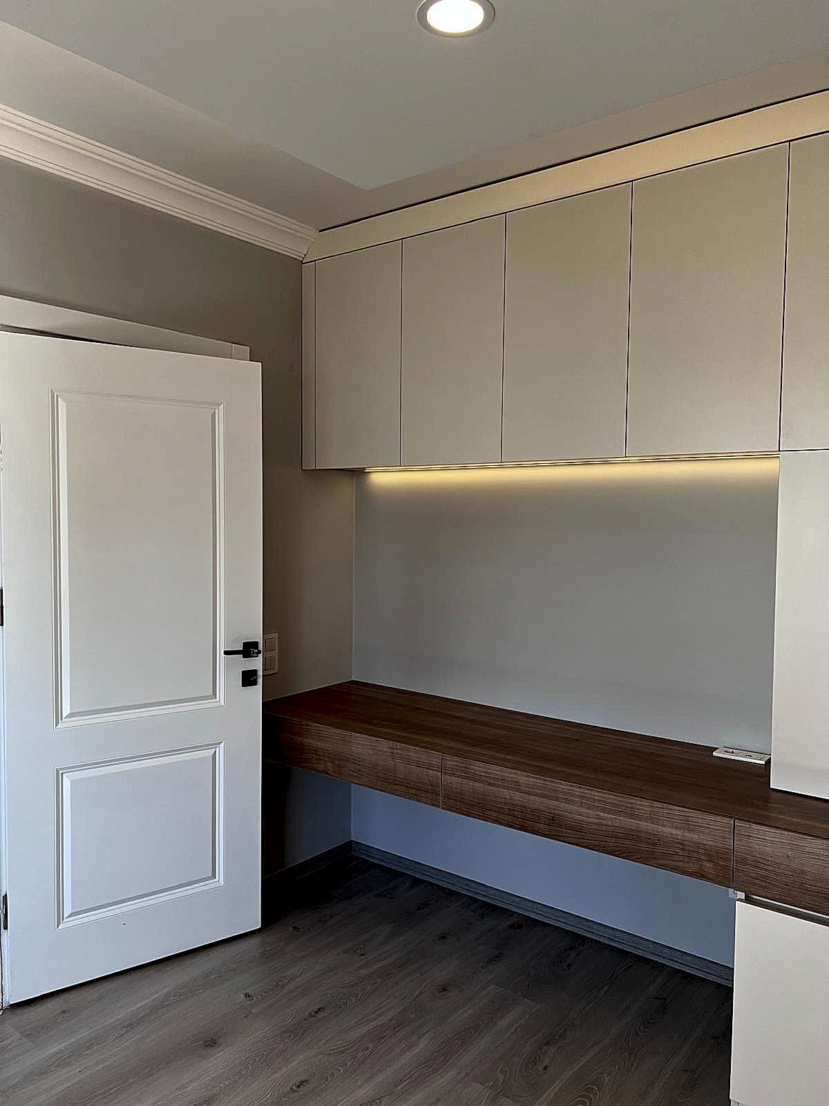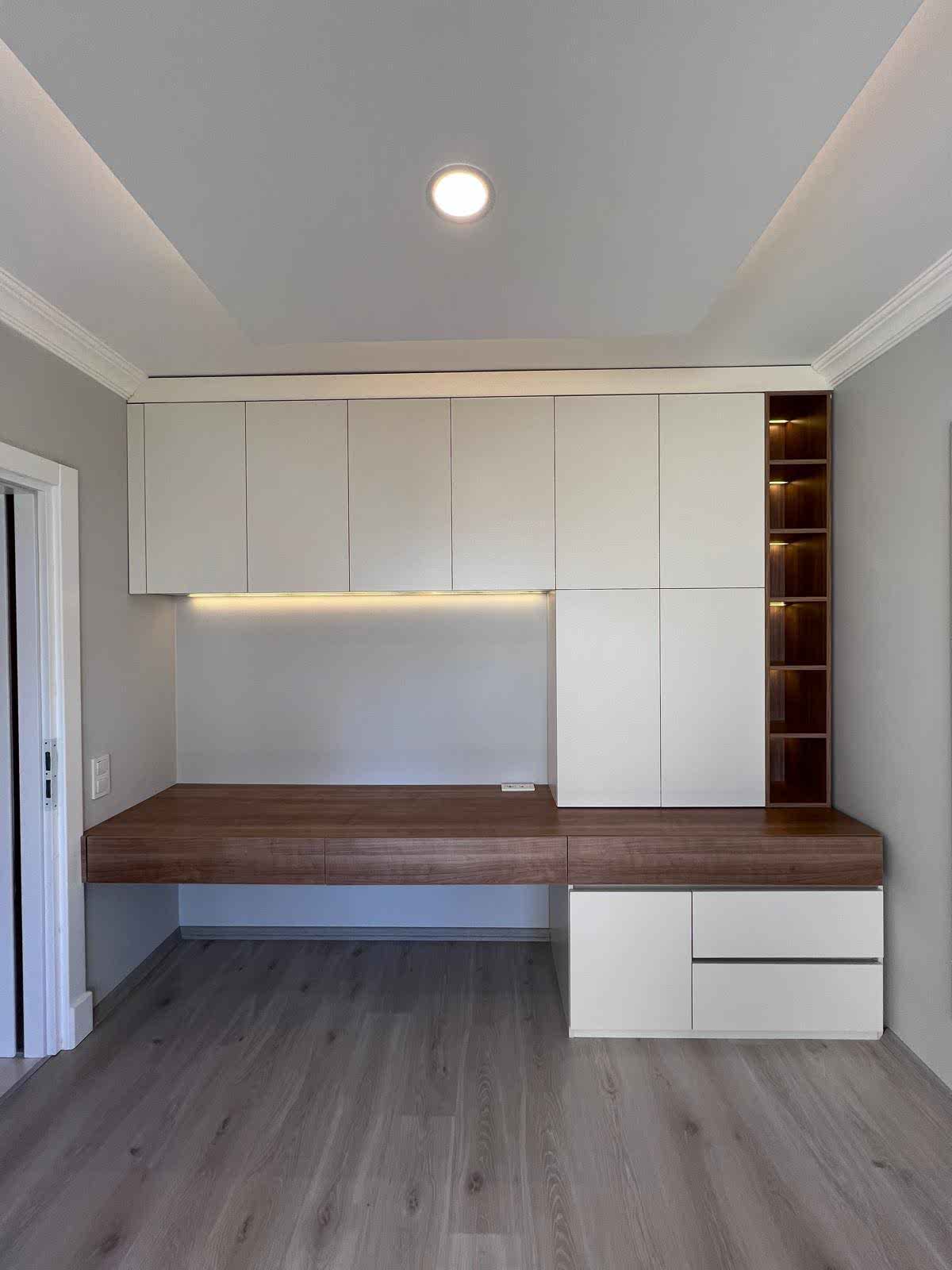 Çalışma odasında ise çıtalama çalışması devam ettirildi ve çıta içi duvar kağıdı uygulaması yapılarak diğer alanlarla uyum sağlandı. Bu alanda, özel olarak üretilmiş olan led aydınlatmalı nişli dolabın entegre olduğu, yüksek depolama hacmine sahip bir çalışma masası yer aldı. Böylece, çalışma alanı hem estetik hem de işlevsel açıdan mükemmel bir dengeye kavuştu.