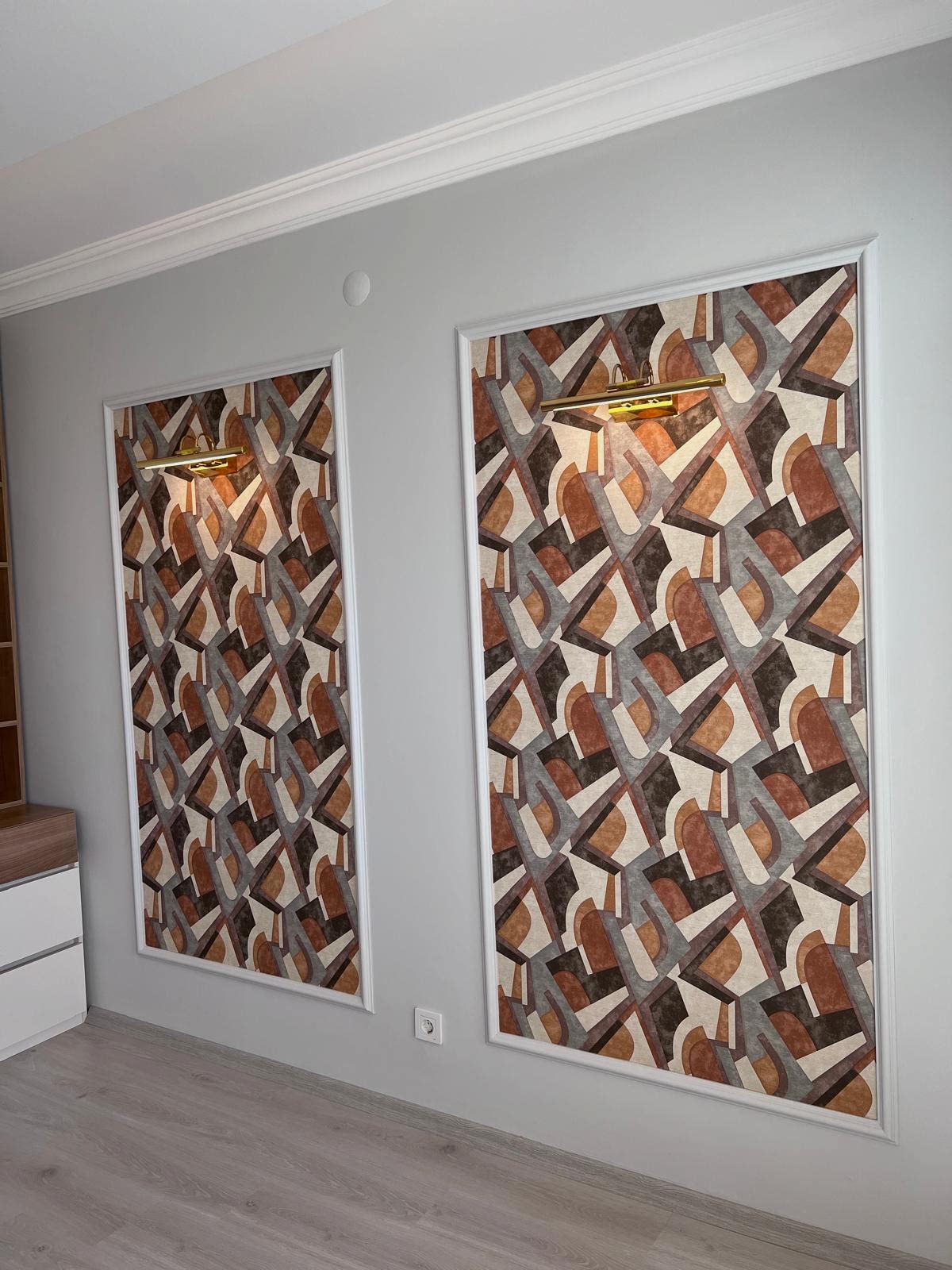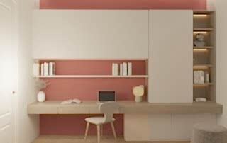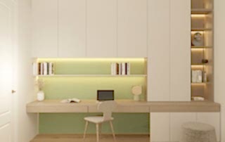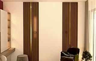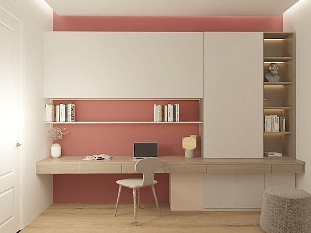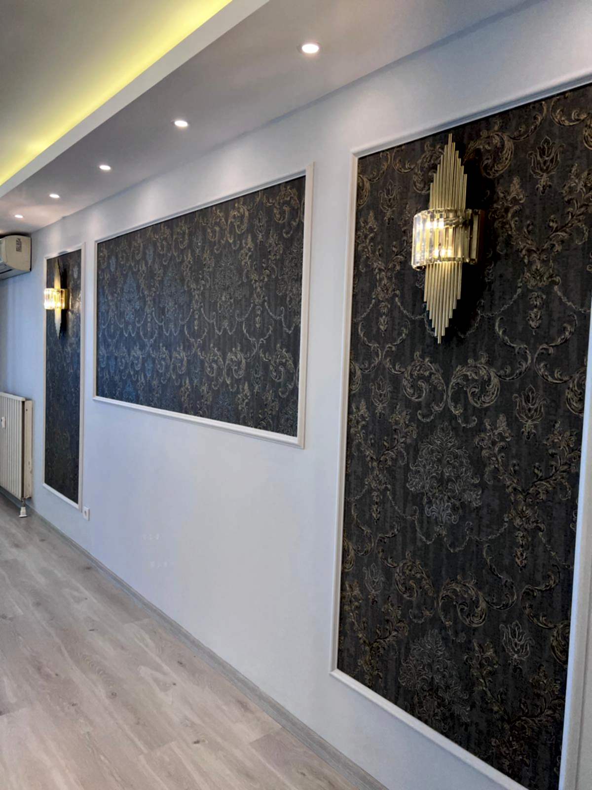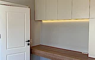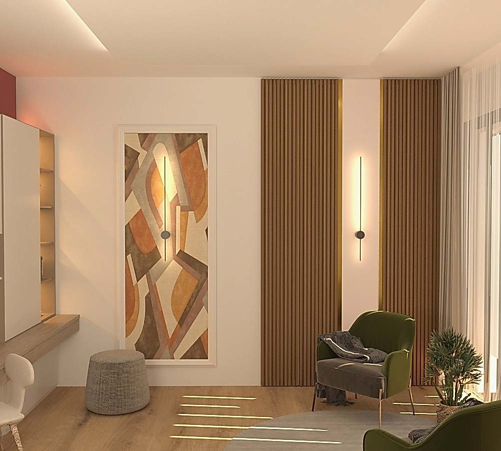 Çalışma odasında ise çıtalama çalışması devam ettirildi ve çıta içi duvar kağıdı uygulaması yapılarak diğer alanlarla uyum sağlandı. Bu alanda, özel olarak üretilmiş olan led aydınlatmalı nişli dolabın entegre olduğu, yüksek depolama hacmine sahip bir çalışma masası yer aldı. Böylece, çalışma alanı hem estetik hem de işlevsel açıdan mükemmel bir dengeye kavuştu.