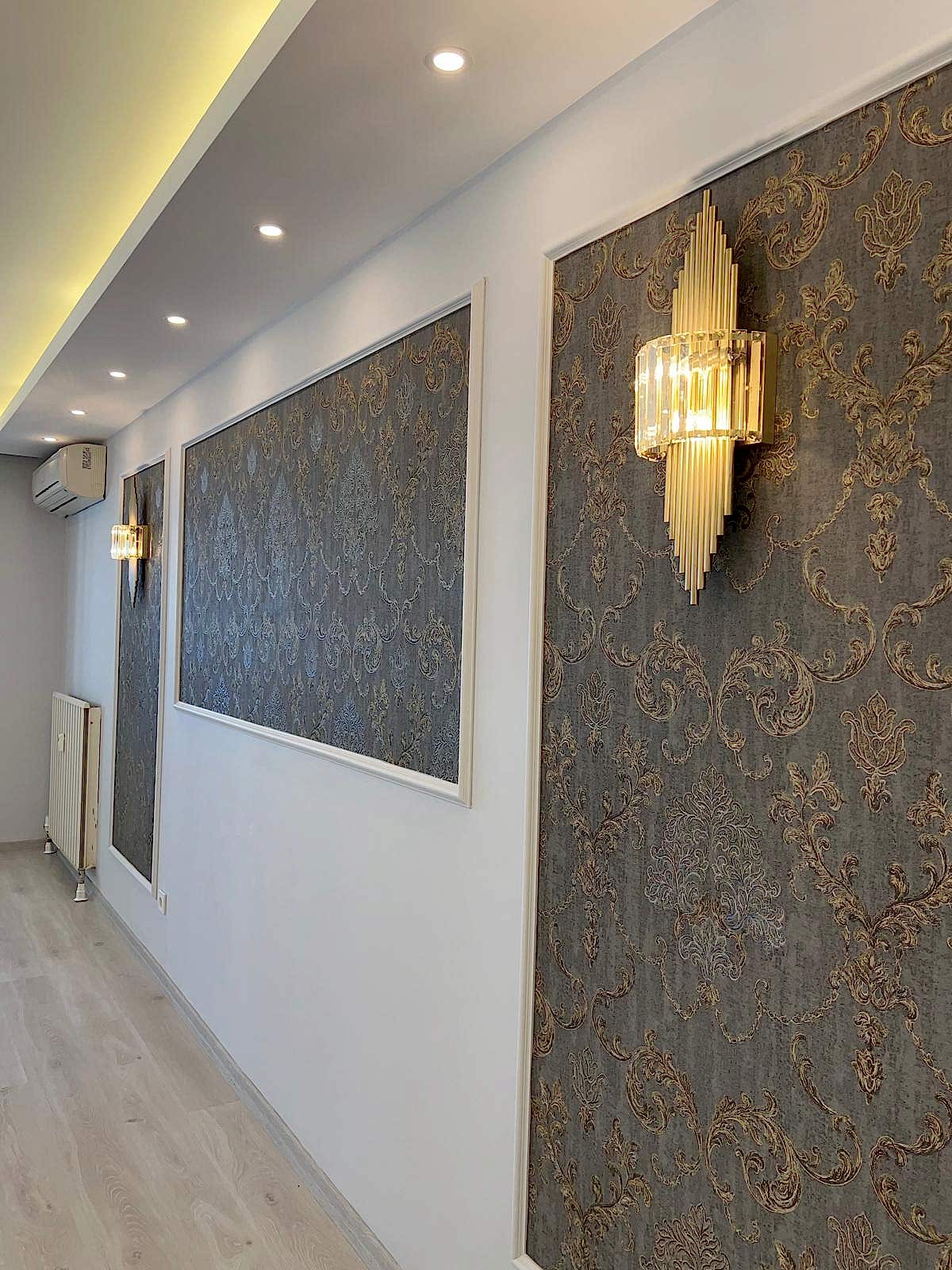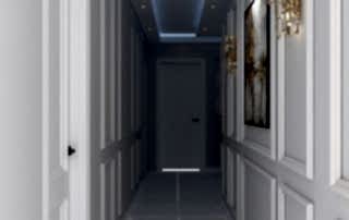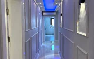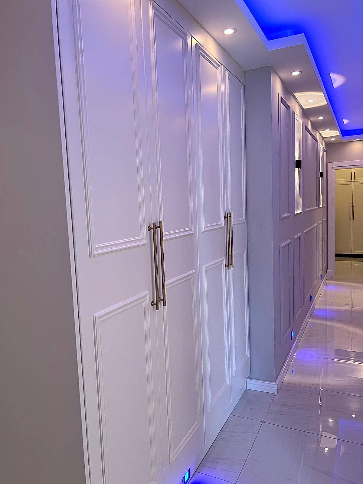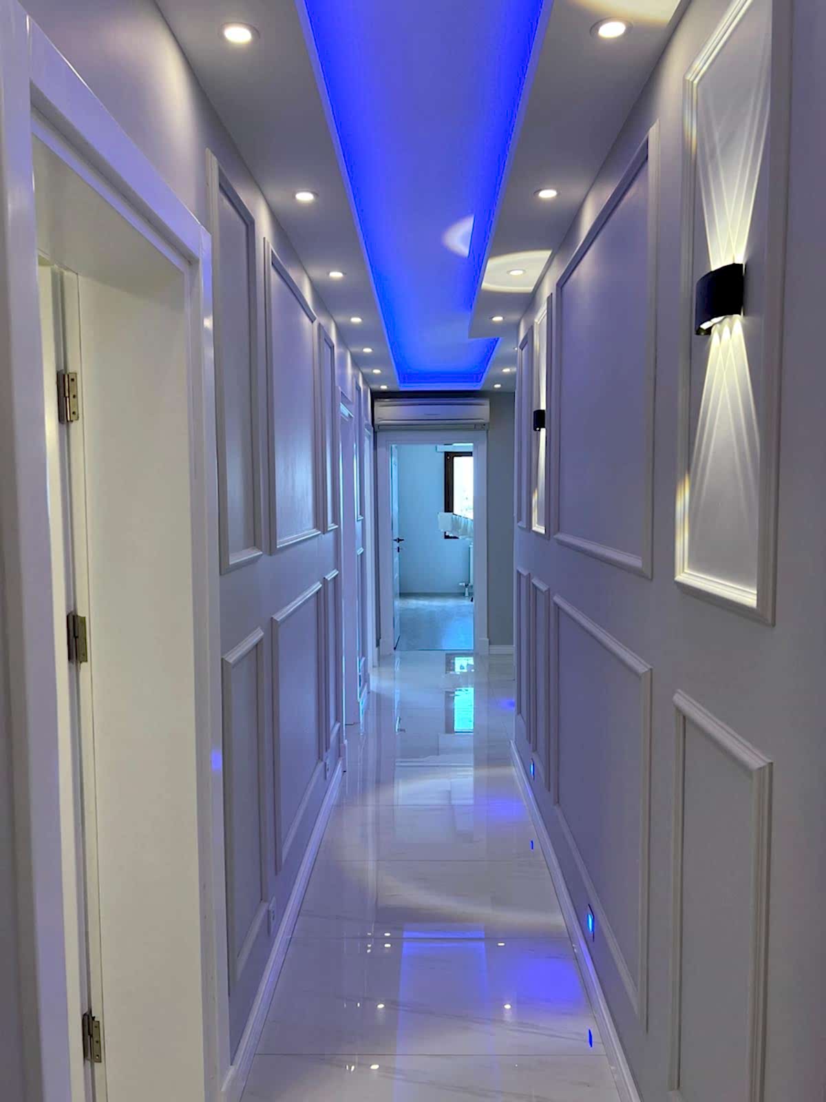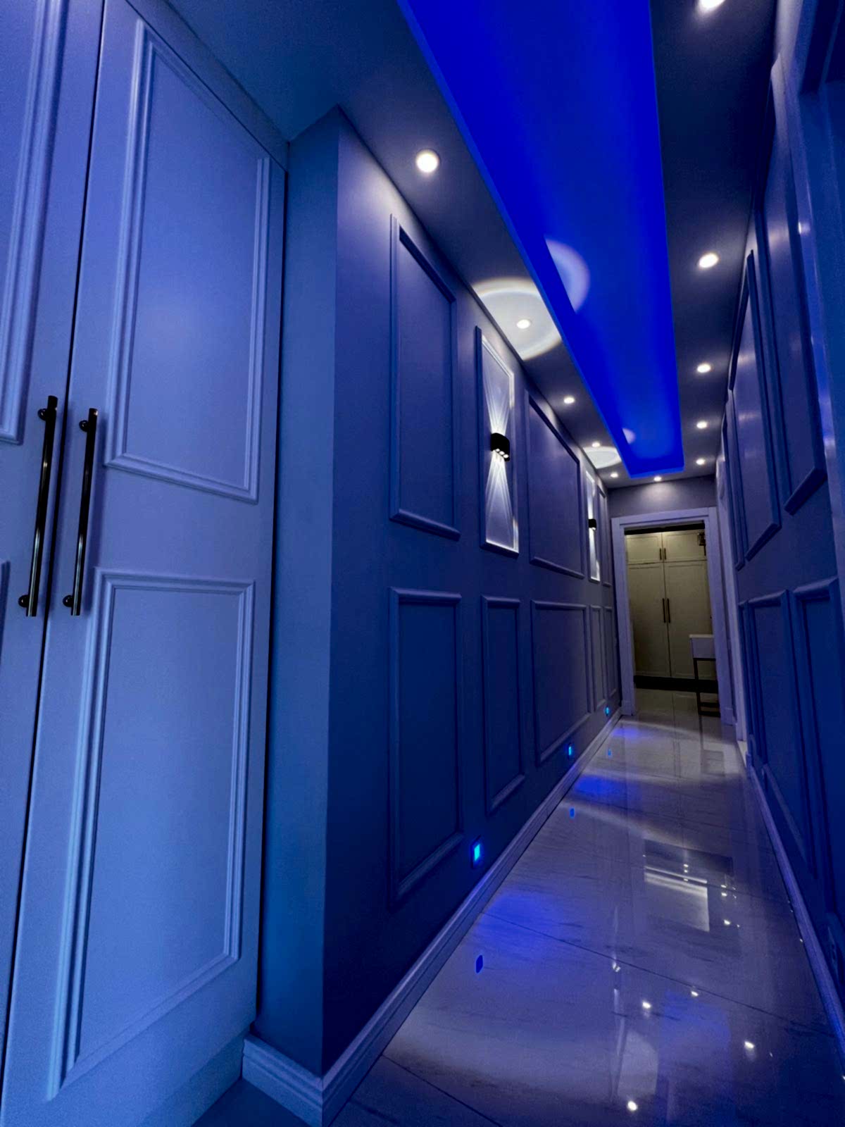 Koridor tavanında ve süpürgeliklerde, mavi renkli led aydınlatma detayları, müşterimizin isteği doğrultusunda tasarıma dahil edilerek, mekana modern bir atmosfer kazandırıldı. Aydınlık bir koridor yaratmak amacıyla, koridorun tasarımı apliklerle zenginleştirildi. Bu detaylar, alandaki ışık oyunlarını artırarak, daha geniş ve ferah bir izlenim sağladı.