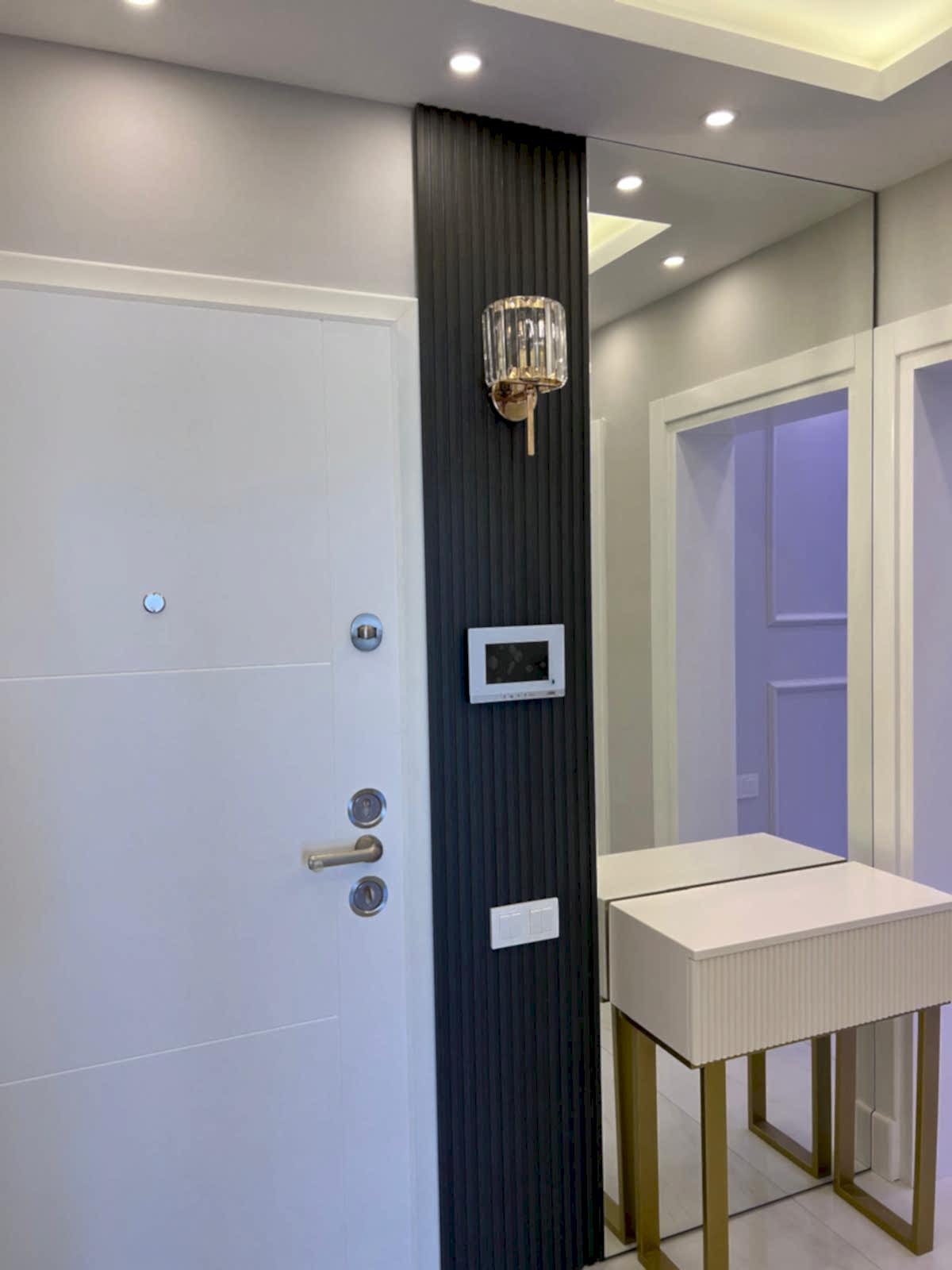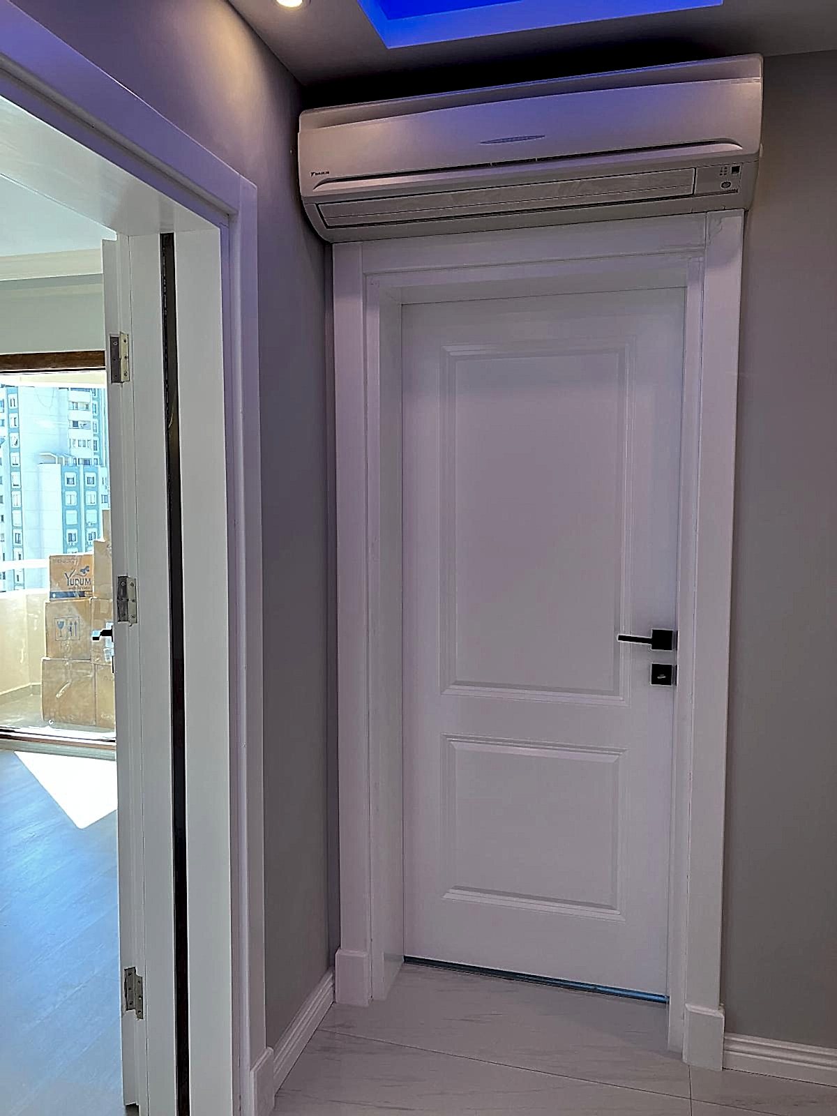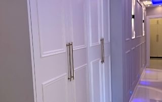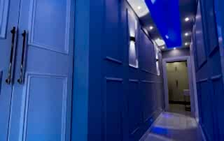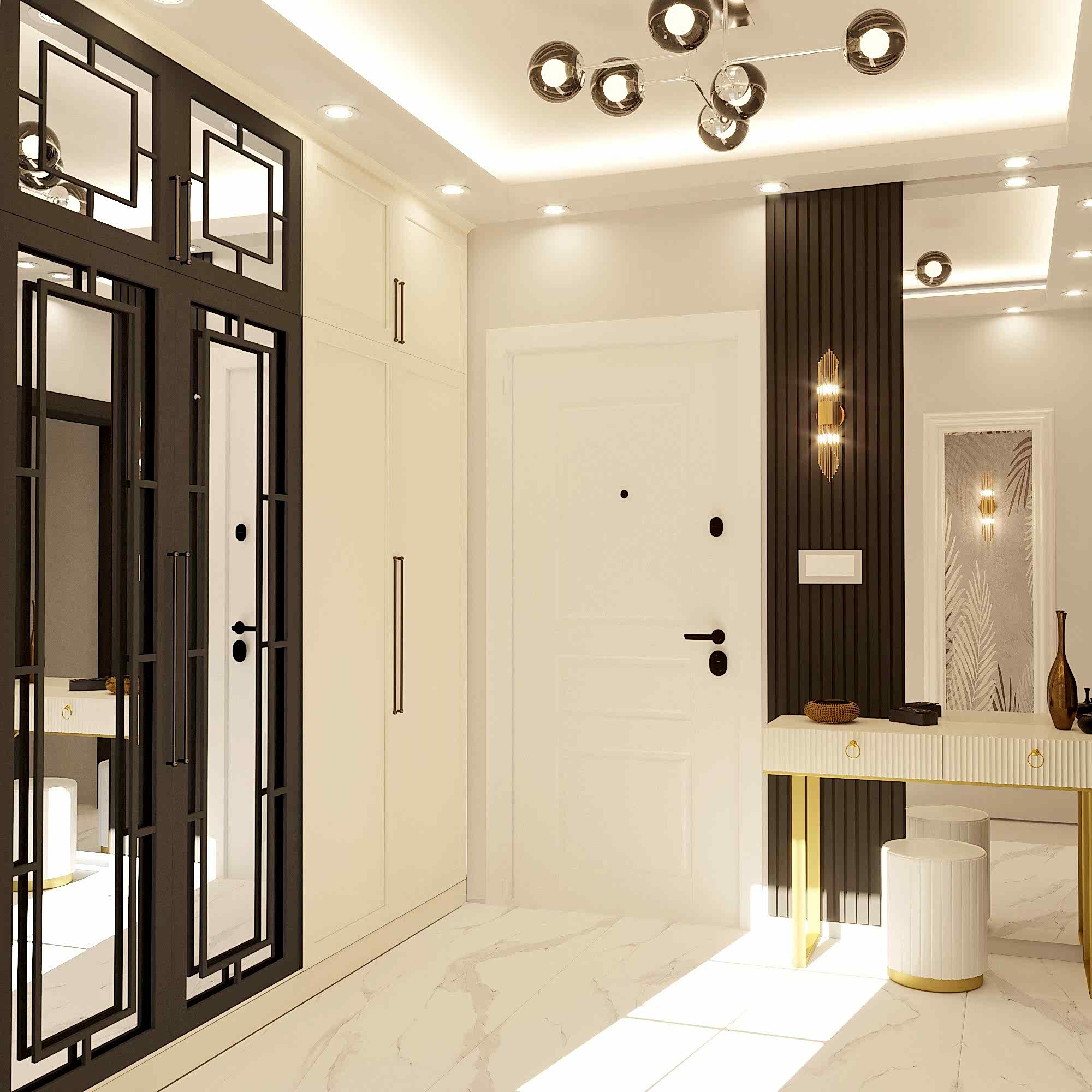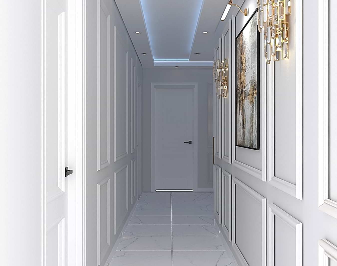 Koridor tavanında ve süpürgeliklerde, mavi renkli led aydınlatma detayları, müşterimizin isteği doğrultusunda tasarıma dahil edilerek, mekana modern bir atmosfer kazandırıldı. Aydınlık bir koridor yaratmak amacıyla, koridorun tasarımı apliklerle zenginleştirildi. Bu detaylar, alandaki ışık oyunlarını artırarak, daha geniş ve ferah bir izlenim sağladı.