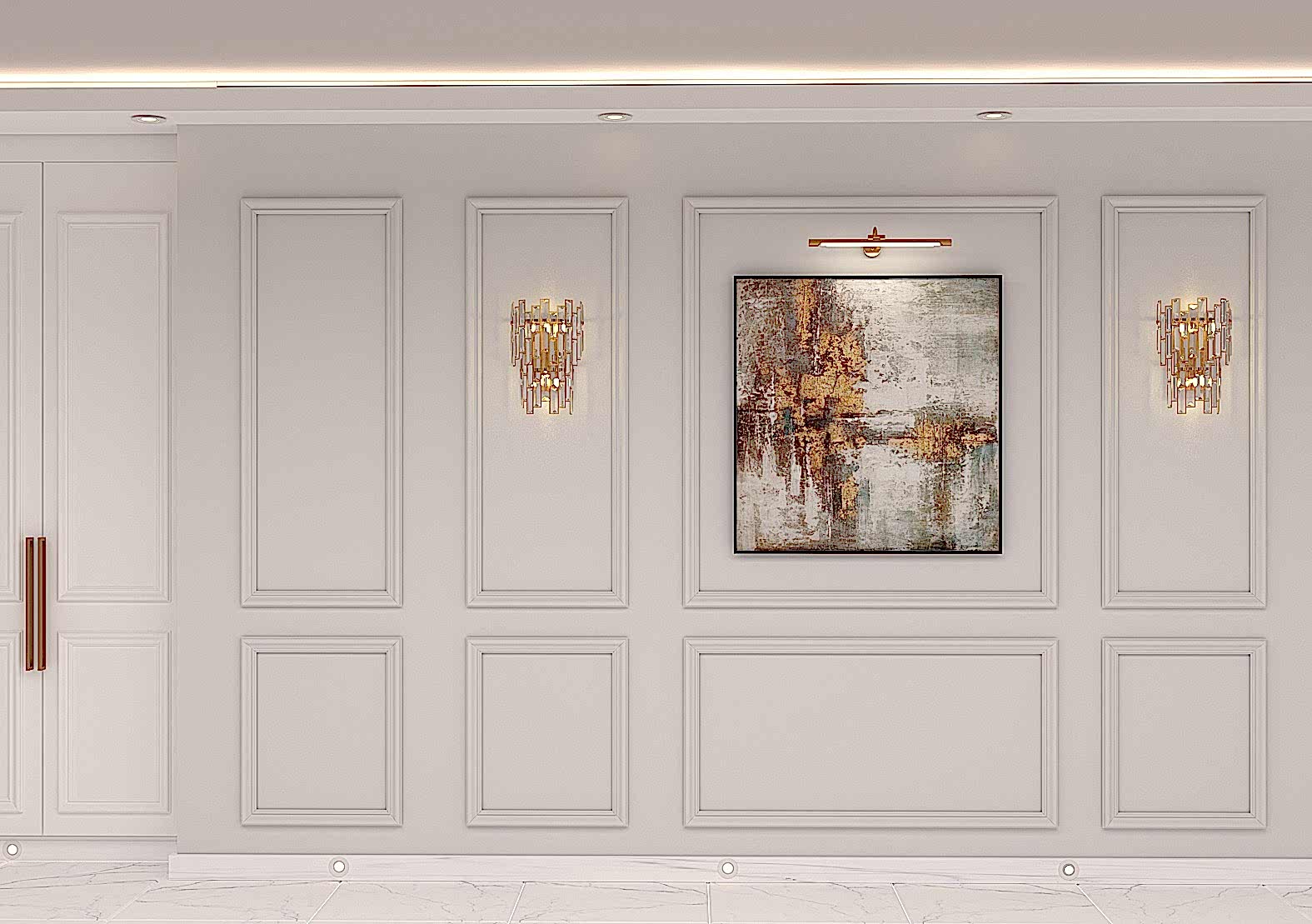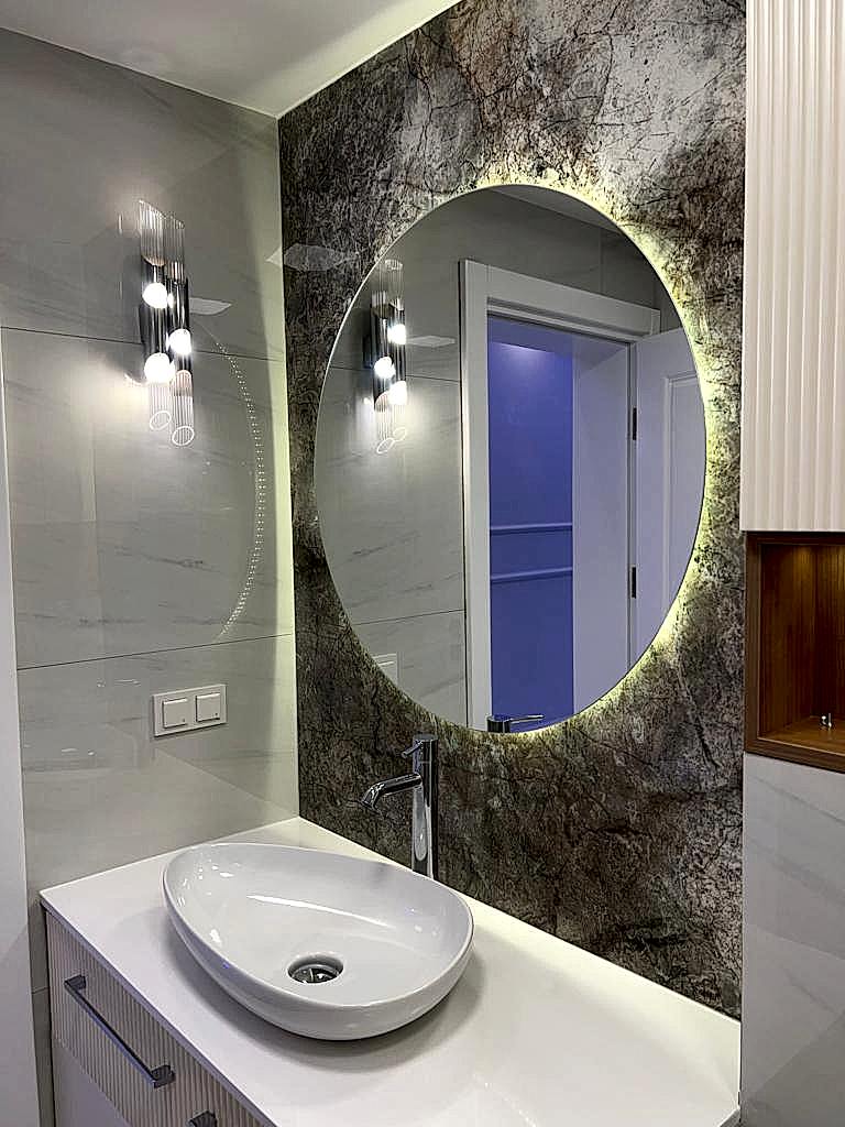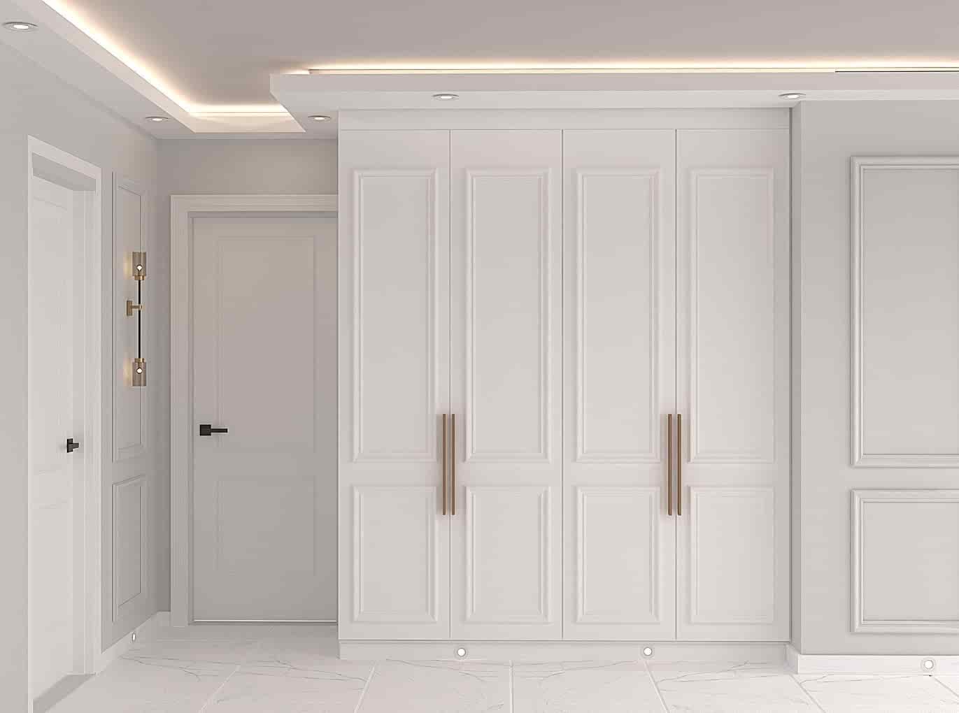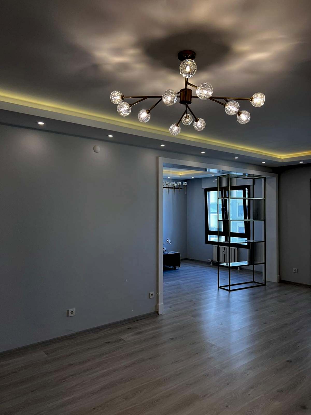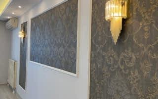 Koridor tavanında ve süpürgeliklerde, mavi renkli led aydınlatma detayları, müşterimizin isteği doğrultusunda tasarıma dahil edilerek, mekana modern bir atmosfer kazandırıldı. Aydınlık bir koridor yaratmak amacıyla, koridorun tasarımı apliklerle zenginleştirildi. Bu detaylar, alandaki ışık oyunlarını artırarak, daha geniş ve ferah bir izlenim sağladı.