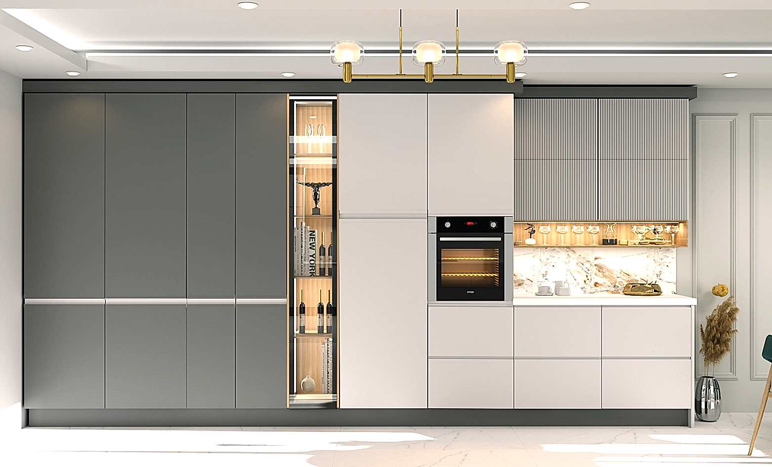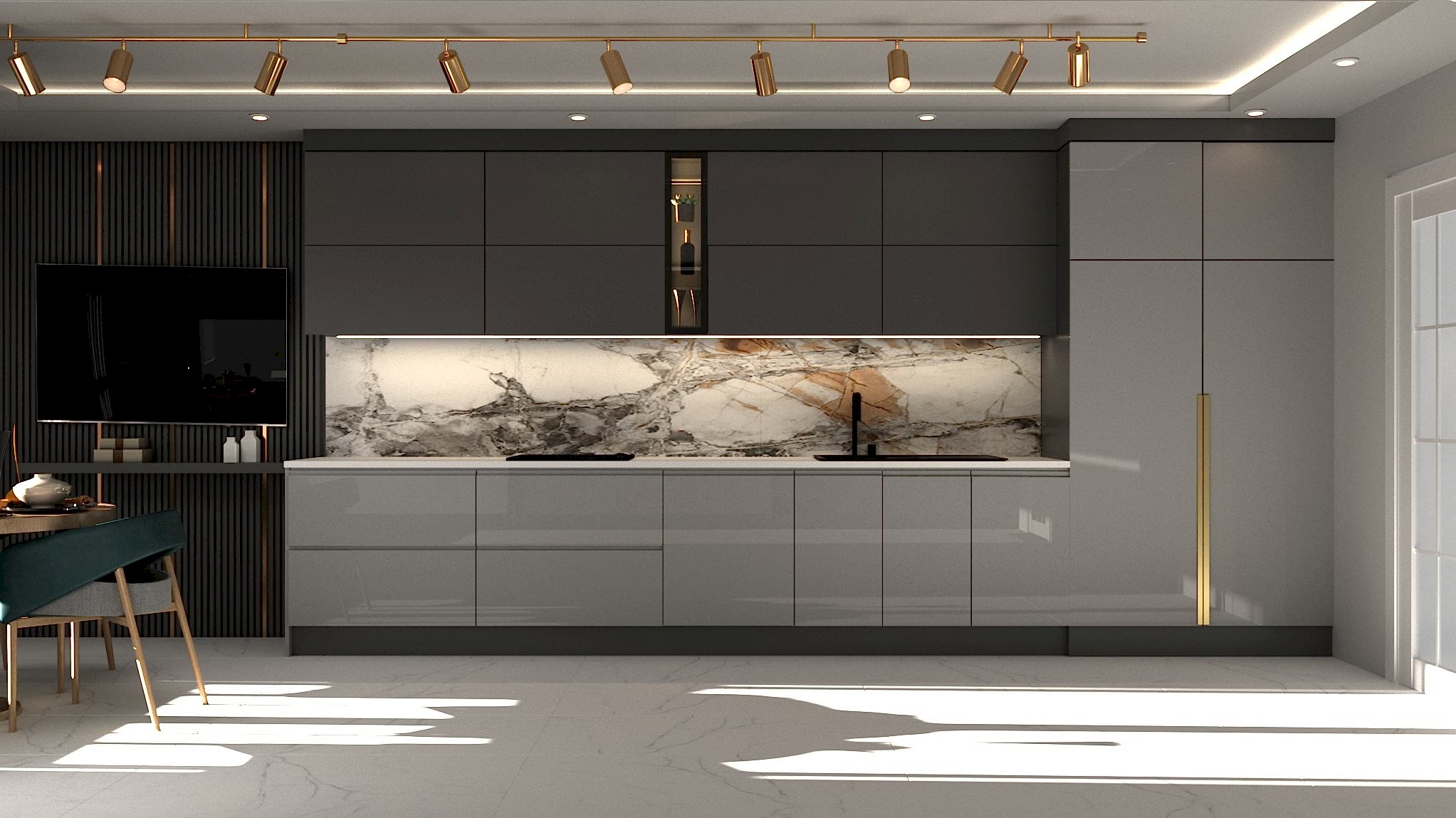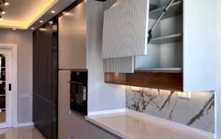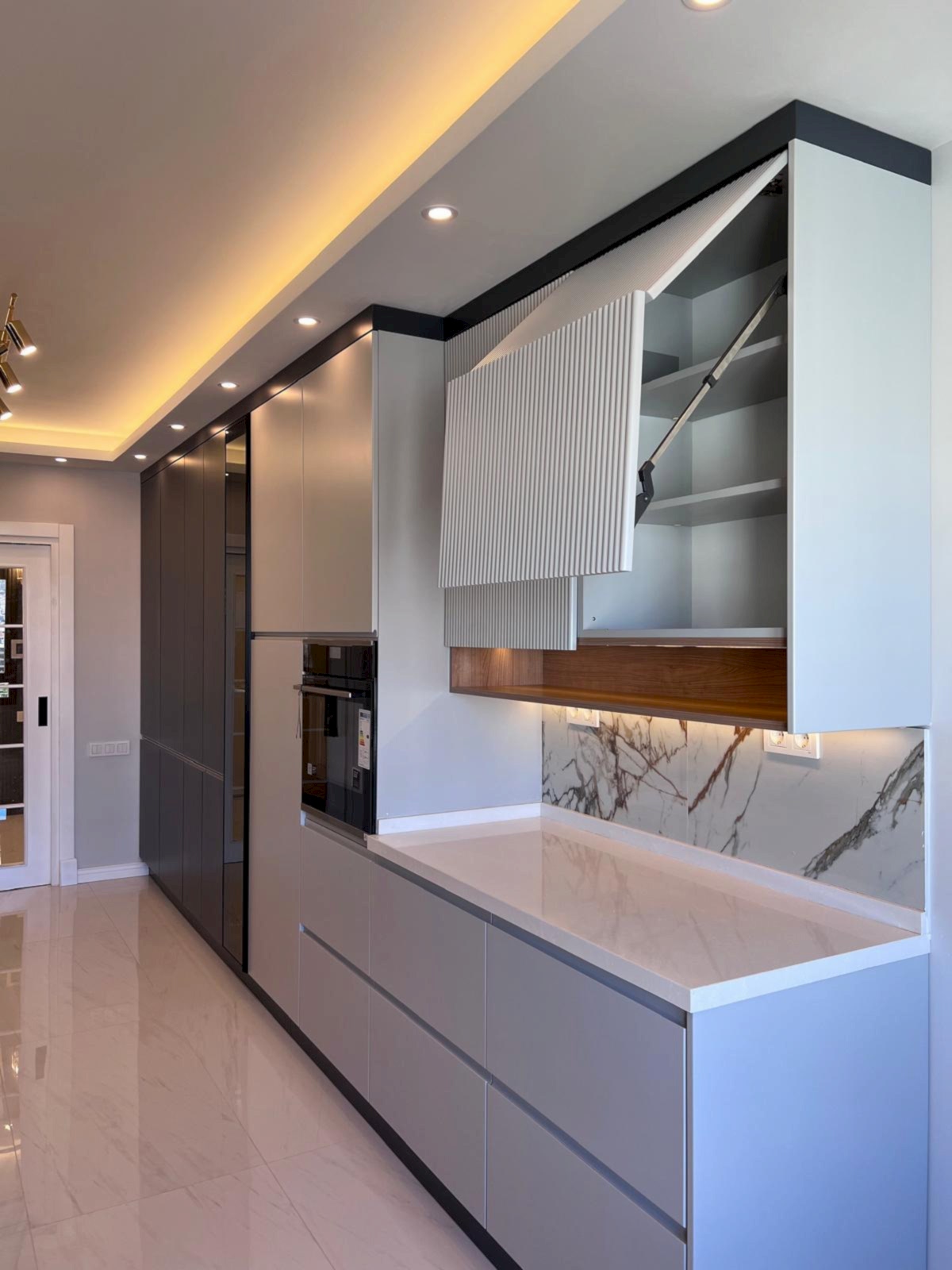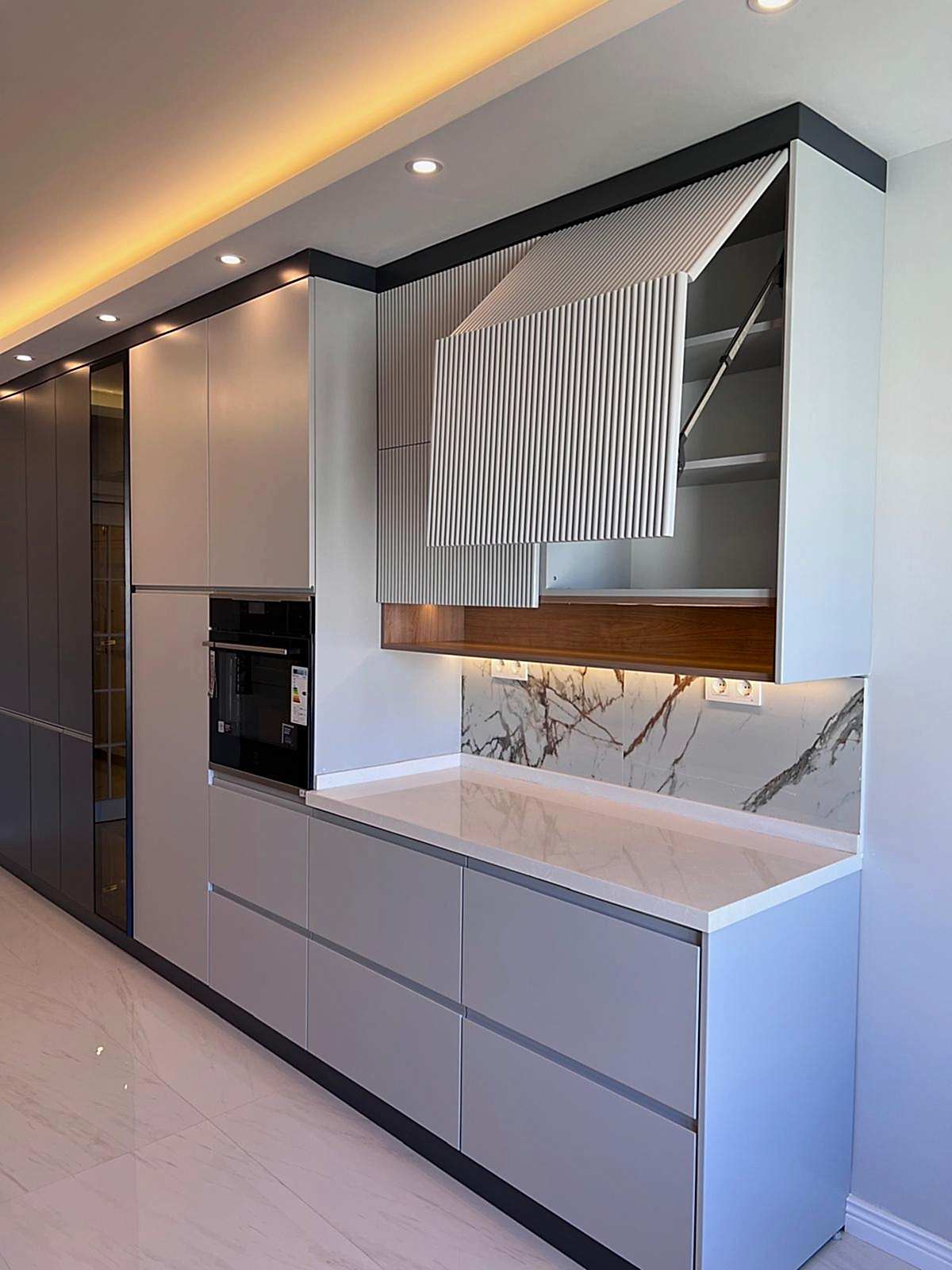 Mutfak tasarımında, özel mekanizmalarla donatılmış, boy depolama alanlarına sahip dolaplar kullanıldı. Dolaplar, düz kapak ve fugalı detaylarla sade ancak şık bir tasarımla şekillendirildi. Bu tasarım, mutfakta işlevselliği artırırken aynı zamanda estetik açıdan da bütünlük sağladı.