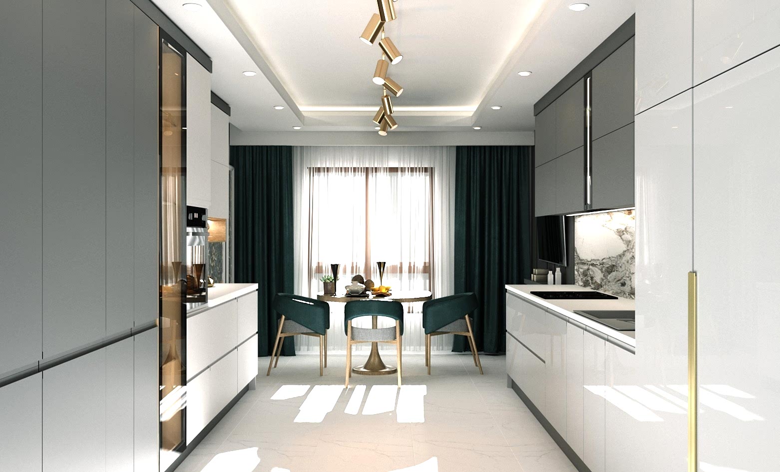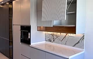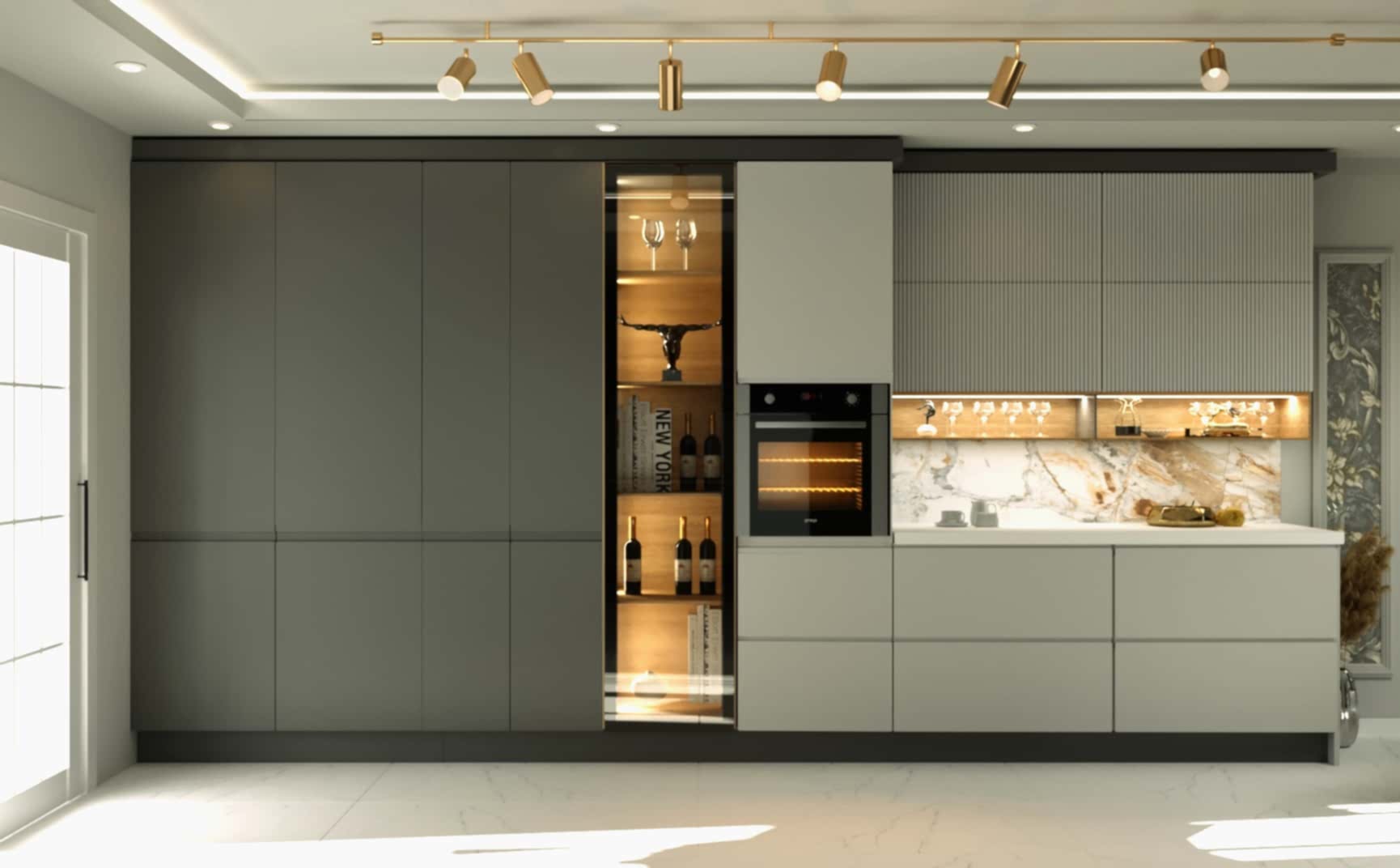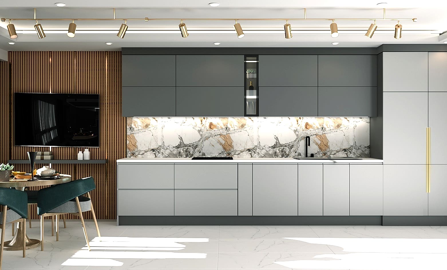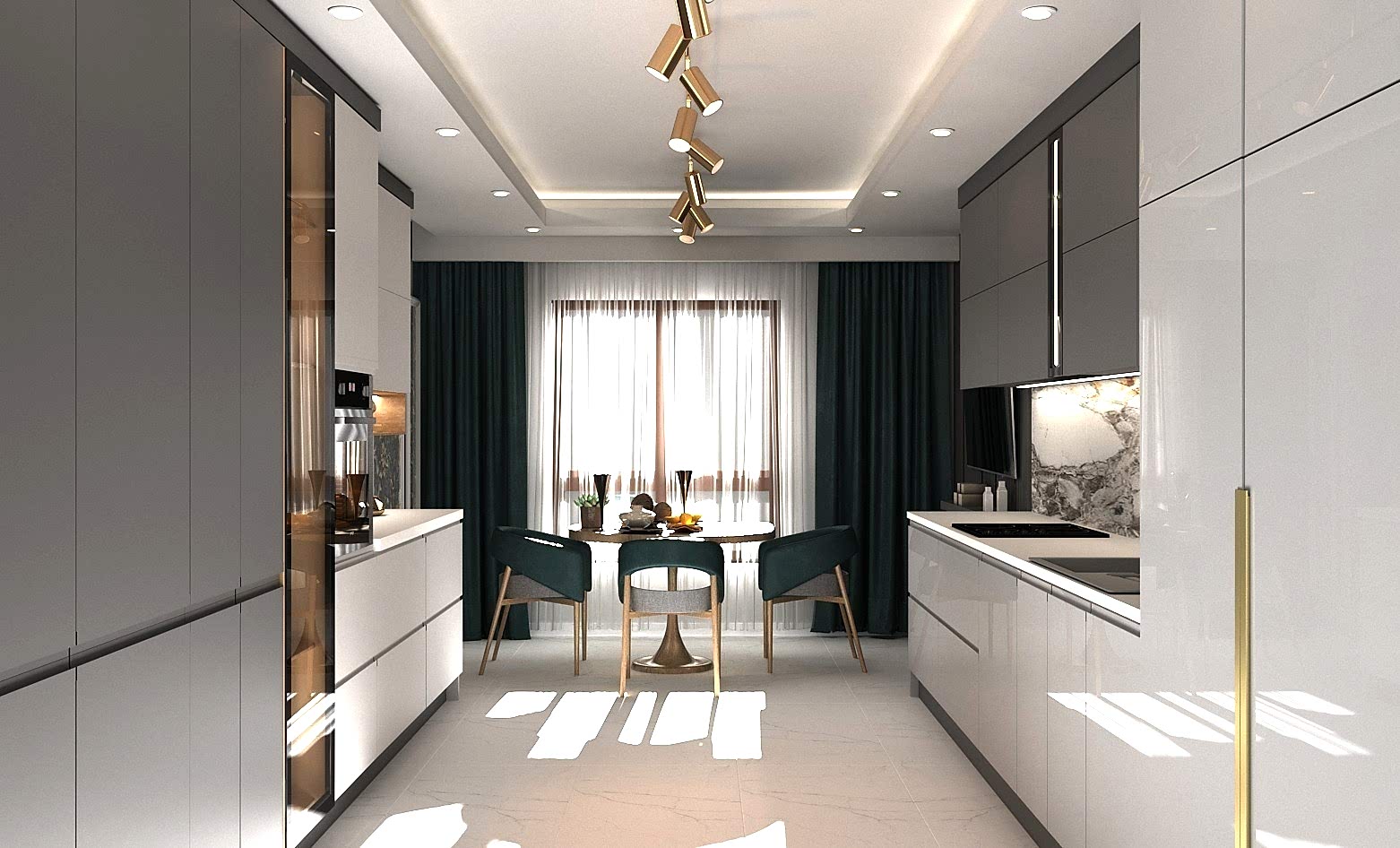 Mutfak tasarımında, özel mekanizmalarla donatılmış, boy depolama alanlarına sahip dolaplar kullanıldı. Dolaplar, düz kapak ve fugalı detaylarla sade ancak şık bir tasarımla şekillendirildi. Bu tasarım, mutfakta işlevselliği artırırken aynı zamanda estetik açıdan da bütünlük sağladı.