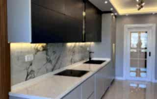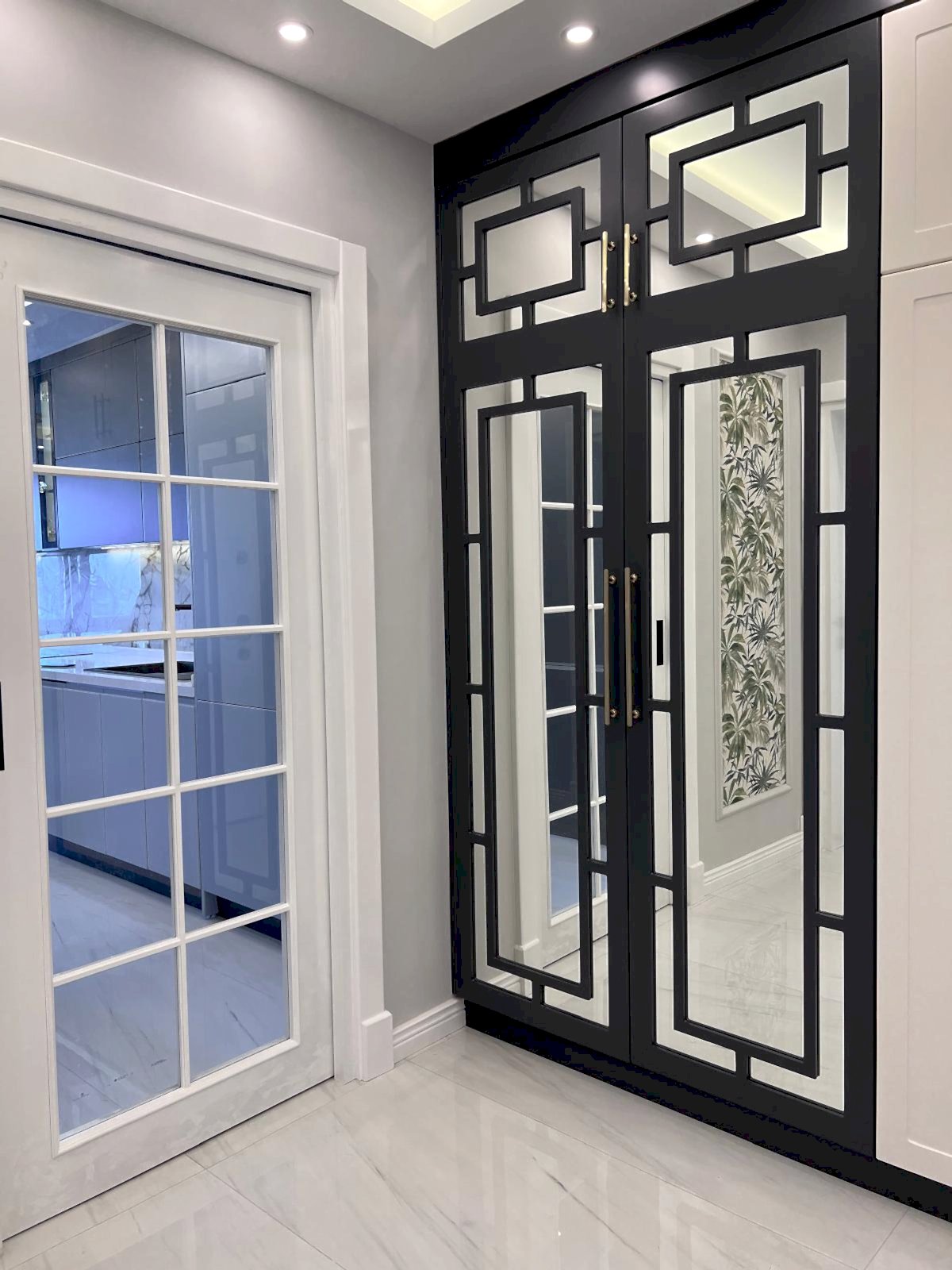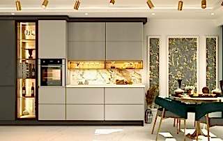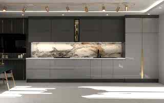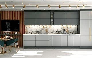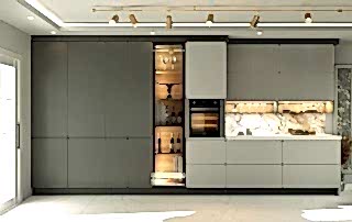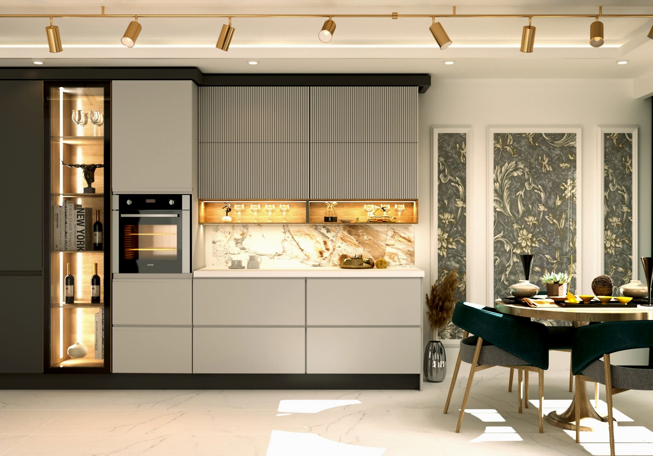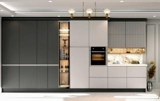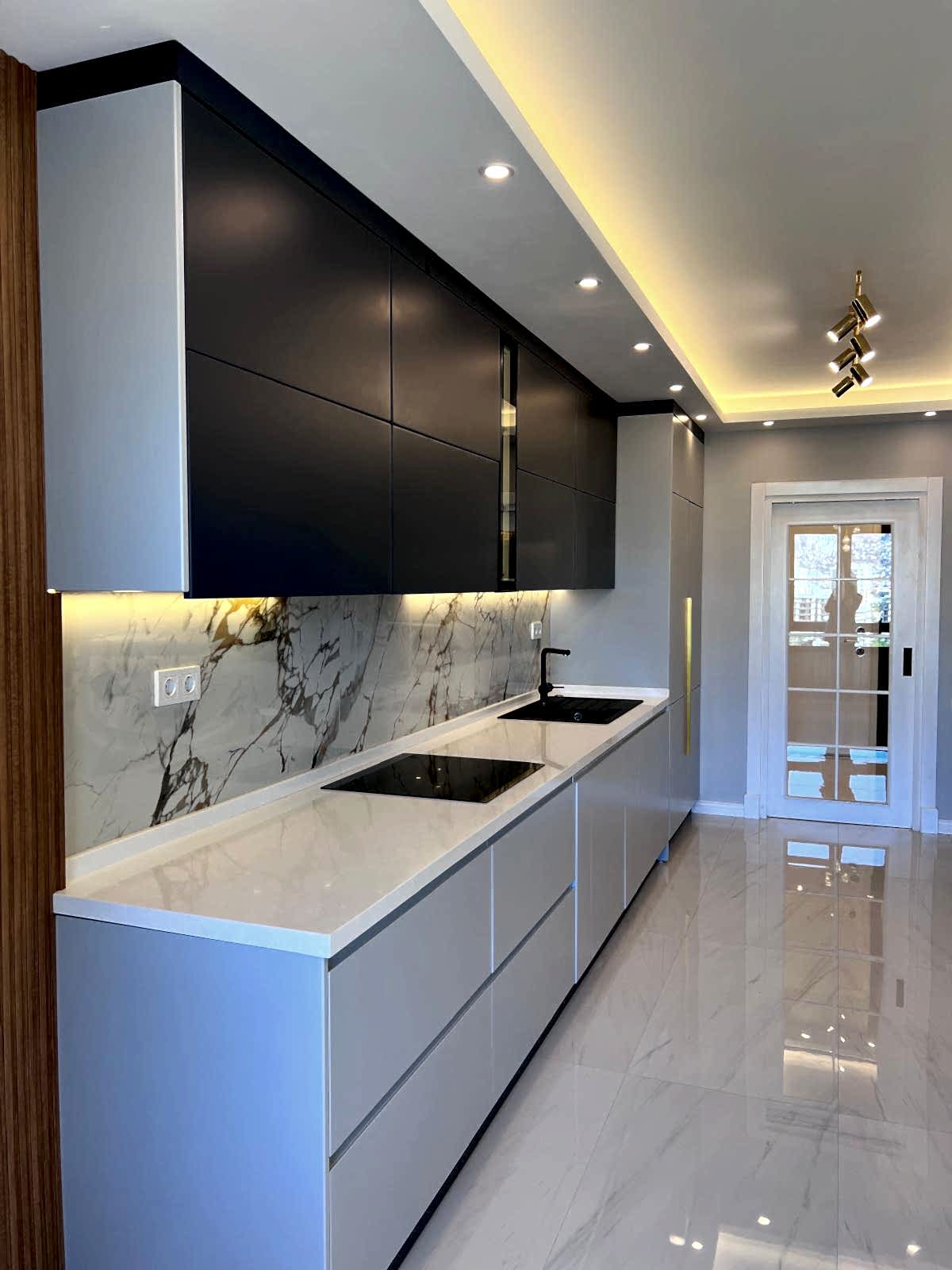 Mutfak tasarımında, özel mekanizmalarla donatılmış, boy depolama alanlarına sahip dolaplar kullanıldı. Dolaplar, düz kapak ve fugalı detaylarla sade ancak şık bir tasarımla şekillendirildi. Bu tasarım, mutfakta işlevselliği artırırken aynı zamanda estetik açıdan da bütünlük sağladı.