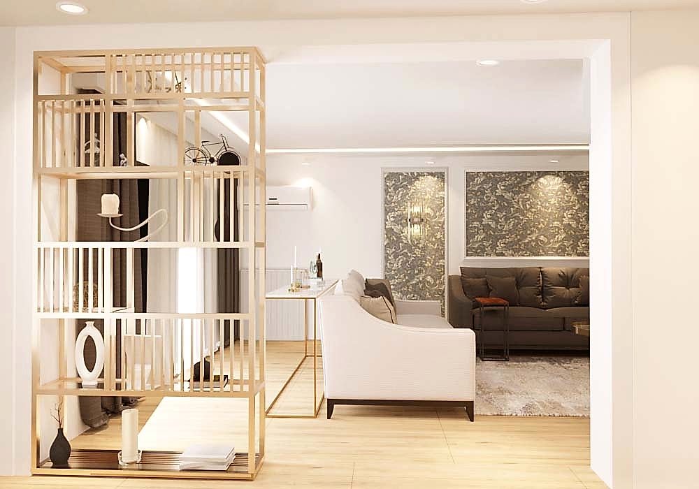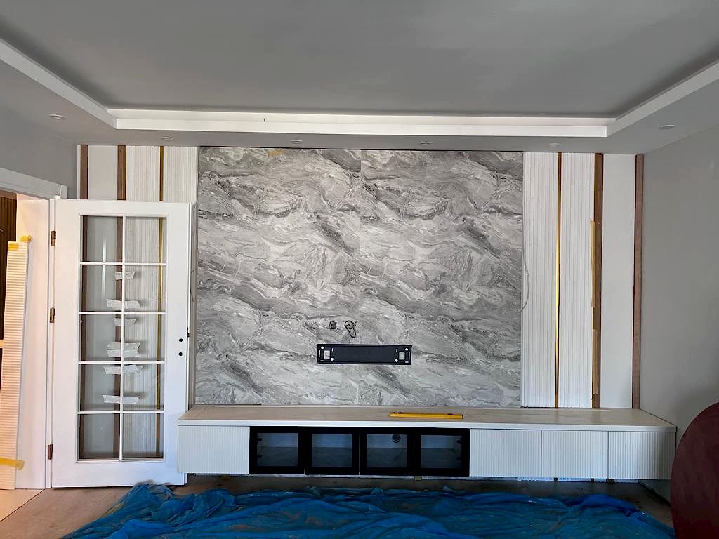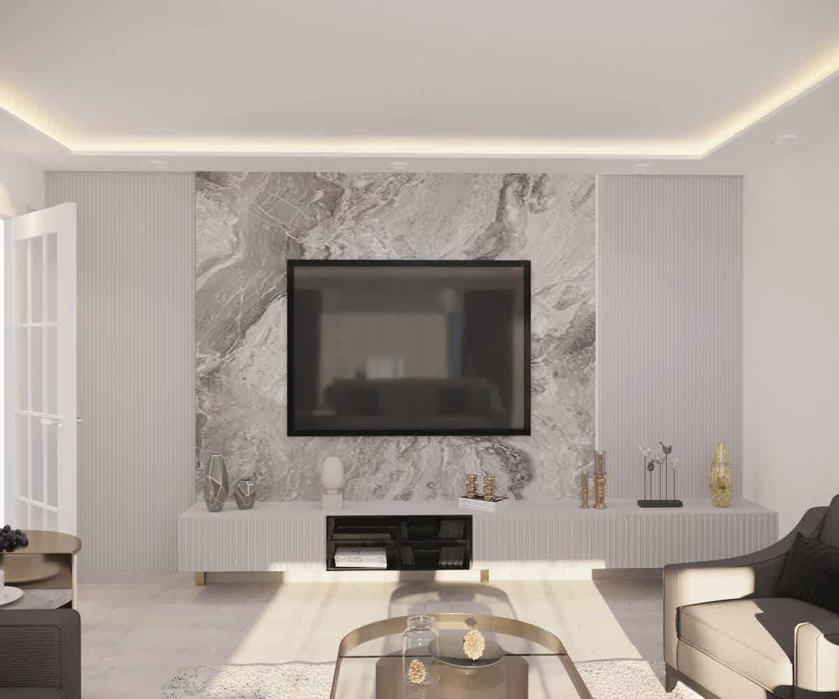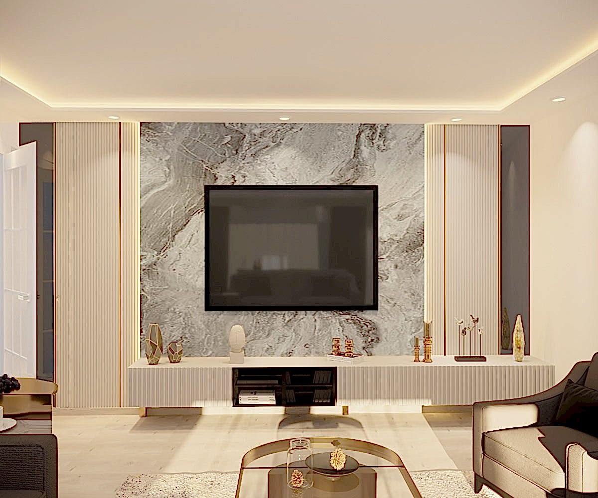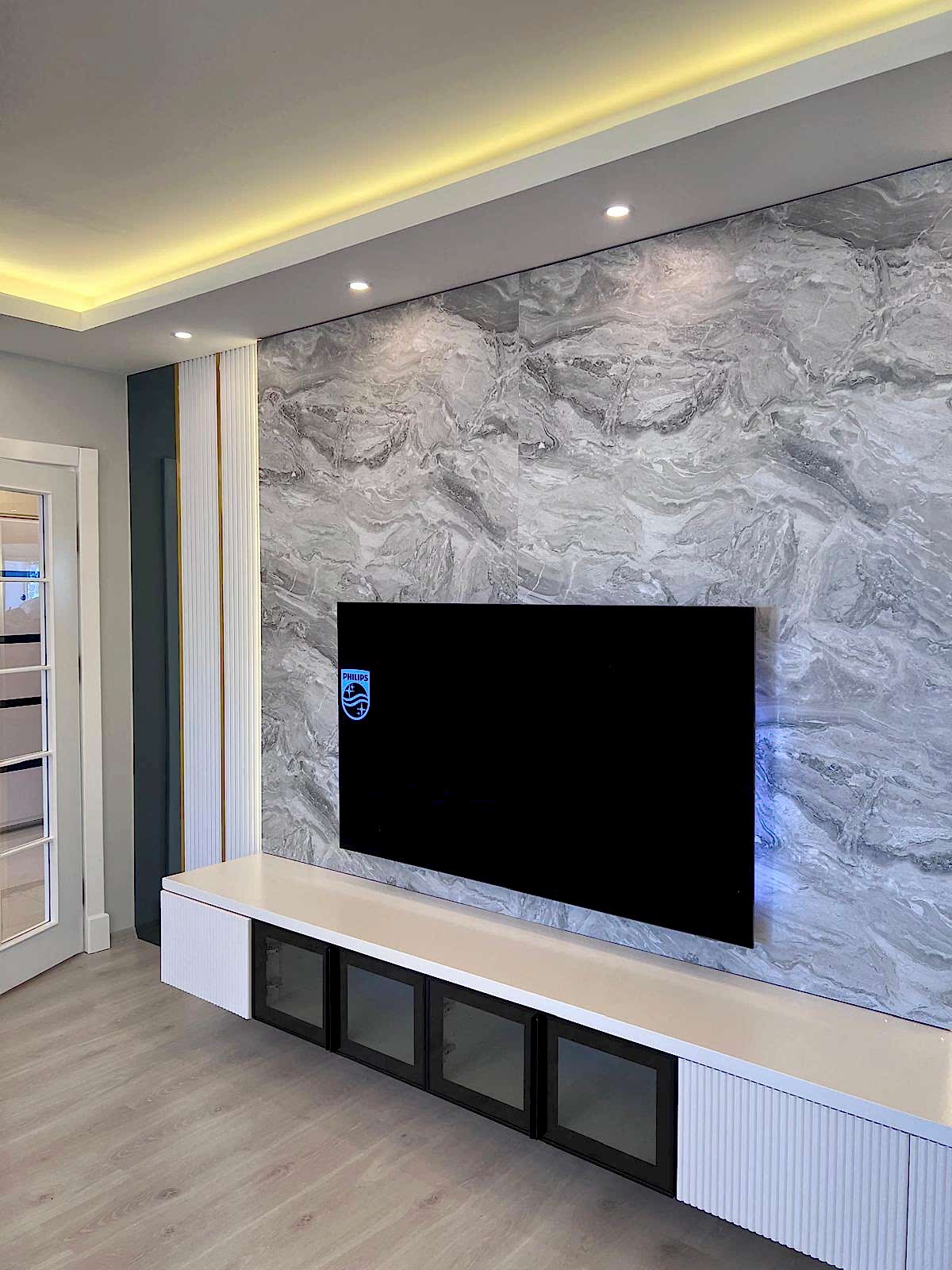 Salonda, TV duvarında yalın bir tasarım çizgisi benimsendi. Nötr ve beyaz tonlarının hakim olduğu bu tasarımda, camlı ve fugalı kapaklı bir TV konsolu tercih edildi. Duvar, led aydınlatmalı panellerle desteklenerek sade ancak etkileyici bir atmosfer yaratıldı. Salonun çıta içlerinde, müşterimizin seçmiş olduğu duvar kağıdı uygulaması yapıldı ve beyazın soğukluğunu kırarak mekana sıcak bir hava kazandırıldı. Oturma alanı ve yemek alanı, raflı bir seperatör ile ayrıldı. Bu seperatör, her iki mekanın tasarım bütünlüğünü sağlarken, aynı zamanda zarif bir geçiş alanı sundu.