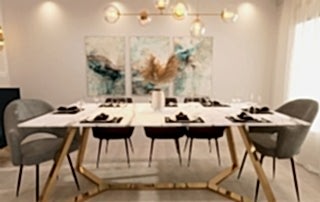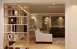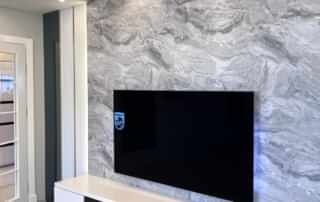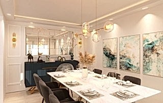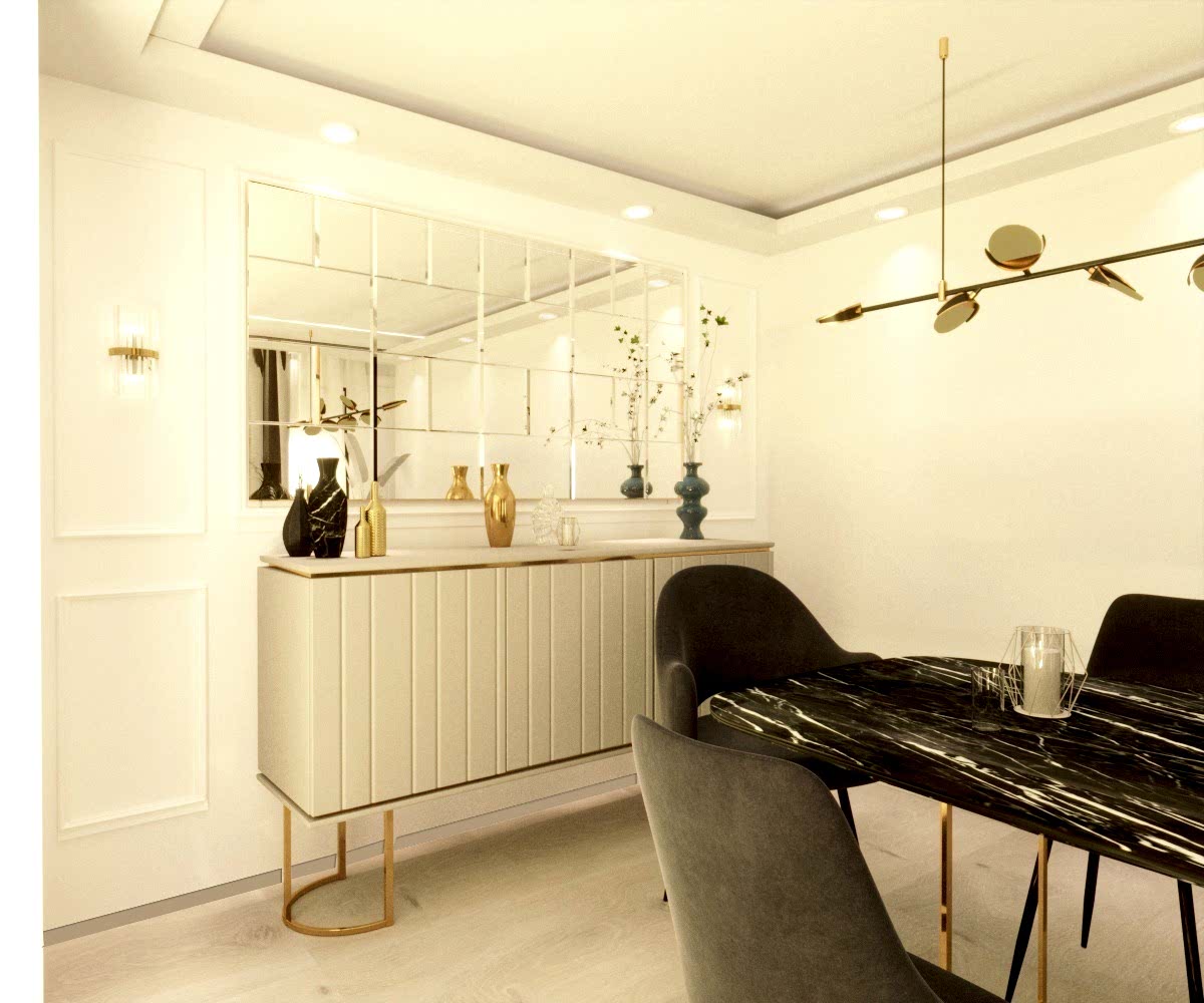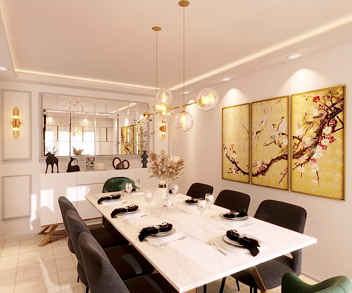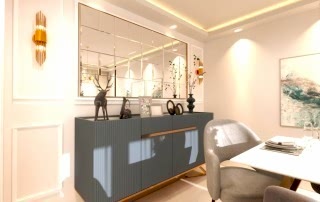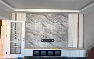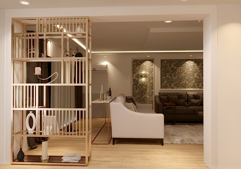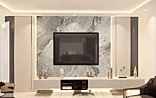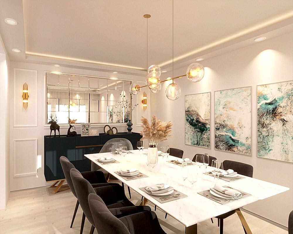 Salonda, TV duvarında yalın bir tasarım çizgisi benimsendi. Nötr ve beyaz tonlarının hakim olduğu bu tasarımda, camlı ve fugalı kapaklı bir TV konsolu tercih edildi. Duvar, led aydınlatmalı panellerle desteklenerek sade ancak etkileyici bir atmosfer yaratıldı. Salonun çıta içlerinde, müşterimizin seçmiş olduğu duvar kağıdı uygulaması yapıldı ve beyazın soğukluğunu kırarak mekana sıcak bir hava kazandırıldı. Oturma alanı ve yemek alanı, raflı bir seperatör ile ayrıldı. Bu seperatör, her iki mekanın tasarım bütünlüğünü sağlarken, aynı zamanda zarif bir geçiş alanı sundu.