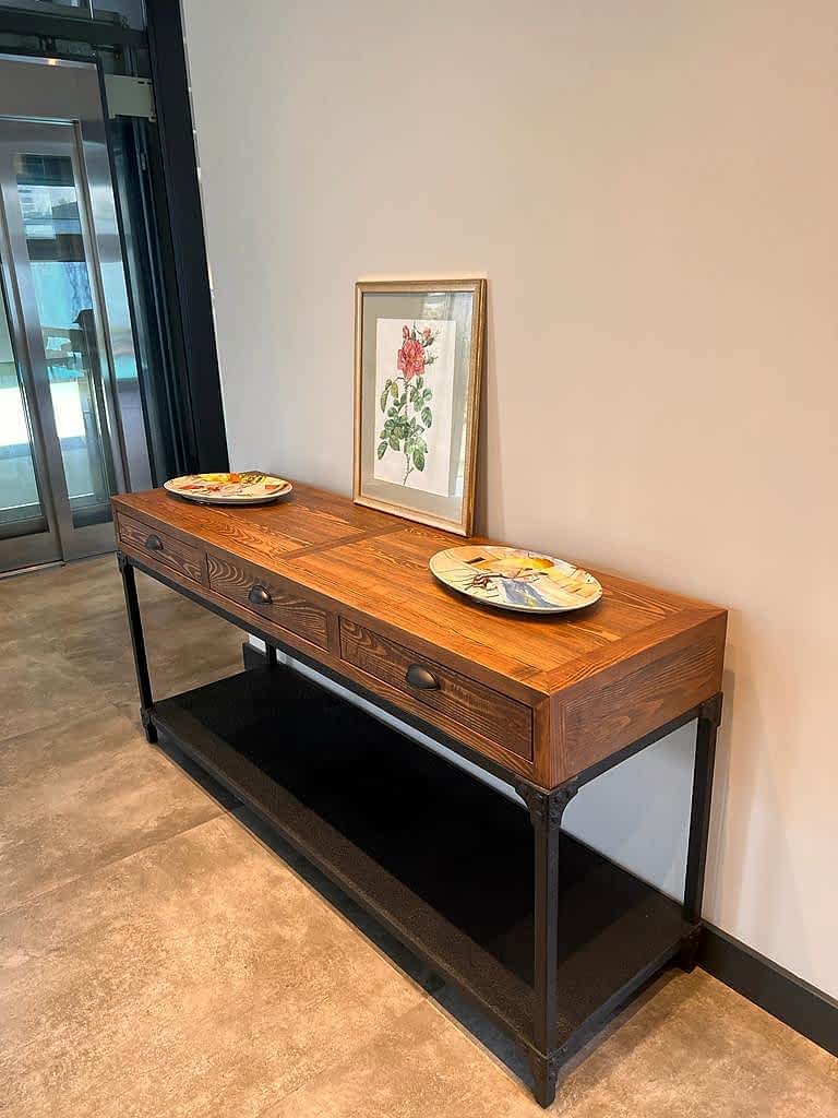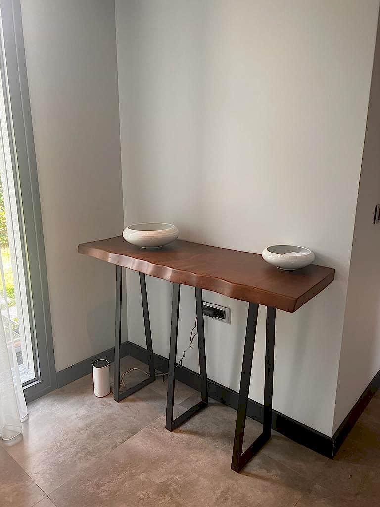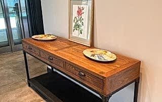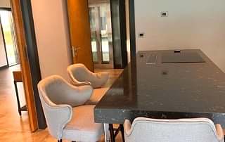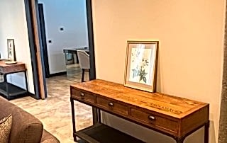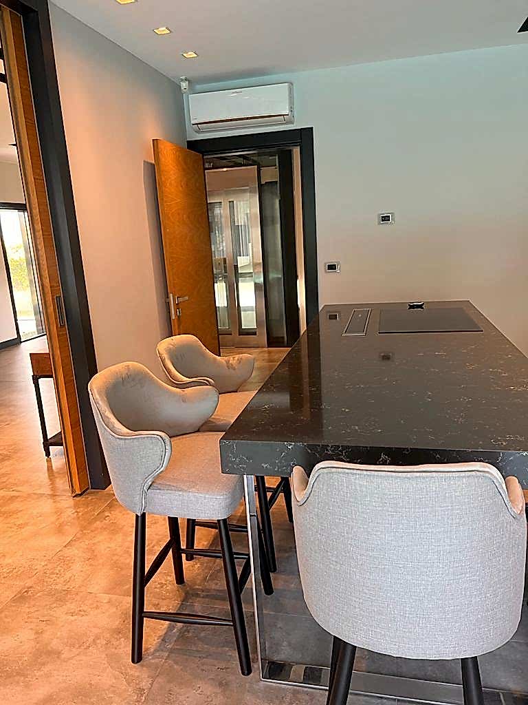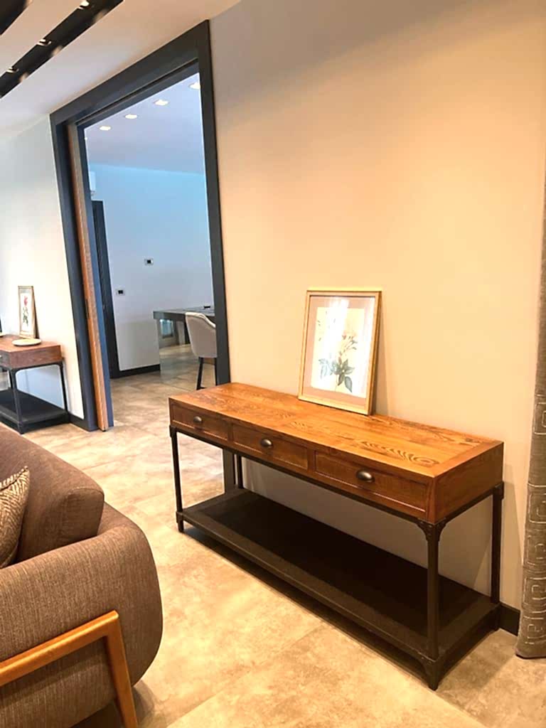 Villa antre kısmı, doğrudan salonun içinde yer aldığı için, hem estetik hem de fonksiyonel açıdan özel bir tasarım yapıldı. Antreye yönelik olarak, salona entegre edilen bir dresuar tasarlandı. Bu dresuar, hem konsol görevi görmekte hem de diğer tasarım unsurlarıyla uyumlu olacak şekilde, malzemeleri özenle seçilerek tasarlandı. Böylece giriş alanı, sade fakat şık bir biçimde tamamlandı.