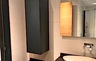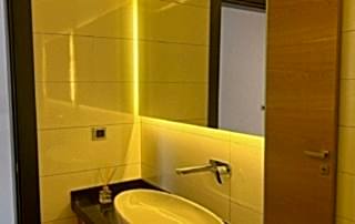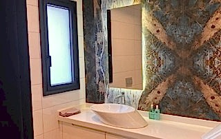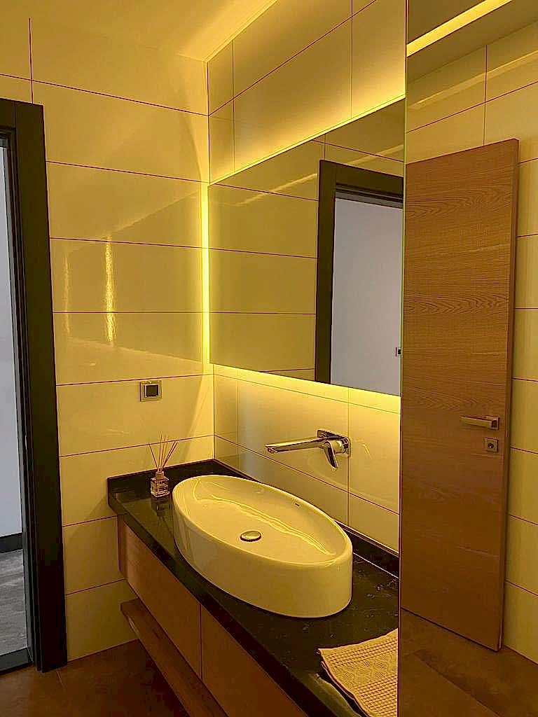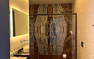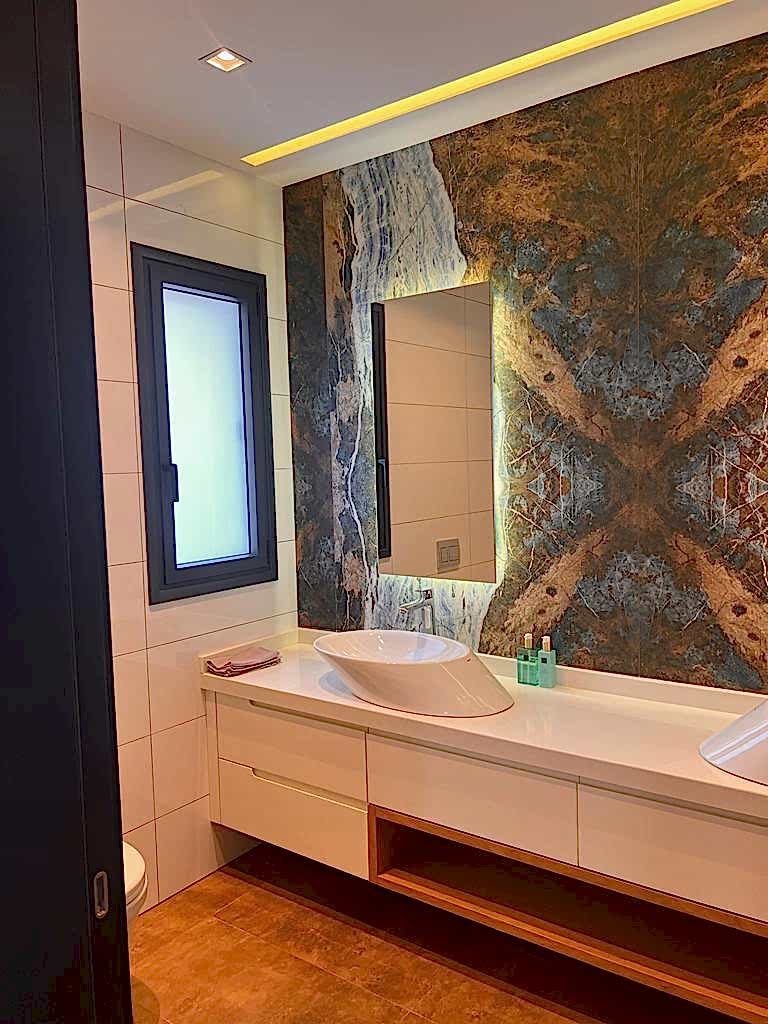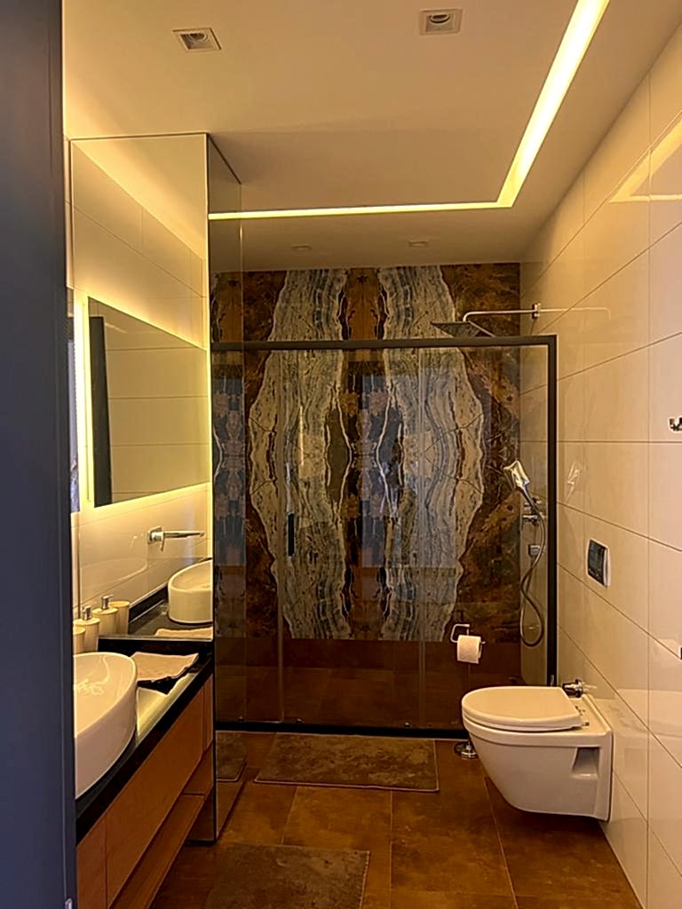 Banyolarda ise sade bir tasarım dili benimsendi. Özellikle duş alanlarında kullanılan bookmatch seramikler, banyolara modern bir hava kazandırarak, mekânı daha ferah ve şık hale getirdi. Hilton lavabo tasarımları, depolama alanlarına işlevsel katkı sağlarken, genel tasarımla uyum gösterdi.