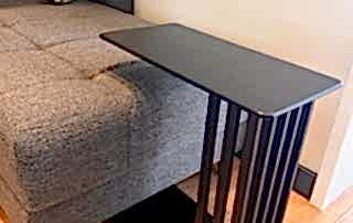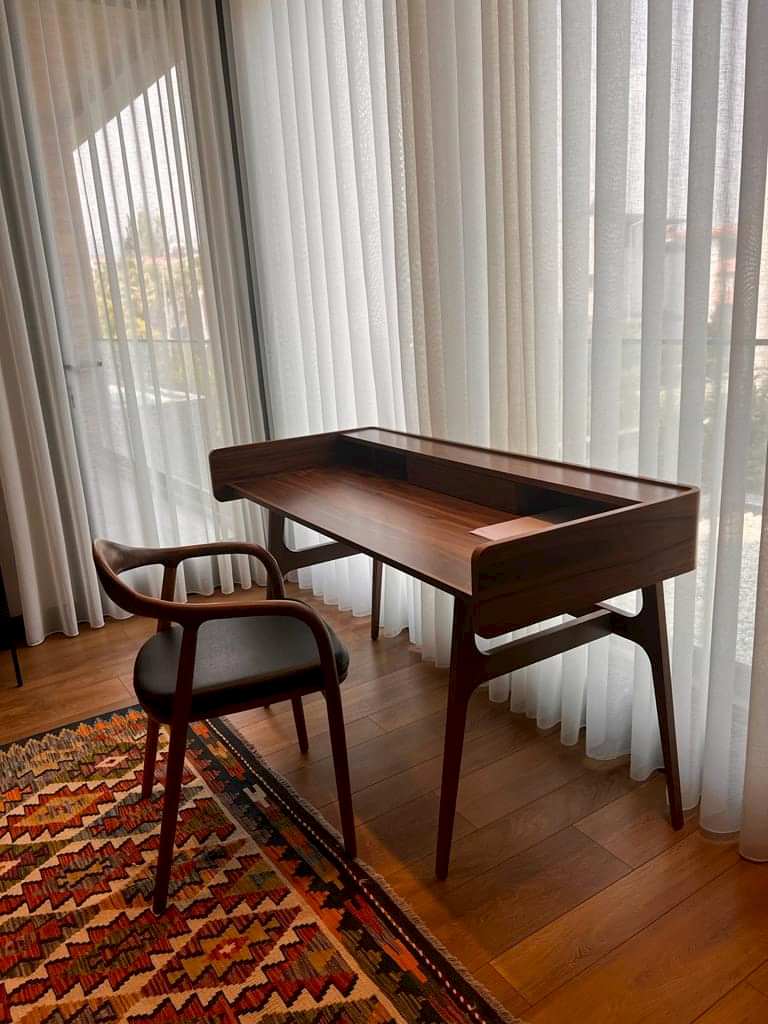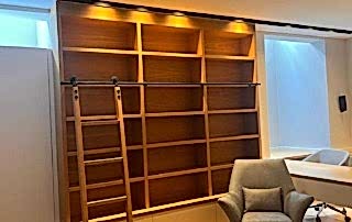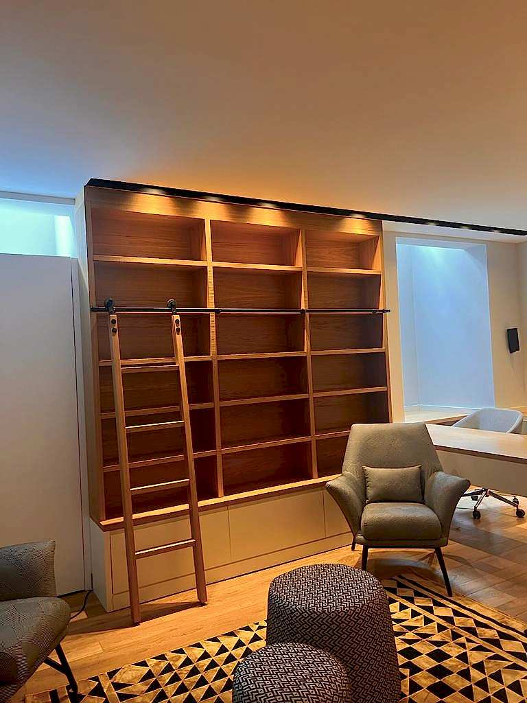 Hobi ve çalışma odasında, günlük yaşamı kolaylaştıracak detaylar ön plana çıkarıldı. Üst raflara kolay erişim sağlamak amacıyla kitaplık tasarımına sürgülü bir merdiven entegre edildi. Ayrıca, çalışma masası da tasarımın genel diline uygun olarak fonksiyonel ve estetik bir şekilde hazırlandı. Bu sayede, hem çalışma hem de hobi alanı, kullanışlı ve estetik açıdan tatmin edici bir hale getirildi.
