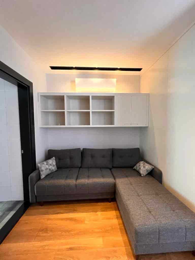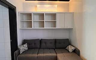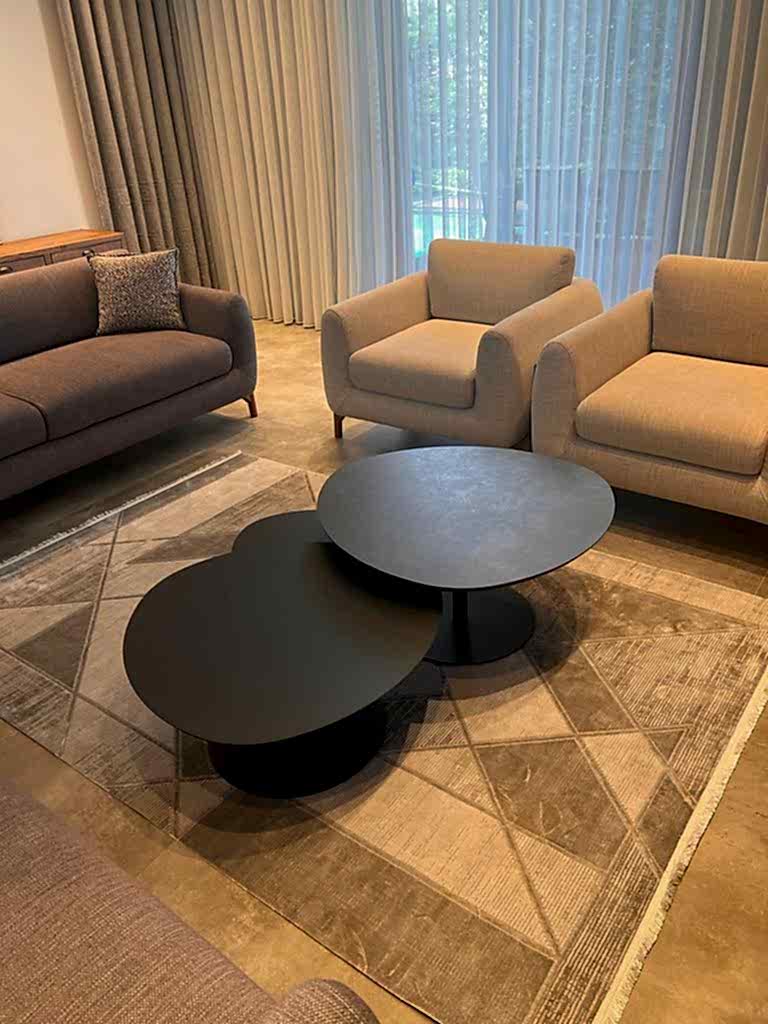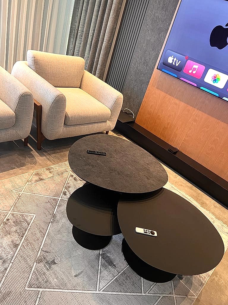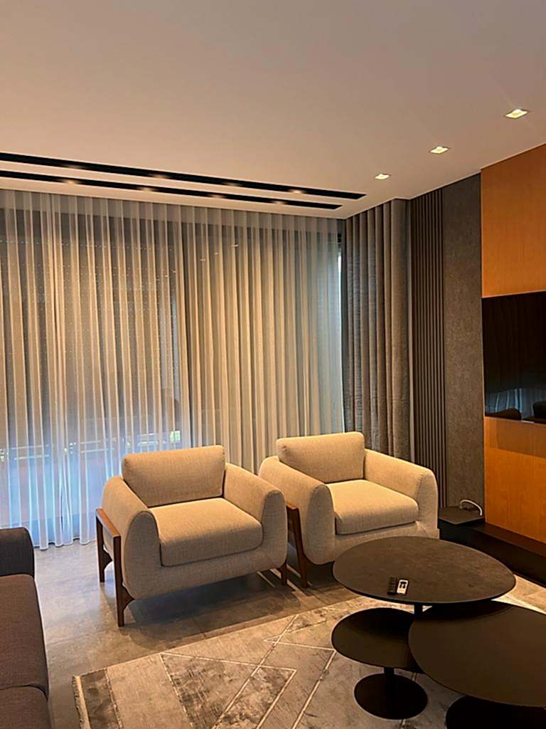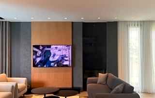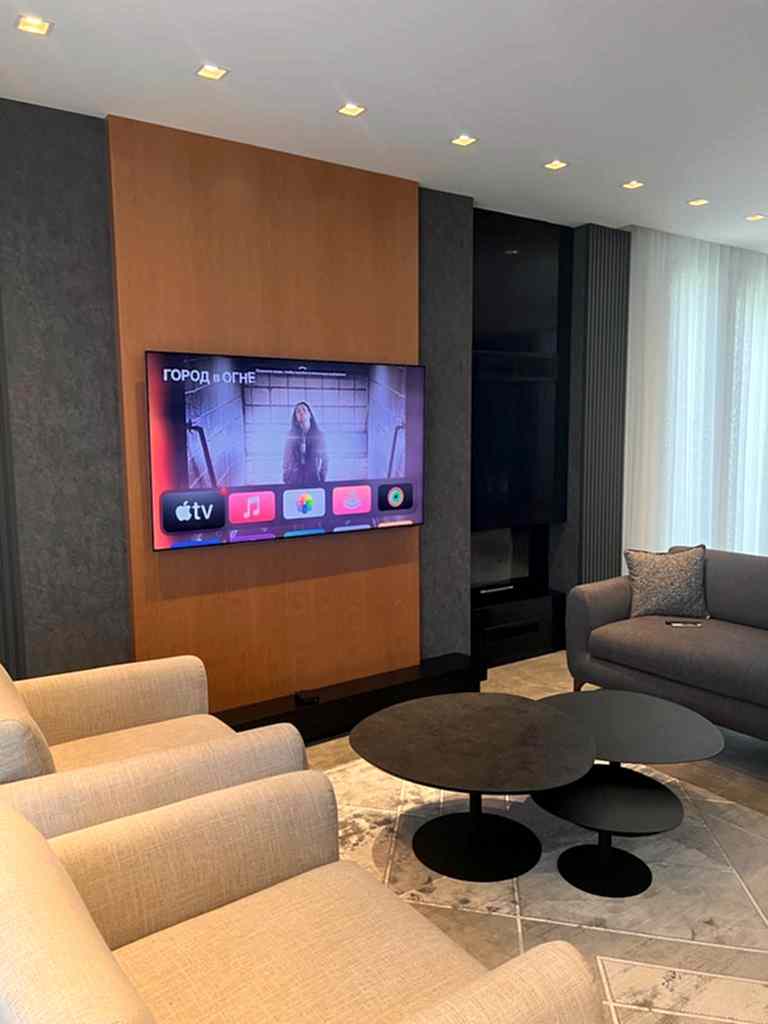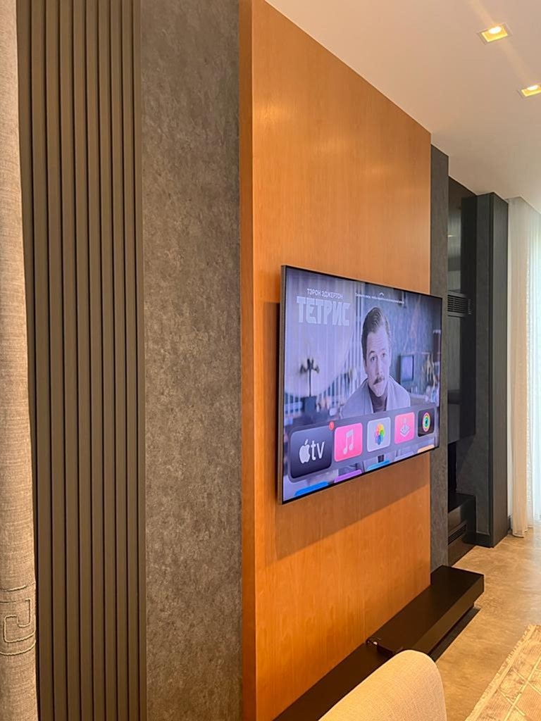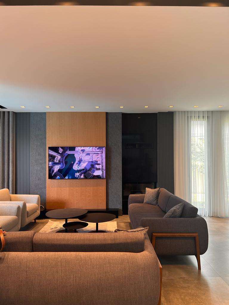 Geniş hacimli salonda, fonksiyonel mobilyalarla alanın daha verimli kullanılabilmesi sağlandı. TV duvarı, salonun minimalist tasarımına uyum sağlayacak şekilde panellerle zenginleştirildi ve düz bir konsol ile tamamlandı. Bu tasarım, salondaki sade çizgileri vurgularken, aynı zamanda işlevsel bir kullanım sundu.