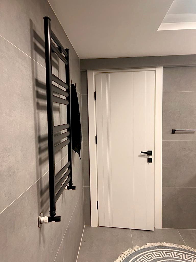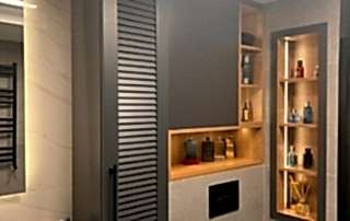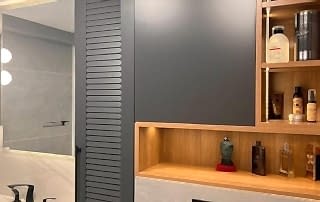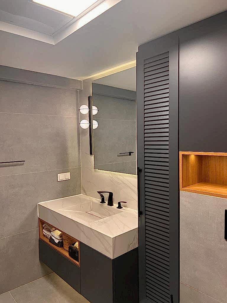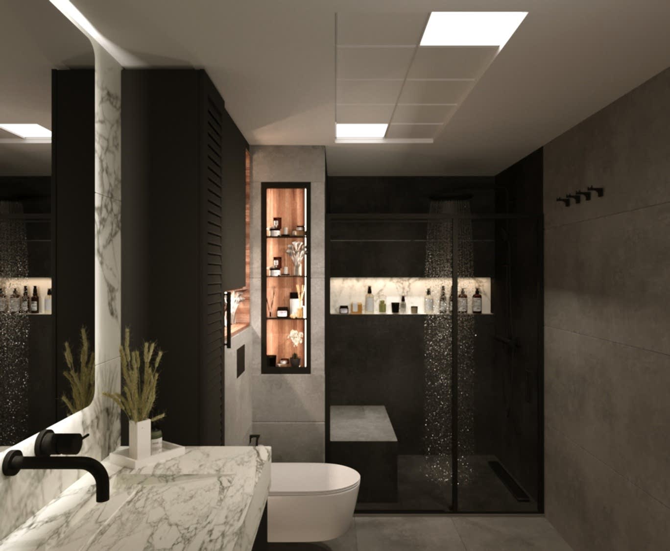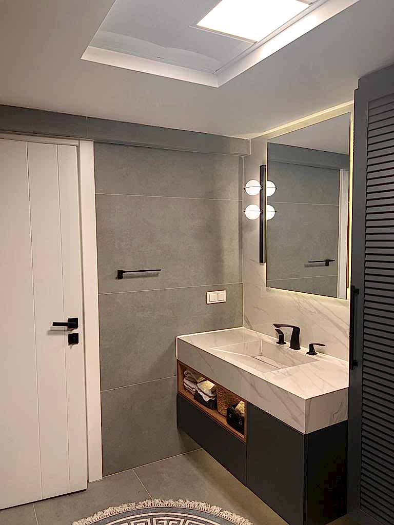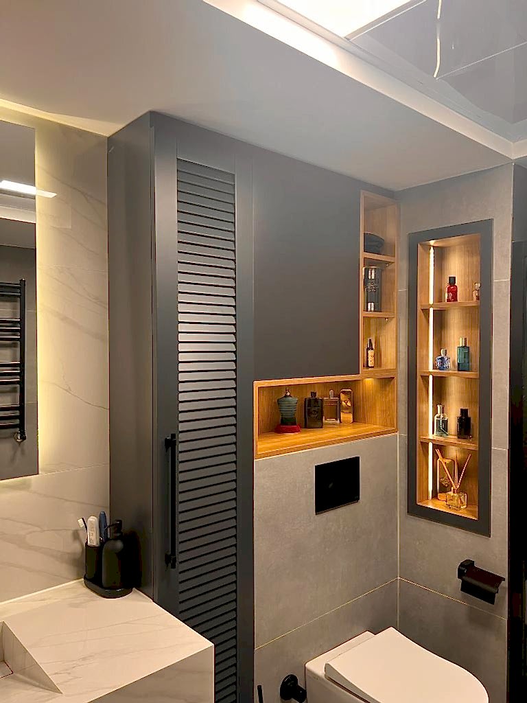 Banyoda, alanın sınırlı olmasından dolayı giriş kısmında çamaşır odası olarak kullanılacak gizli kapılı bir alan tasarlandı. Bu alan, makine dolapları ve kirli sepetleriyle en verimli şekilde kullanılarak, depolama alanı sağlandı ve alanın fonksiyonel kullanımı maksimize edildi.