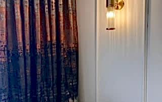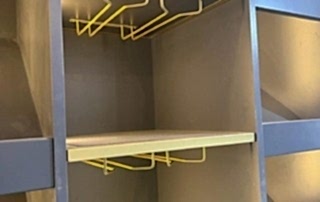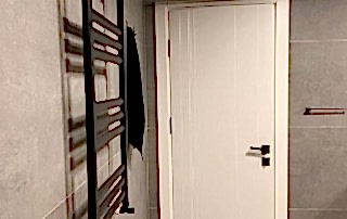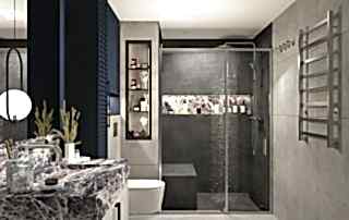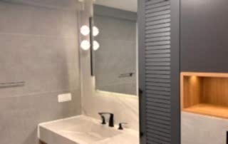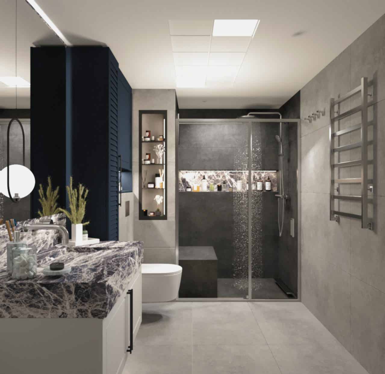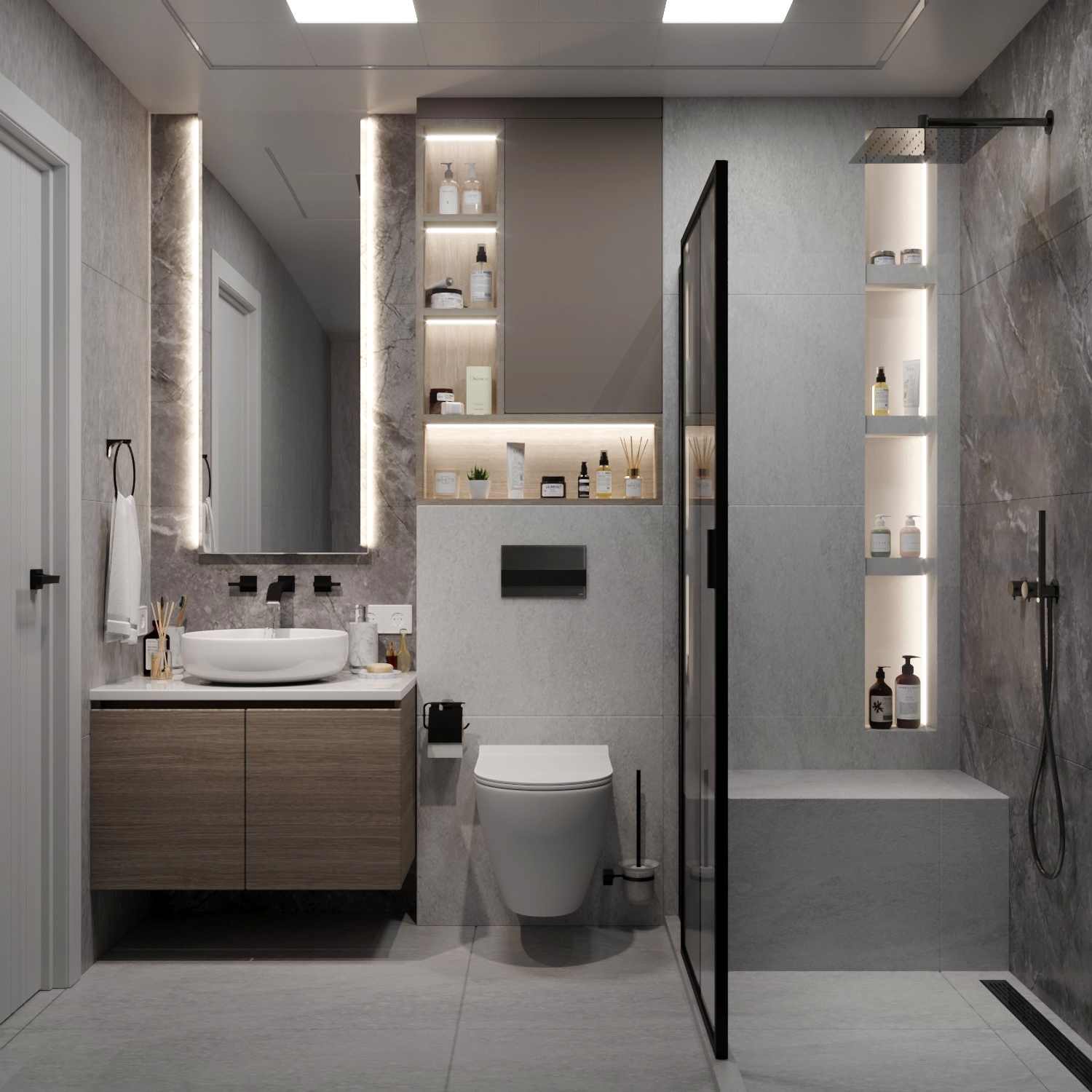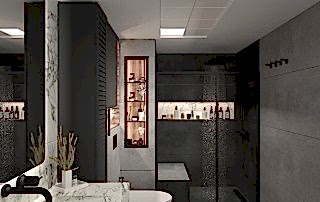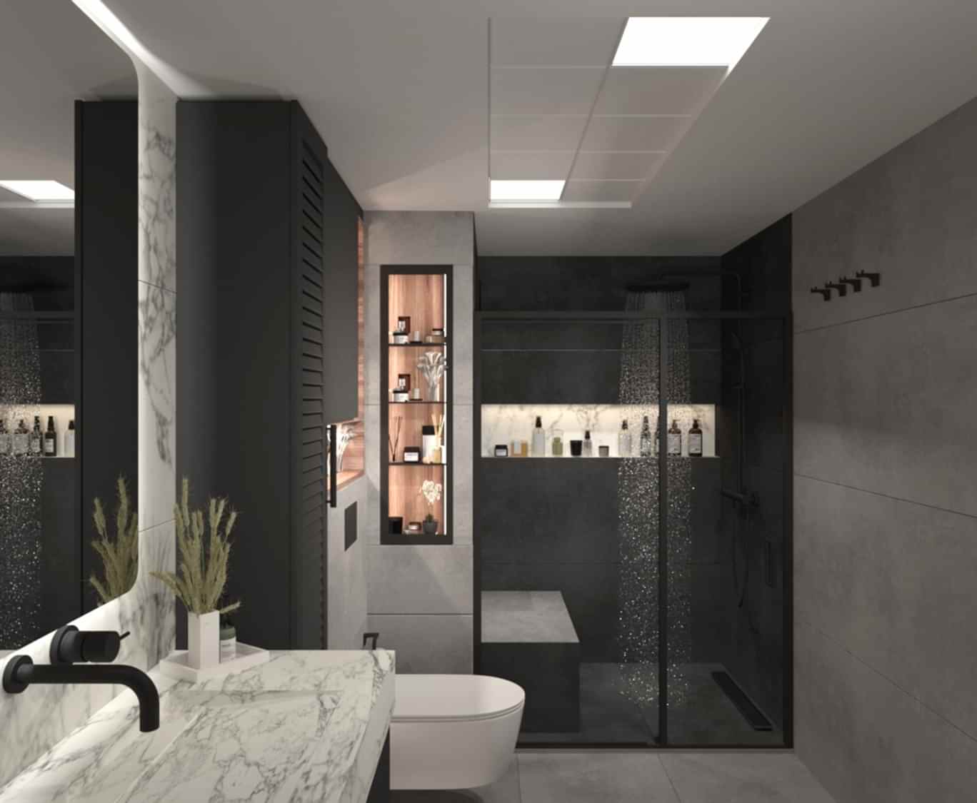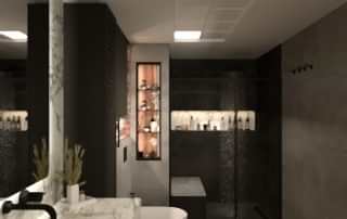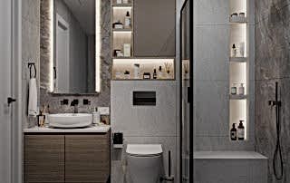 Banyoda, alanın sınırlı olmasından dolayı giriş kısmında çamaşır odası olarak kullanılacak gizli kapılı bir alan tasarlandı. Bu alan, makine dolapları ve kirli sepetleriyle en verimli şekilde kullanılarak, depolama alanı sağlandı ve alanın fonksiyonel kullanımı maksimize edildi.