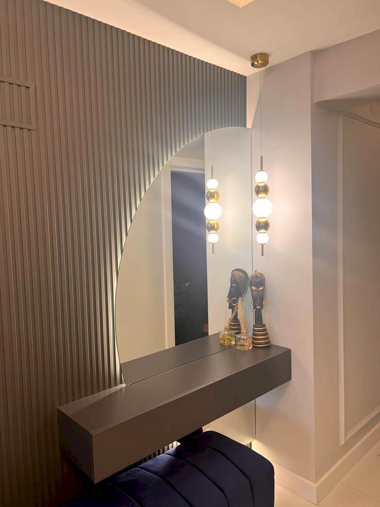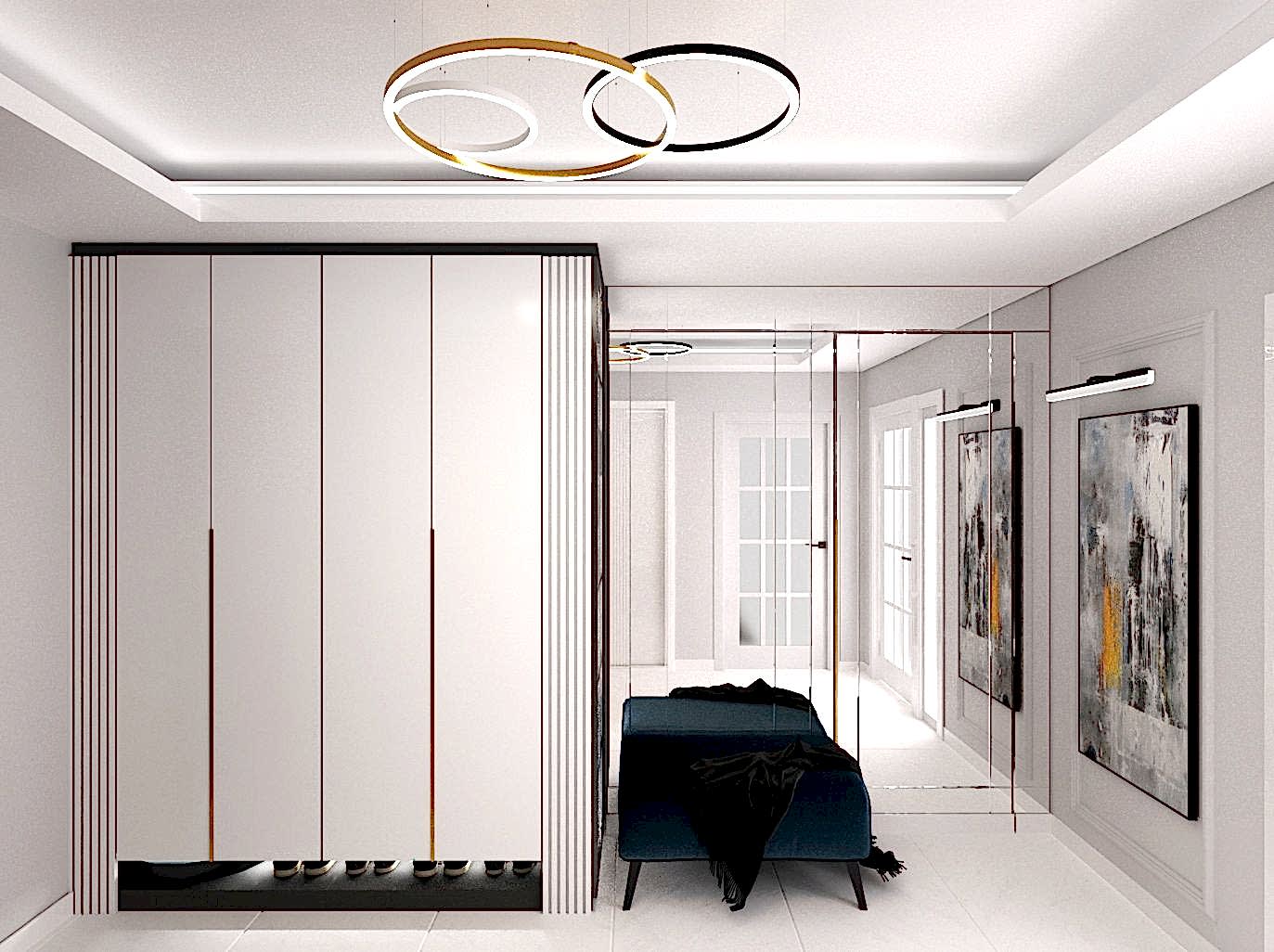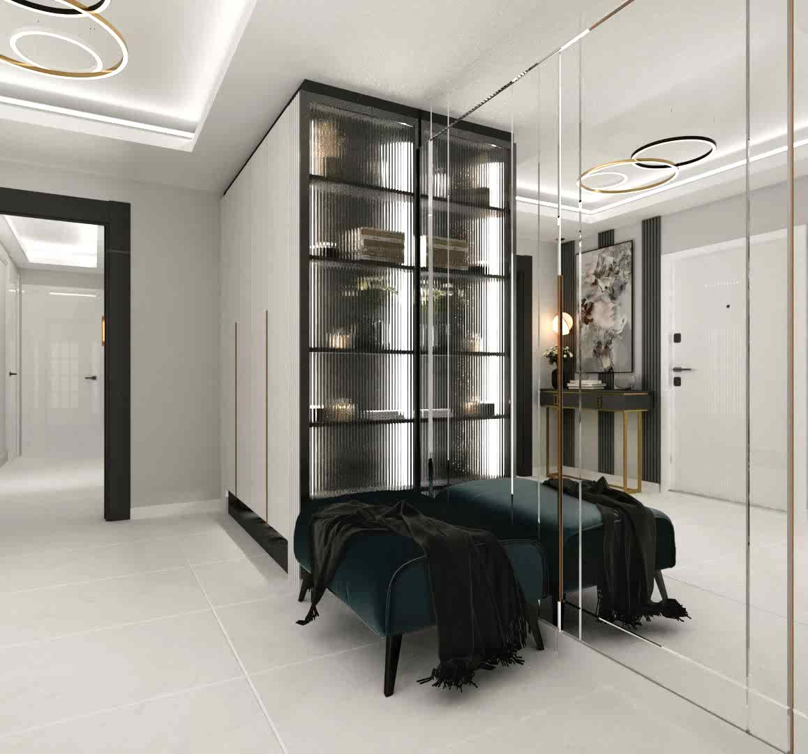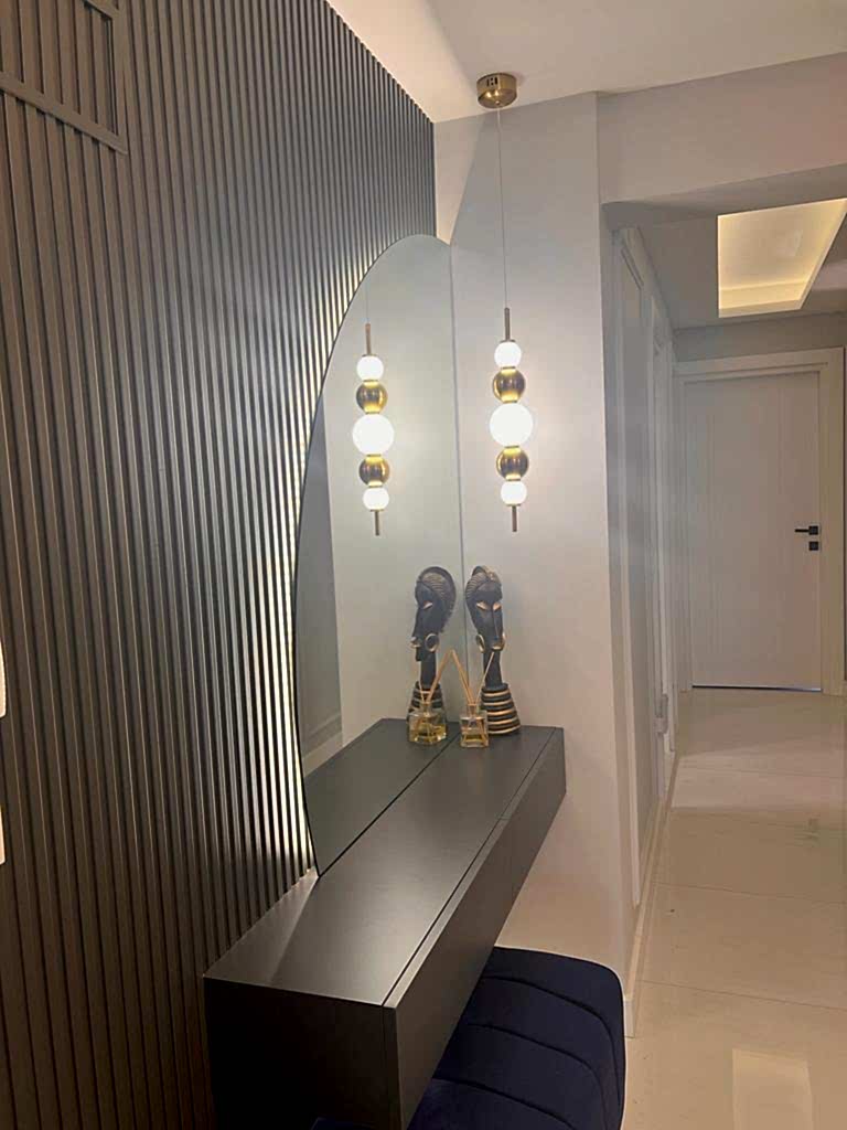 Karşıyaka Projesi, her alanın fonksiyonelliği ve şıklığına odaklanarak tasarlanmış modern bir yaşam alanıdır. Giriş mahallinde, mekanın küçük ölçülerine uygun olarak minimal bir dresuar tasarlandı. Duvar tasarımı, panel ve sarkıt aydınlatmalarla desteklenerek mekana derinlik ve görsel zenginlik katıldı. Bu tasarıma uyum sağlamak için, altın detaylara sahip yarı boy kulplu dolap tasarımı da mekanın şıklığını artırdı.