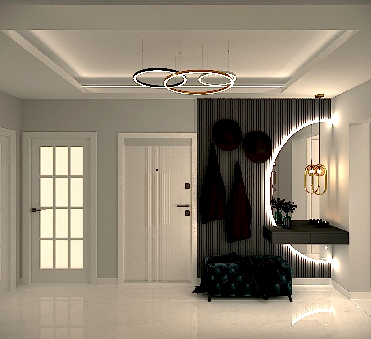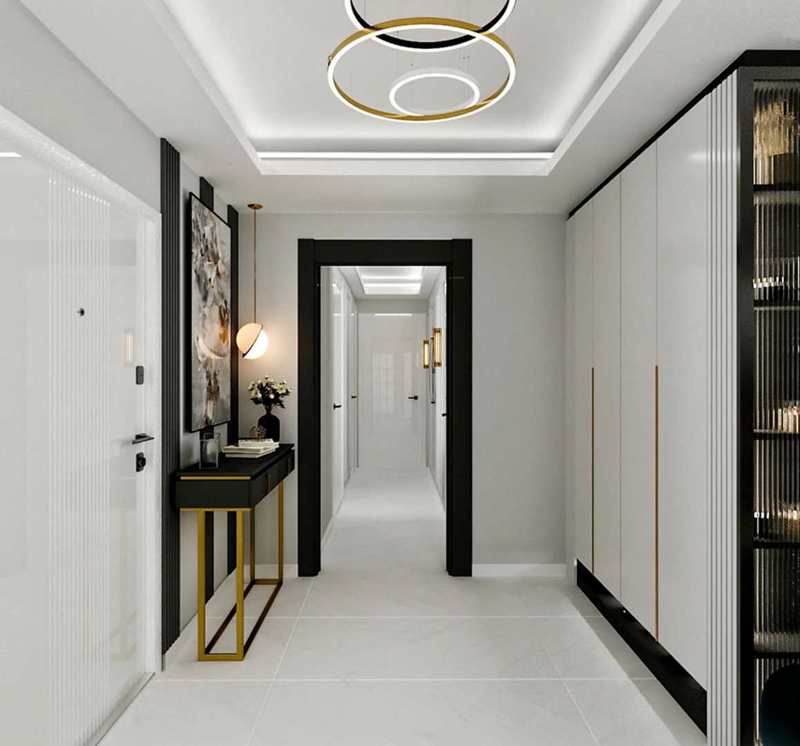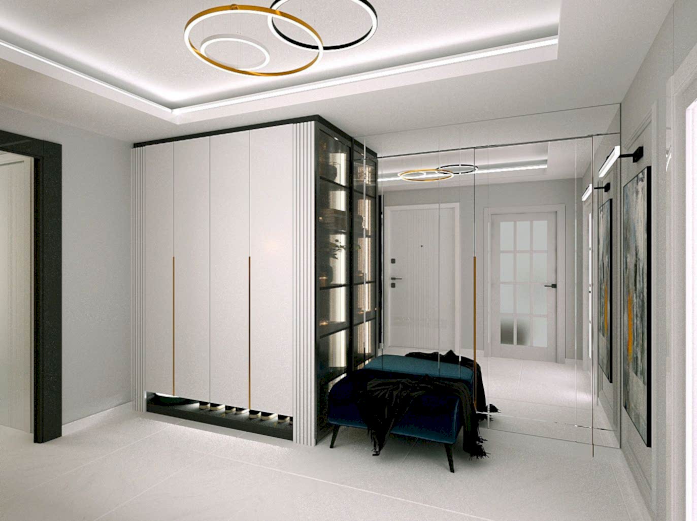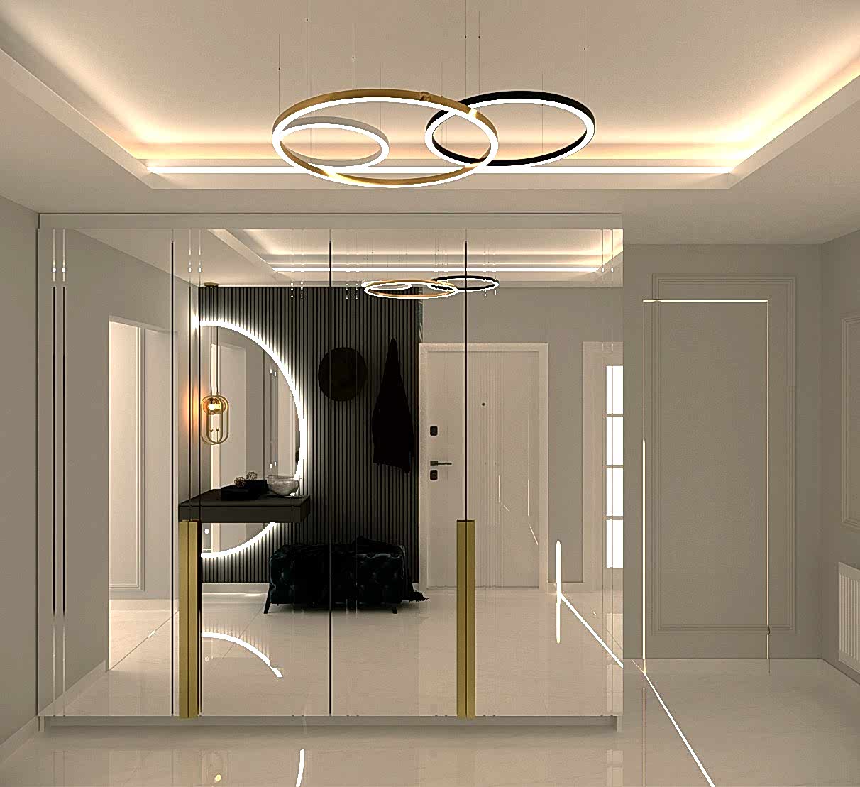 Karşıyaka Projesi, her alanın fonksiyonelliği ve şıklığına odaklanarak tasarlanmış modern bir yaşam alanıdır. Giriş mahallinde, mekanın küçük ölçülerine uygun olarak minimal bir dresuar tasarlandı. Duvar tasarımı, panel ve sarkıt aydınlatmalarla desteklenerek mekana derinlik ve görsel zenginlik katıldı. Bu tasarıma uyum sağlamak için, altın detaylara sahip yarı boy kulplu dolap tasarımı da mekanın şıklığını artırdı.