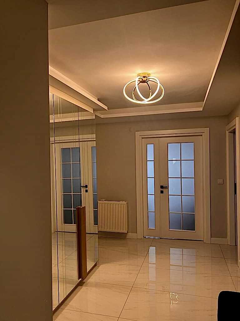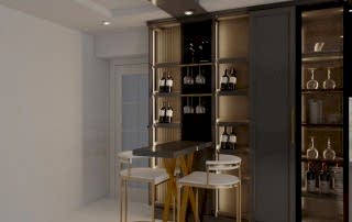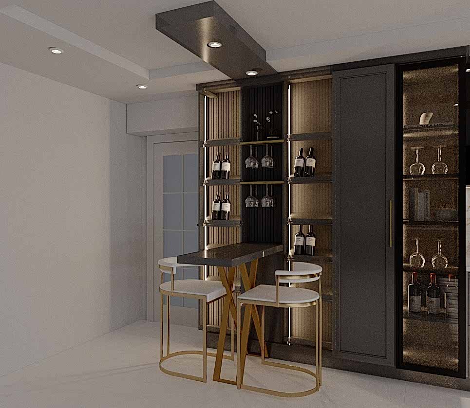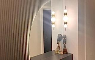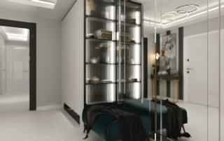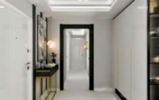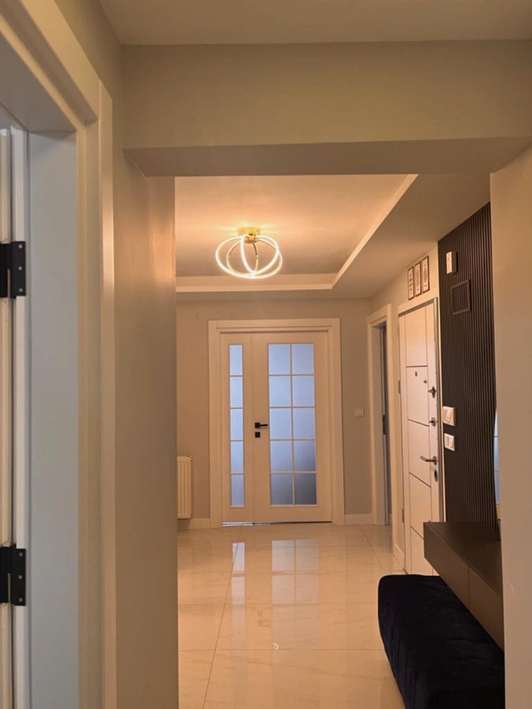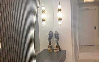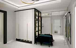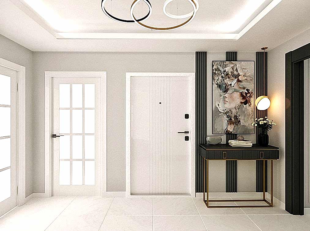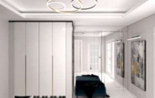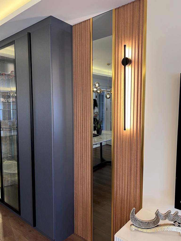 Karşıyaka Projesi, her alanın fonksiyonelliği ve şıklığına odaklanarak tasarlanmış modern bir yaşam alanıdır. Giriş mahallinde, mekanın küçük ölçülerine uygun olarak minimal bir dresuar tasarlandı. Duvar tasarımı, panel ve sarkıt aydınlatmalarla desteklenerek mekana derinlik ve görsel zenginlik katıldı. Bu tasarıma uyum sağlamak için, altın detaylara sahip yarı boy kulplu dolap tasarımı da mekanın şıklığını artırdı.