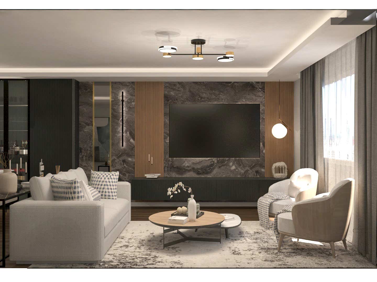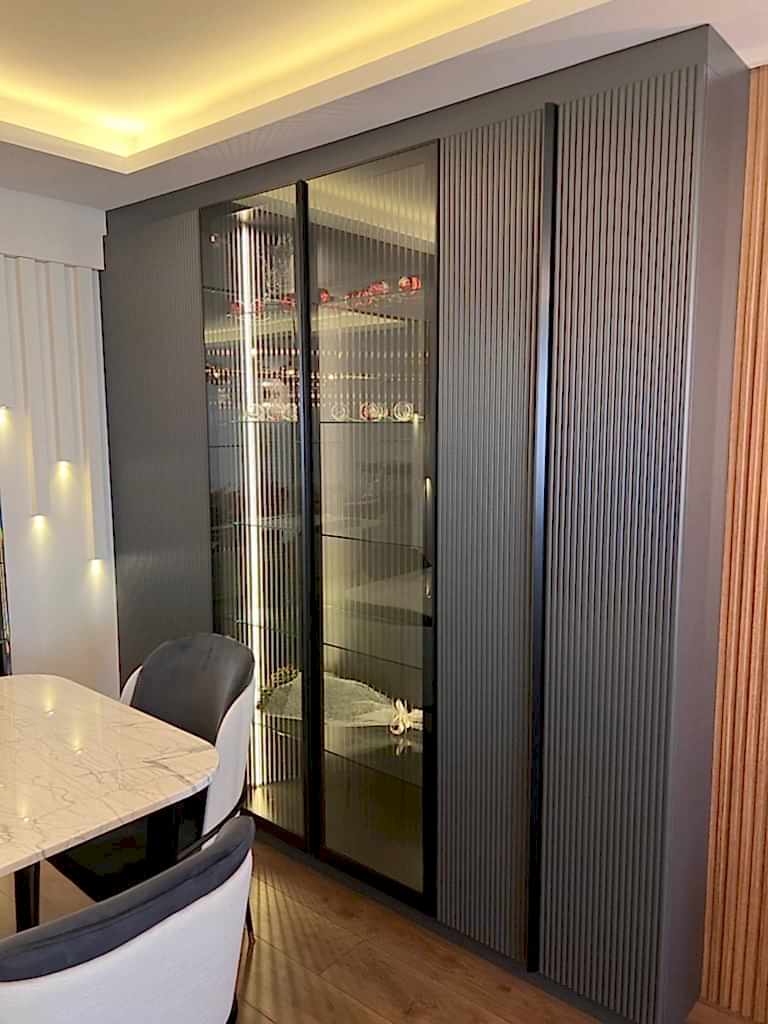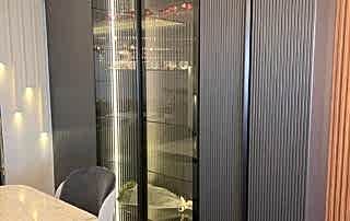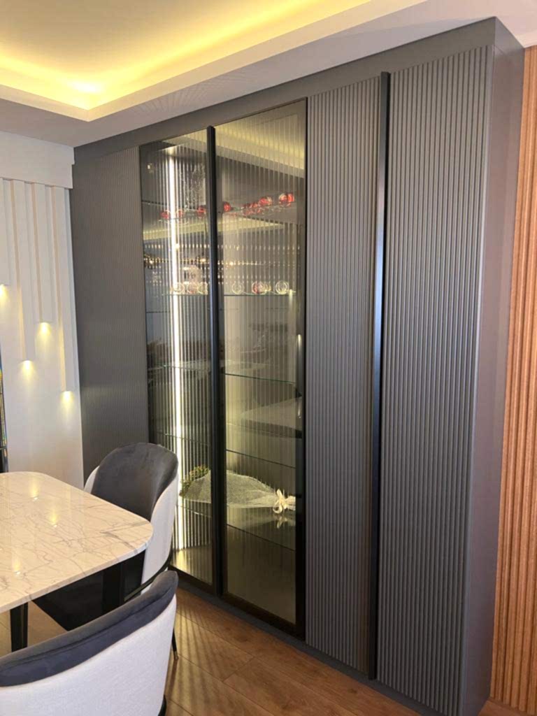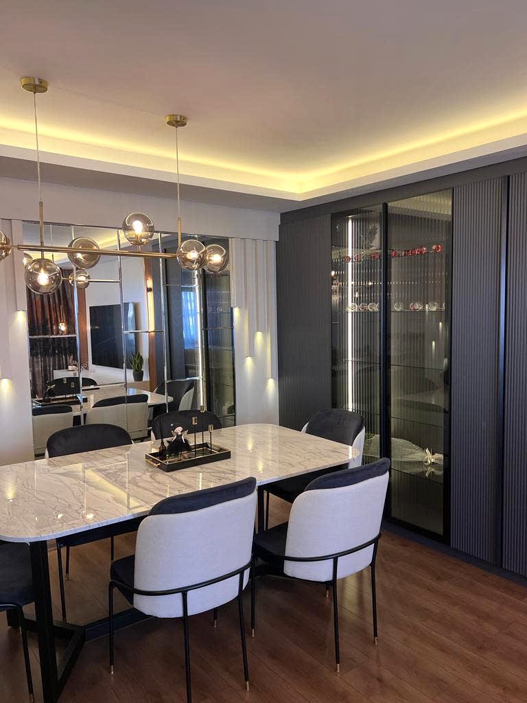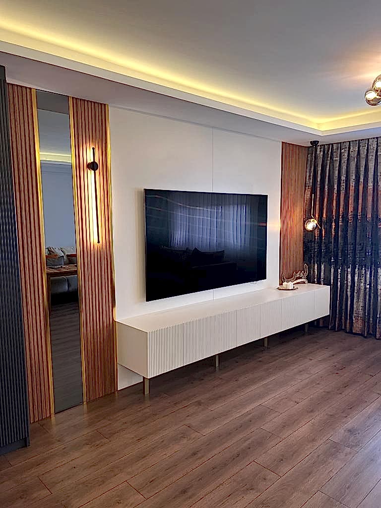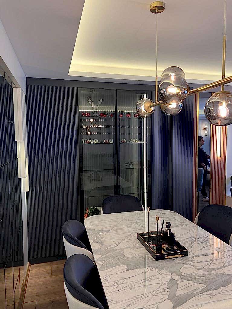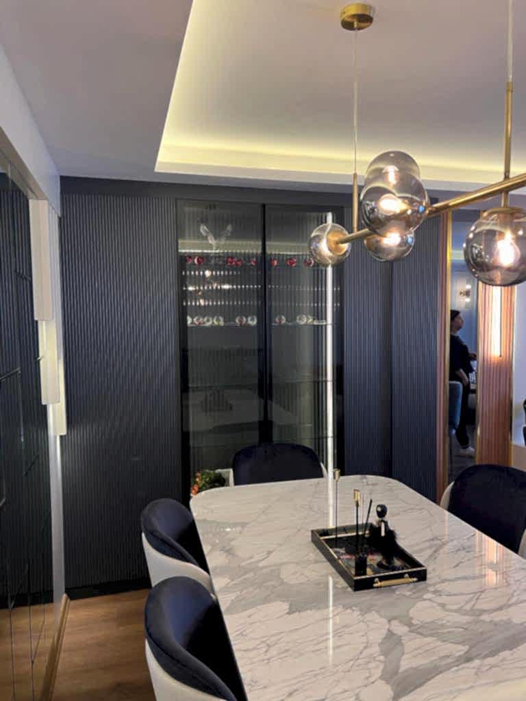 Salonda, TV duvarı tasarımında paneller kullanıldı ve bu paneller aplik ve sarkıt aydınlatmalarla zenginleştirildi. Yemek masası arkası duvarda ise led aydınlatmalı asimetrik duvar paneli kullanıldı, böylece mekanın tasarımı devam ettirildi ve görsel denge sağlandı. Alan ölçülerine uygun şekilde, led aydınlatmalı cam kapaklı vitrin dolabı yemek masası arkasına konumlandırıldı, böylece müşteriye ekstra depolama alanı sunulmuş oldu.
