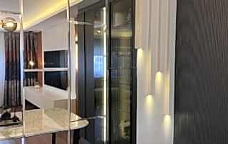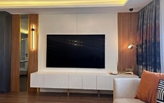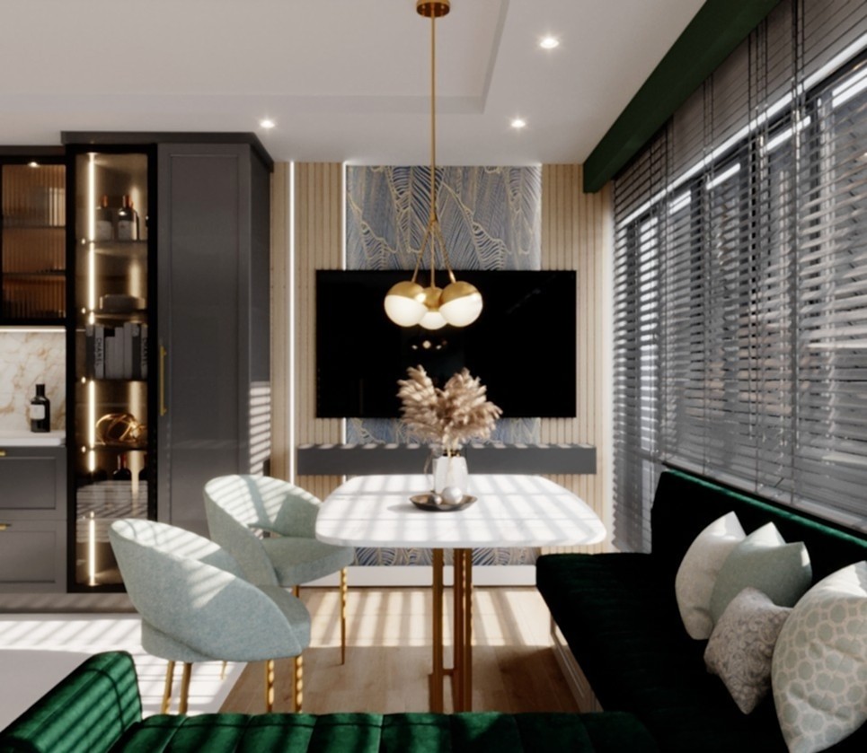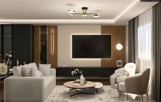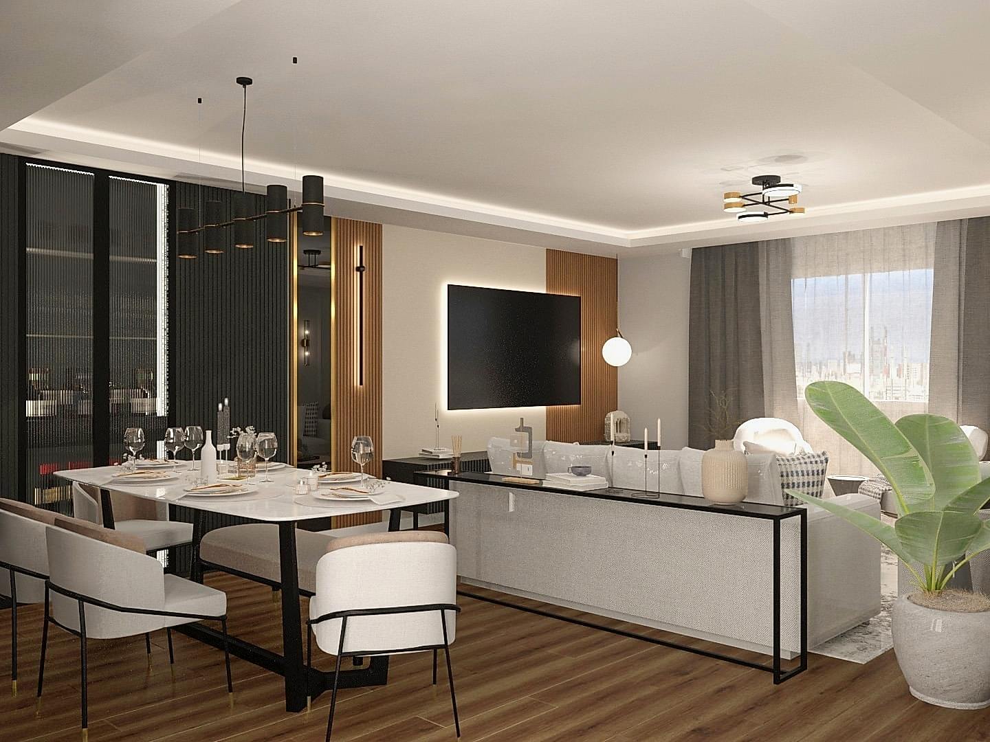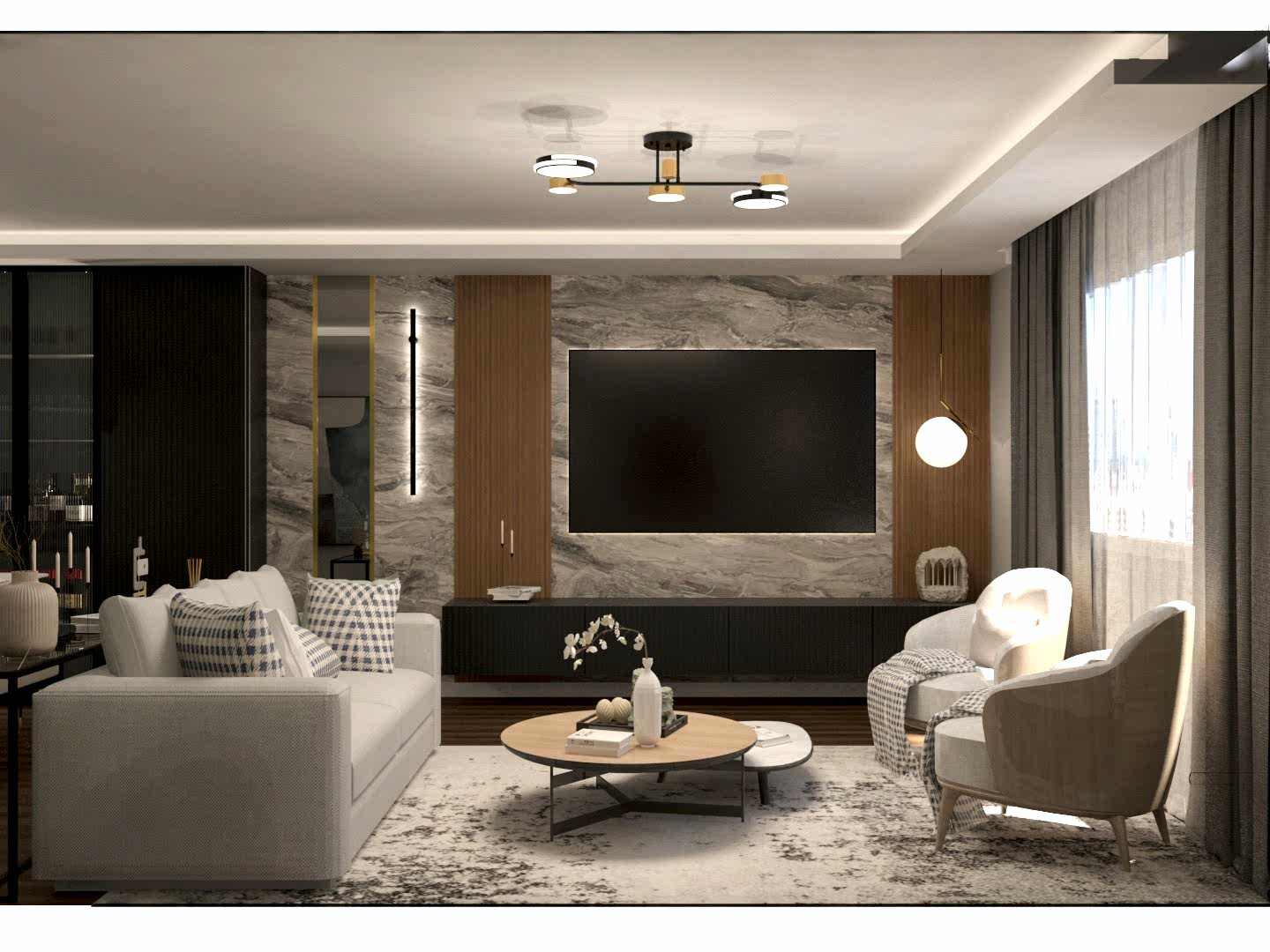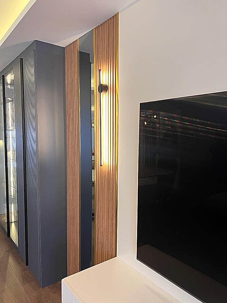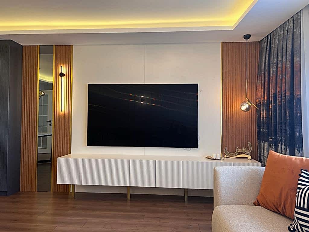 Salonda, TV duvarı tasarımında paneller kullanıldı ve bu paneller aplik ve sarkıt aydınlatmalarla zenginleştirildi. Yemek masası arkası duvarda ise led aydınlatmalı asimetrik duvar paneli kullanıldı, böylece mekanın tasarımı devam ettirildi ve görsel denge sağlandı. Alan ölçülerine uygun şekilde, led aydınlatmalı cam kapaklı vitrin dolabı yemek masası arkasına konumlandırıldı, böylece müşteriye ekstra depolama alanı sunulmuş oldu.