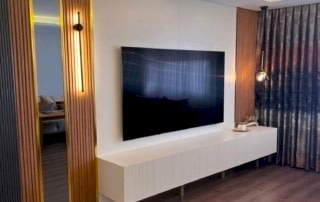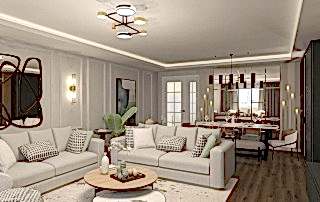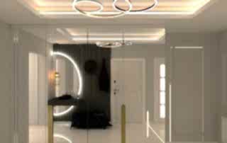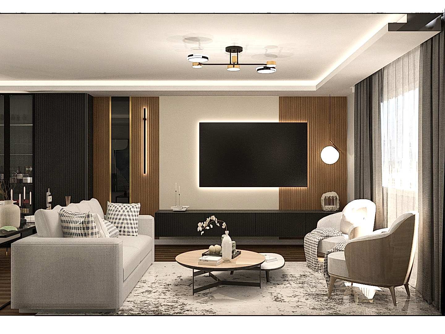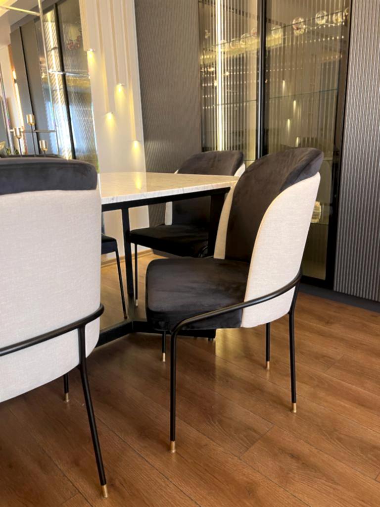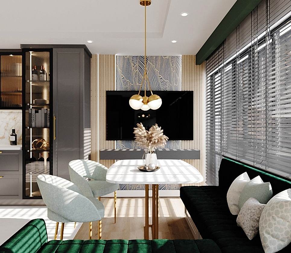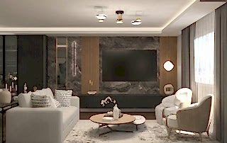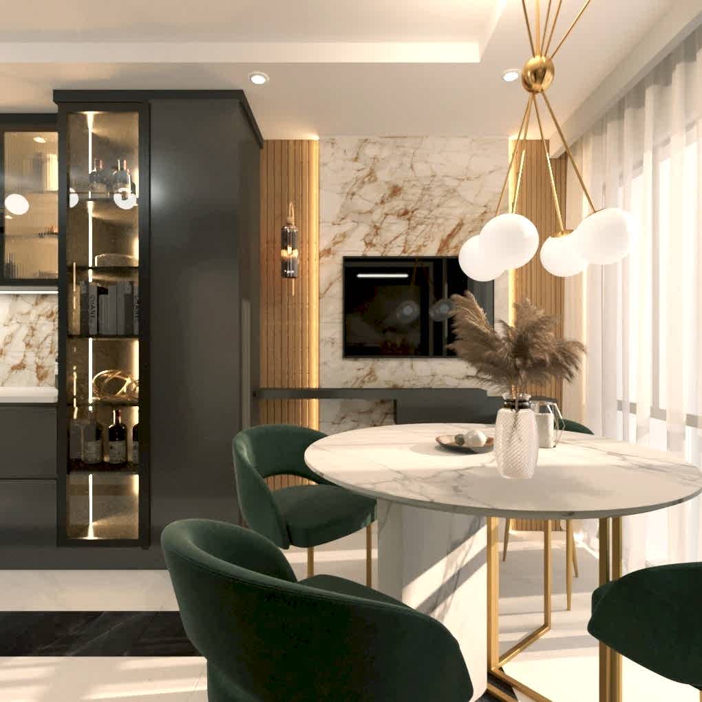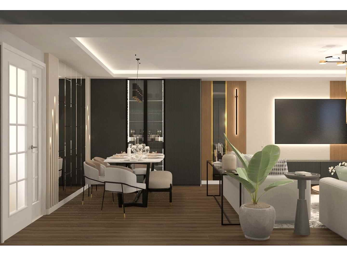 Salonda, TV duvarı tasarımında paneller kullanıldı ve bu paneller aplik ve sarkıt aydınlatmalarla zenginleştirildi. Yemek masası arkası duvarda ise led aydınlatmalı asimetrik duvar paneli kullanıldı, böylece mekanın tasarımı devam ettirildi ve görsel denge sağlandı. Alan ölçülerine uygun şekilde, led aydınlatmalı cam kapaklı vitrin dolabı yemek masası arkasına konumlandırıldı, böylece müşteriye ekstra depolama alanı sunulmuş oldu.