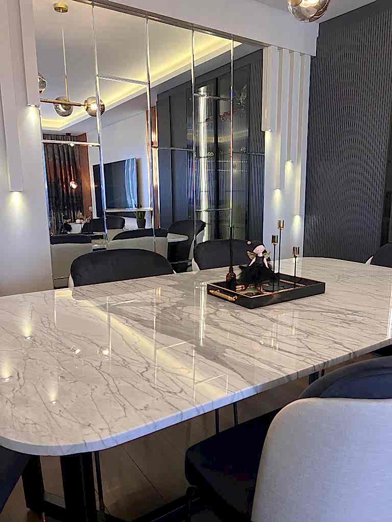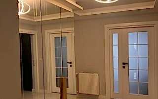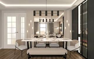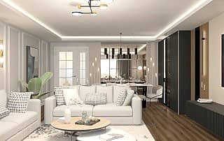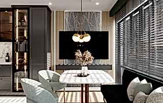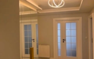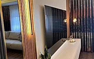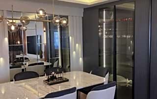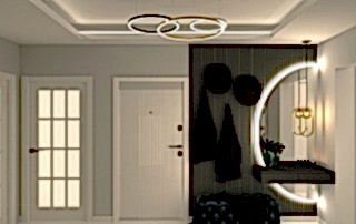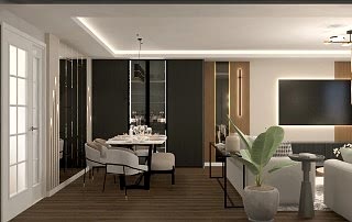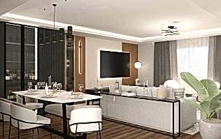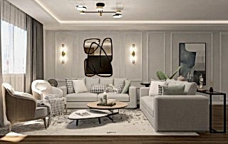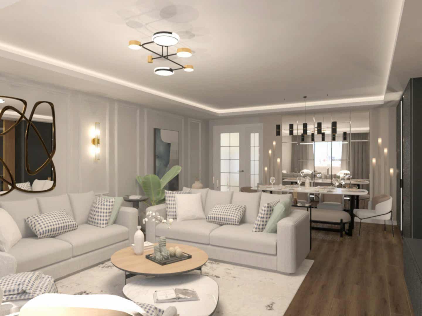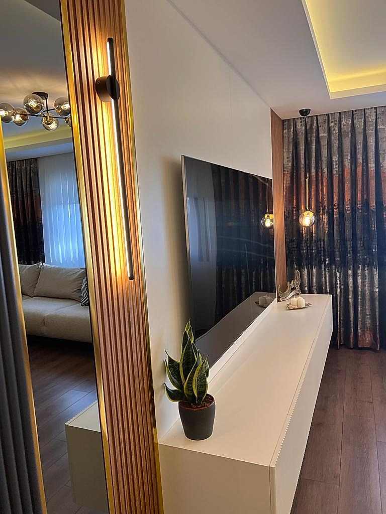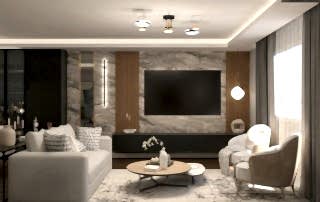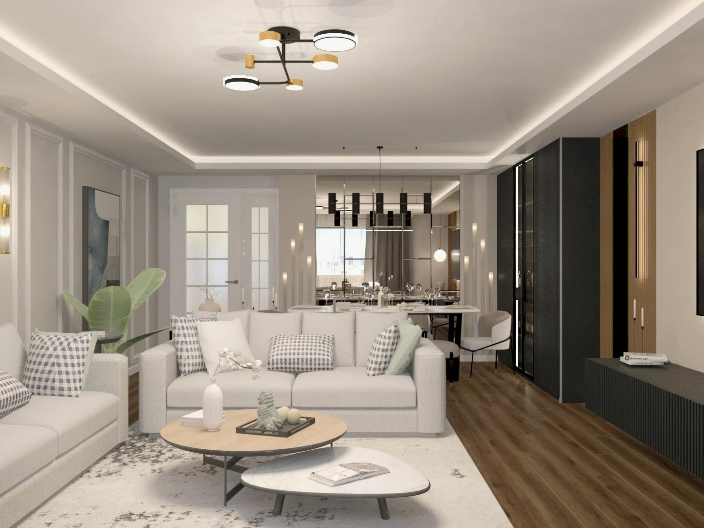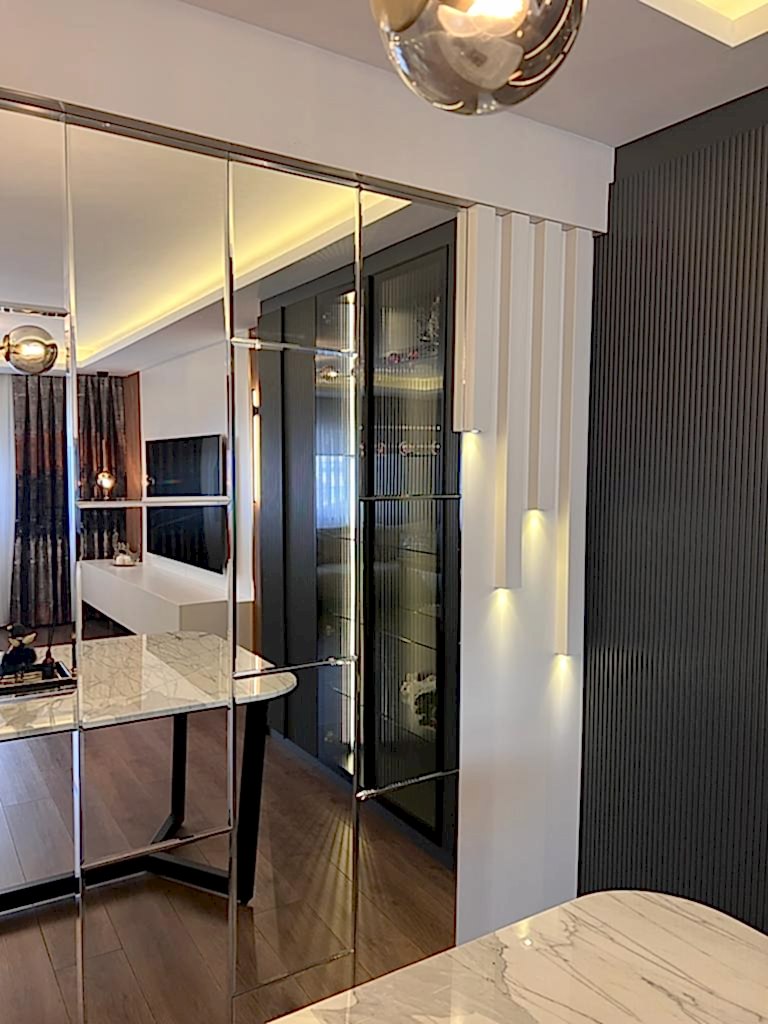 Salonda, TV duvarı tasarımında paneller kullanıldı ve bu paneller aplik ve sarkıt aydınlatmalarla zenginleştirildi. Yemek masası arkası duvarda ise led aydınlatmalı asimetrik duvar paneli kullanıldı, böylece mekanın tasarımı devam ettirildi ve görsel denge sağlandı. Alan ölçülerine uygun şekilde, led aydınlatmalı cam kapaklı vitrin dolabı yemek masası arkasına konumlandırıldı, böylece müşteriye ekstra depolama alanı sunulmuş oldu.