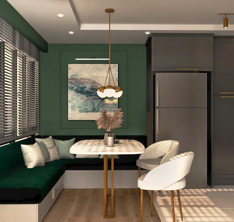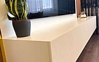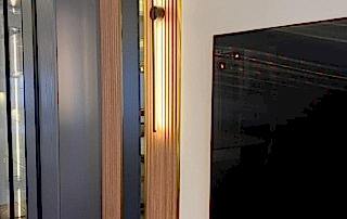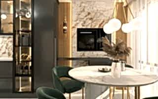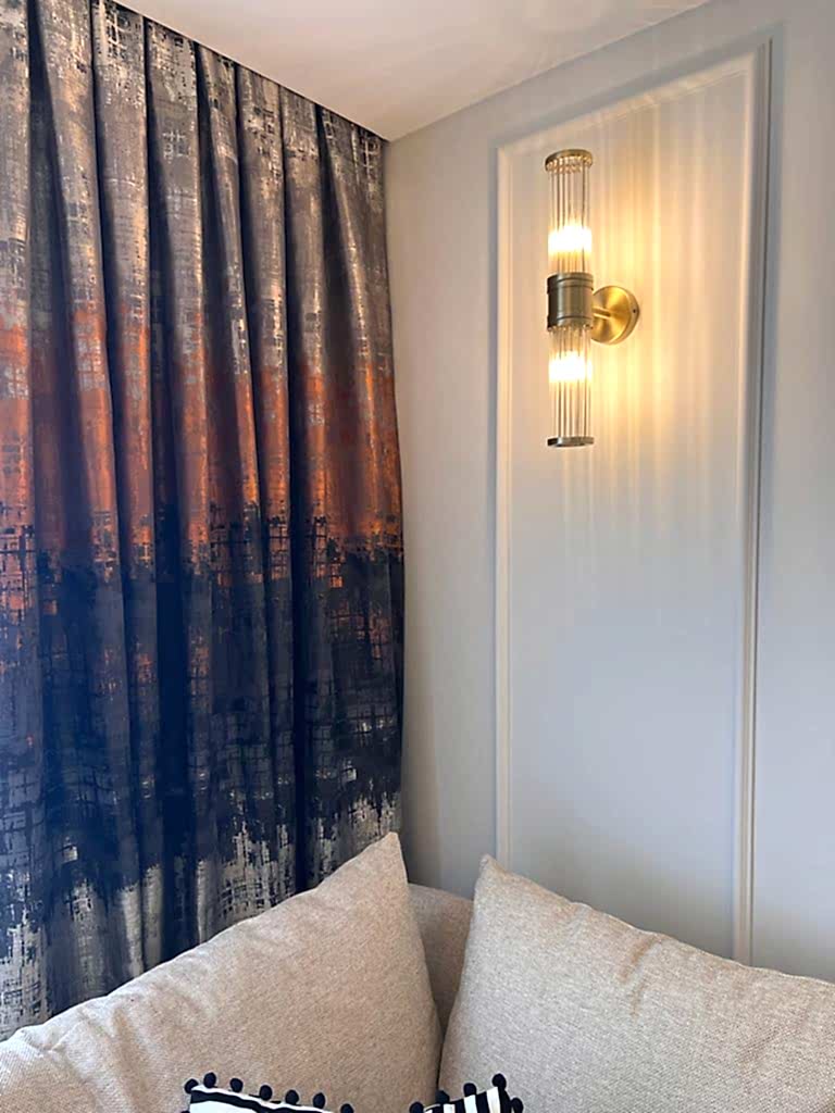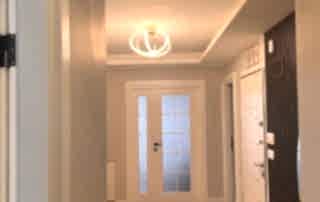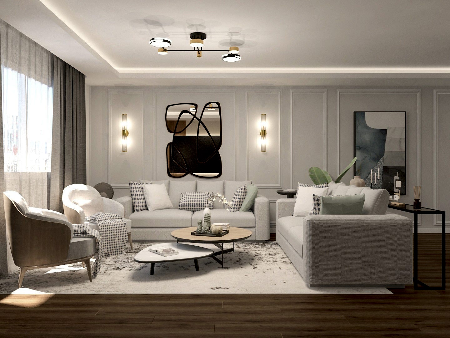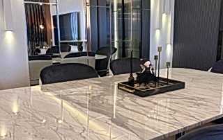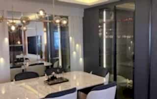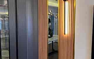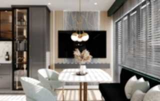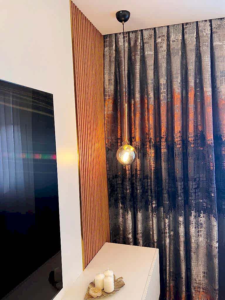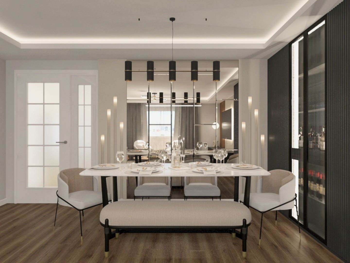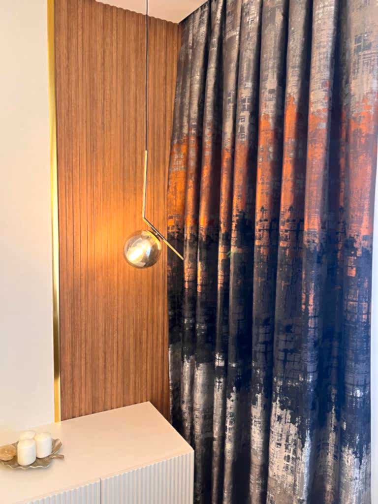 Salonda, TV duvarı tasarımında paneller kullanıldı ve bu paneller aplik ve sarkıt aydınlatmalarla zenginleştirildi. Yemek masası arkası duvarda ise led aydınlatmalı asimetrik duvar paneli kullanıldı, böylece mekanın tasarımı devam ettirildi ve görsel denge sağlandı. Alan ölçülerine uygun şekilde, led aydınlatmalı cam kapaklı vitrin dolabı yemek masası arkasına konumlandırıldı, böylece müşteriye ekstra depolama alanı sunulmuş oldu.