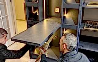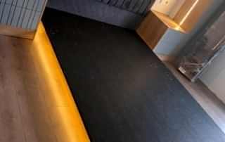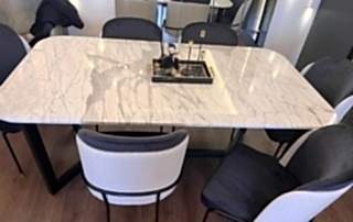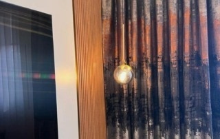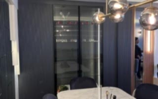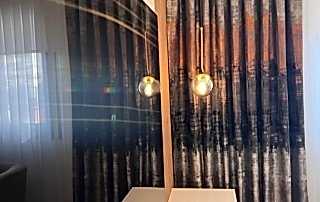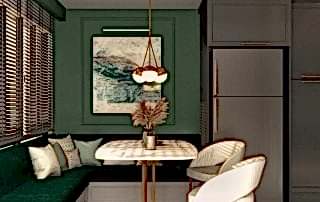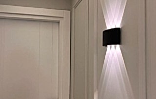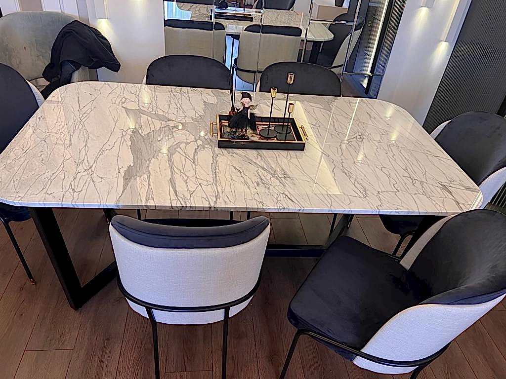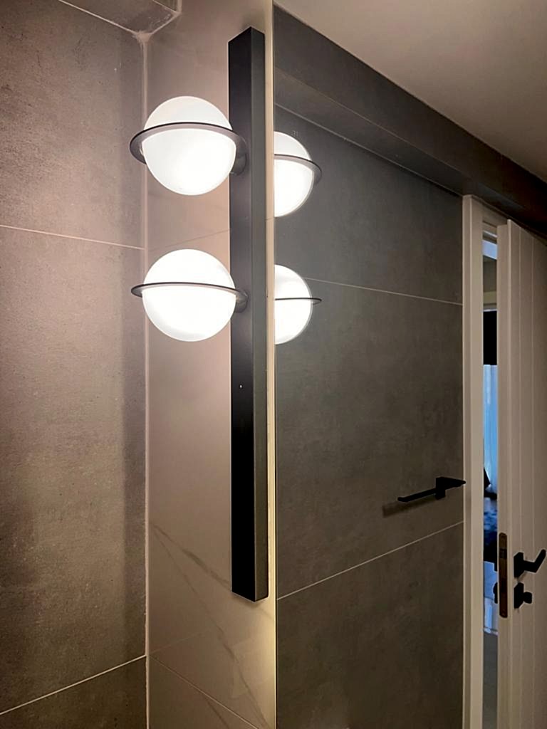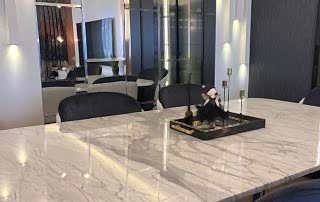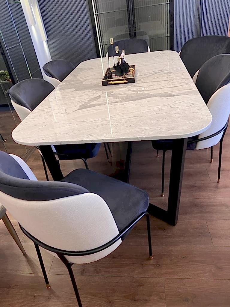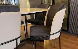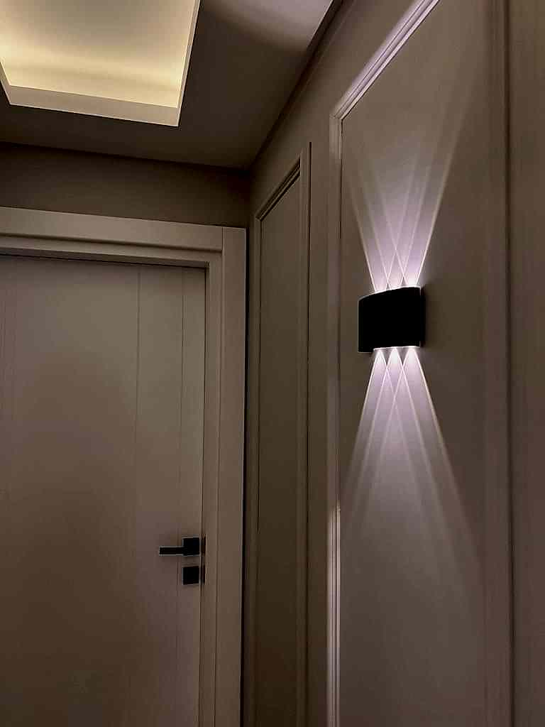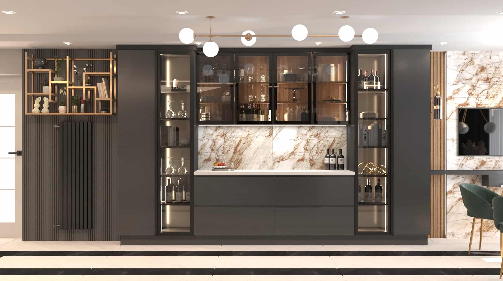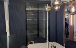Salonda, TV duvarı tasarımında paneller kullanıldı ve bu paneller aplik ve sarkıt aydınlatmalarla zenginleştirildi. Yemek masası arkası duvarda ise led aydınlatmalı asimetrik duvar paneli kullanıldı, böylece mekanın tasarımı devam ettirildi ve görsel denge sağlandı. Alan ölçülerine uygun şekilde, led aydınlatmalı cam kapaklı vitrin dolabı yemek masası arkasına konumlandırıldı, böylece müşteriye ekstra depolama alanı sunulmuş oldu.