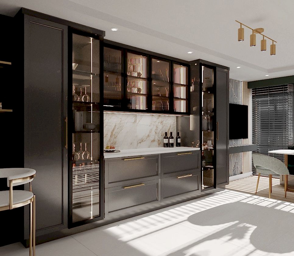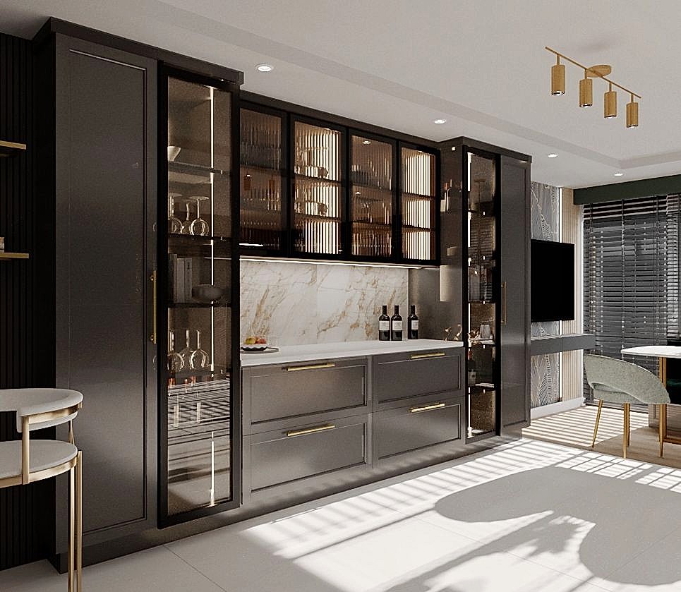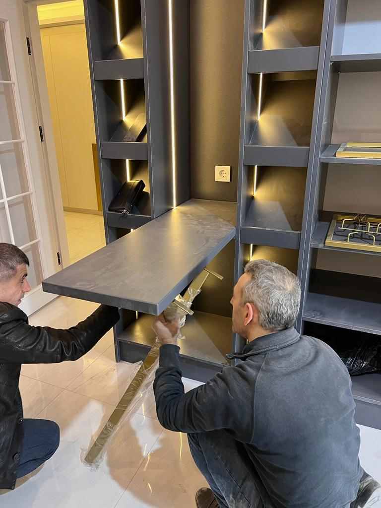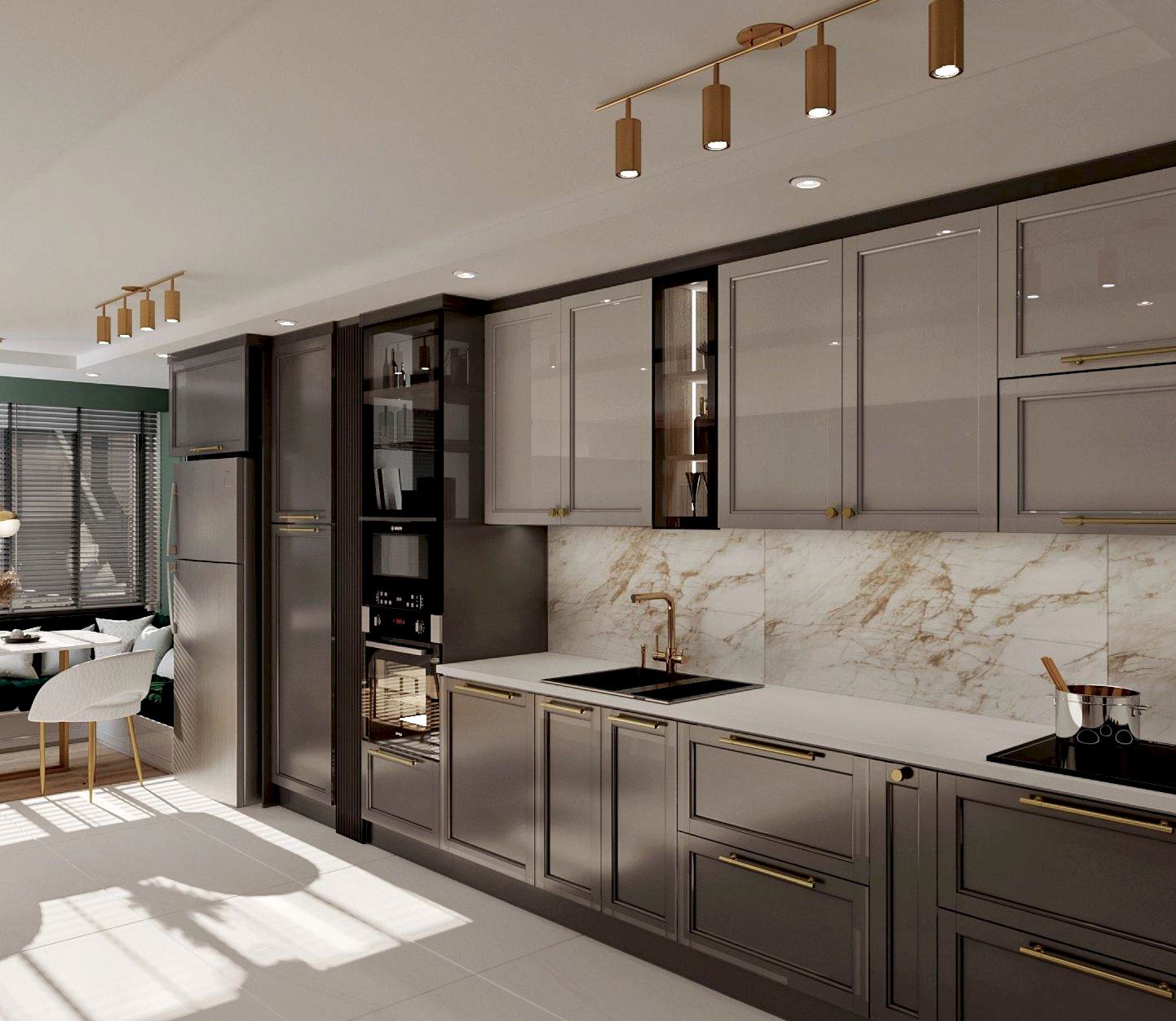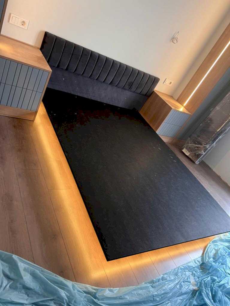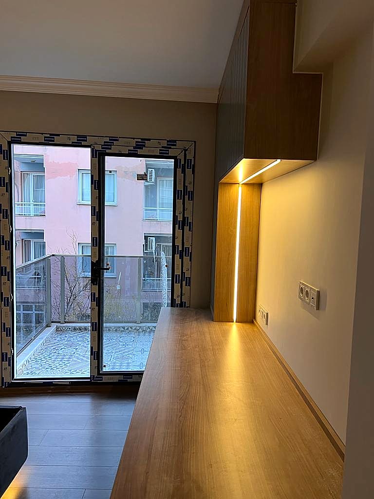 Mutfakta, paralel tezgah düzeni tercih edilerek bir kısım pişirme ve hazırlık alanlarına, diğer tarafta ise led aydınlatmalı açılır kapanır bar masalı bir vitrin modülü yerleştirildi. Bu modül, mutfağın işlevselliğini artırırken aynı zamanda görsel olarak da şıklık kattı. Tezgah devam ettirilerek hazırlık alanı genişletildi, böylece kullanıcının mutfakta daha fazla çalışma alanına sahip olması sağlandı. Dolapların bitiminde, müşterinin tercihlerine göre yemek ve TV alanı oluşturularak yaşam alanına dahil edildi. Genç odasında, yatak başı özel baskı duvar kağıdı ile kaplandı. Bu tasarım, dilimli yatak başı, fugalı komodinler ve sarkıt aydınlatmalarla desteklendi. Böylece genç odası, şık ve modern bir atmosfer kazanırken aynı zamanda fonksiyonellik de ön planda tutuldu. Banyoda, Hilton lavabo tasarımı tercih edildi ve granitten özel üretim bir lavabo kullanıldı. Hilton lavabo üzerinde, led aydınlatmalı ayna ve aplikler ile aydınlatma detayları eklenerek alan daha geniş ve ferah hale getirildi. Ayrıca, rezervuar üzeri nişli dolap kullanılarak ekstra depolama alanı sağlandı. Karşıyaka Projesi, her detayda estetik ve fonksiyonelliği birleştirerek, yaşam alanlarını daha verimli ve konforlu hale getiren, modern bir tasarım anlayışıyla hayata geçirildi.
