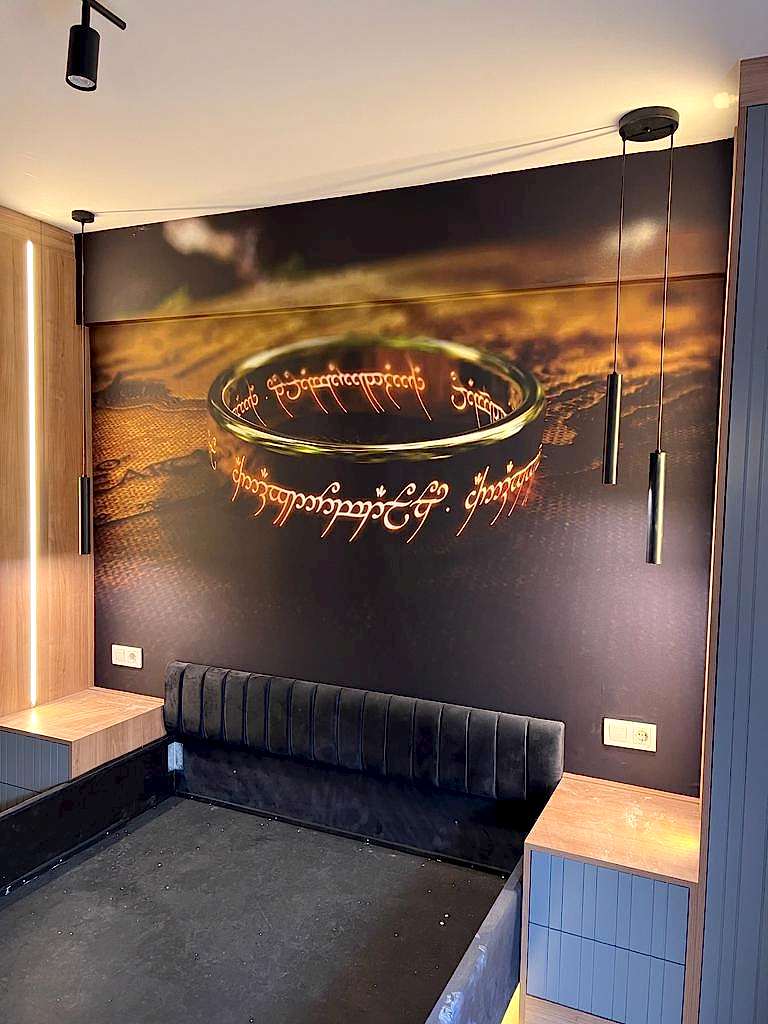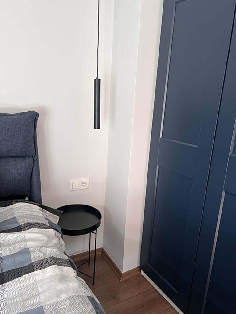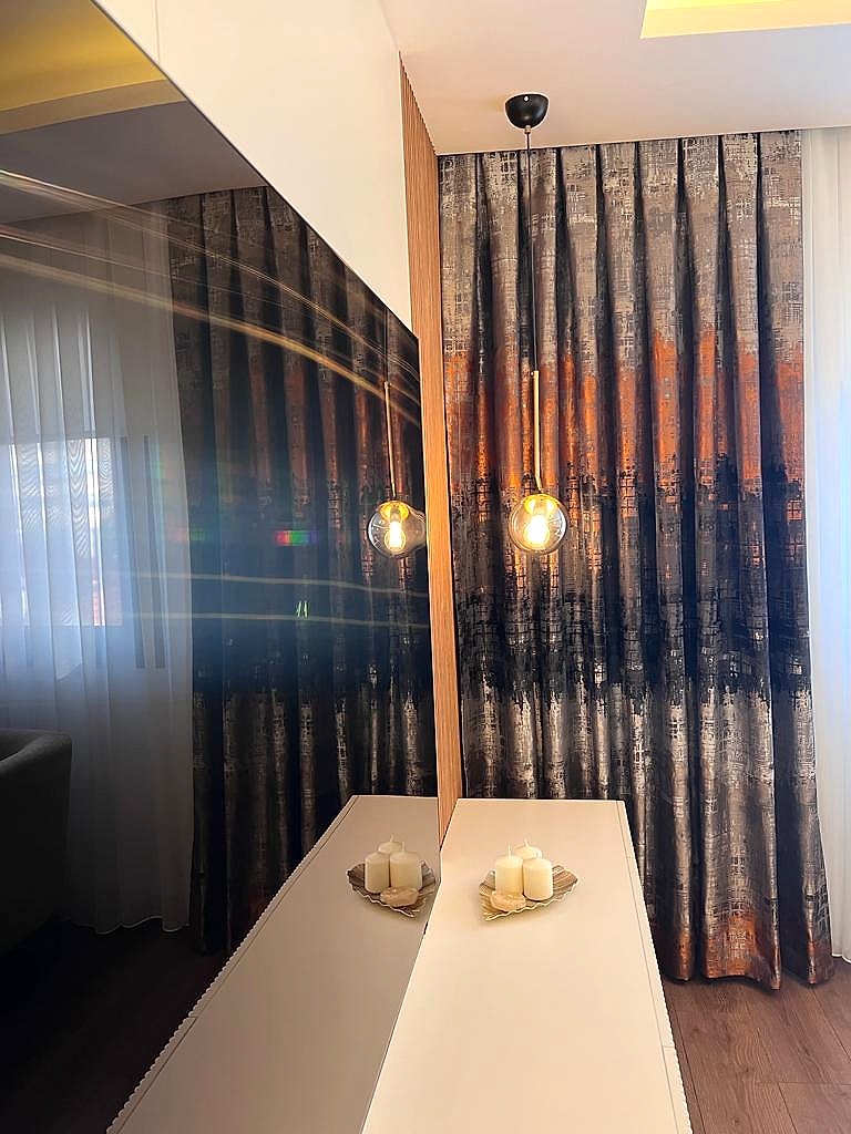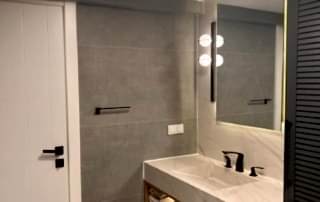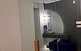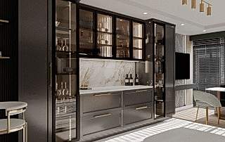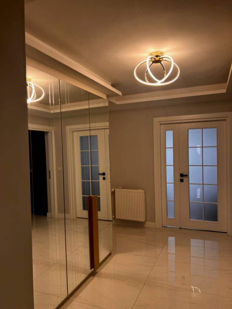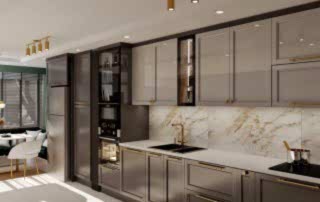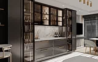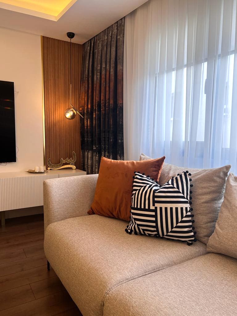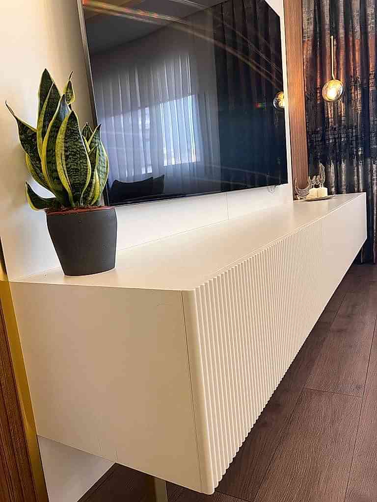 Mutfakta, paralel tezgah düzeni tercih edilerek bir kısım pişirme ve hazırlık alanlarına, diğer tarafta ise led aydınlatmalı açılır kapanır bar masalı bir vitrin modülü yerleştirildi. Bu modül, mutfağın işlevselliğini artırırken aynı zamanda görsel olarak da şıklık kattı. Tezgah devam ettirilerek hazırlık alanı genişletildi, böylece kullanıcının mutfakta daha fazla çalışma alanına sahip olması sağlandı. Dolapların bitiminde, müşterinin tercihlerine göre yemek ve TV alanı oluşturularak yaşam alanına dahil edildi. Genç odasında, yatak başı özel baskı duvar kağıdı ile kaplandı. Bu tasarım, dilimli yatak başı, fugalı komodinler ve sarkıt aydınlatmalarla desteklendi. Böylece genç odası, şık ve modern bir atmosfer kazanırken aynı zamanda fonksiyonellik de ön planda tutuldu. Banyoda, Hilton lavabo tasarımı tercih edildi ve granitten özel üretim bir lavabo kullanıldı. Hilton lavabo üzerinde, led aydınlatmalı ayna ve aplikler ile aydınlatma detayları eklenerek alan daha geniş ve ferah hale getirildi. Ayrıca, rezervuar üzeri nişli dolap kullanılarak ekstra depolama alanı sağlandı. Karşıyaka Projesi, her detayda estetik ve fonksiyonelliği birleştirerek, yaşam alanlarını daha verimli ve konforlu hale getiren, modern bir tasarım anlayışıyla hayata geçirildi.