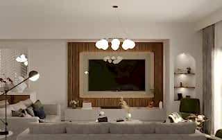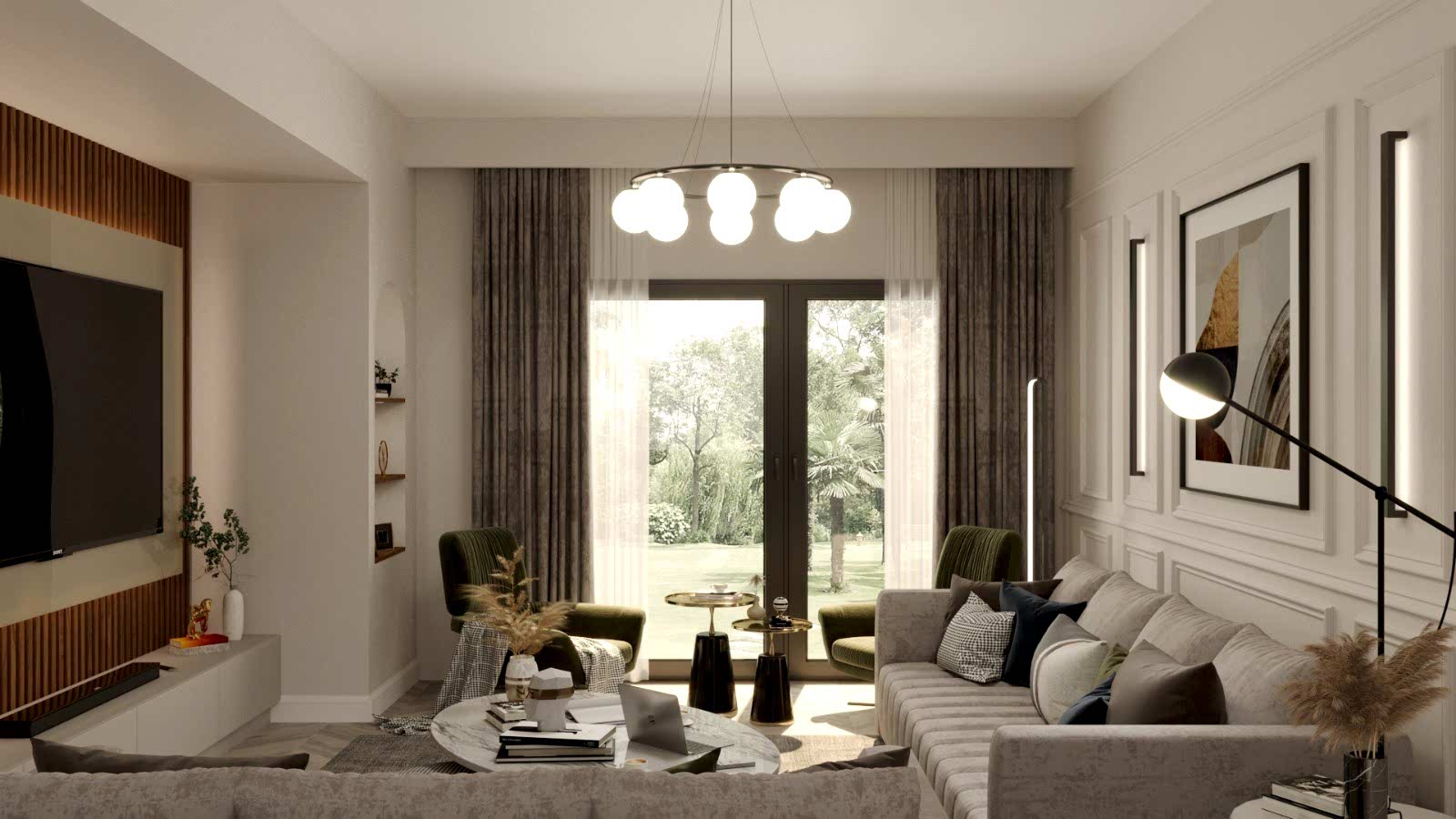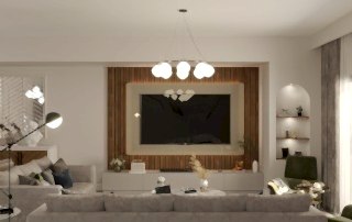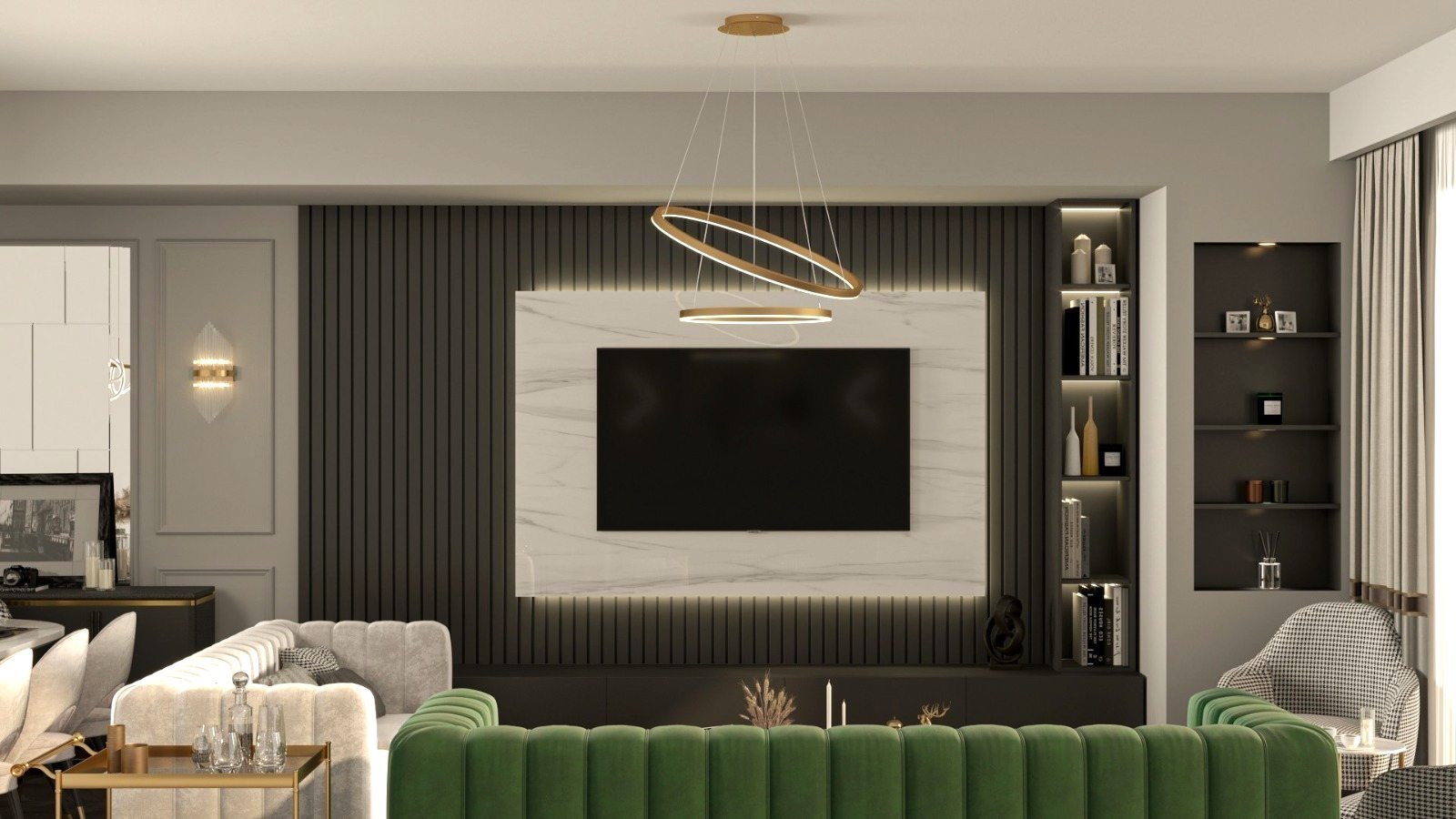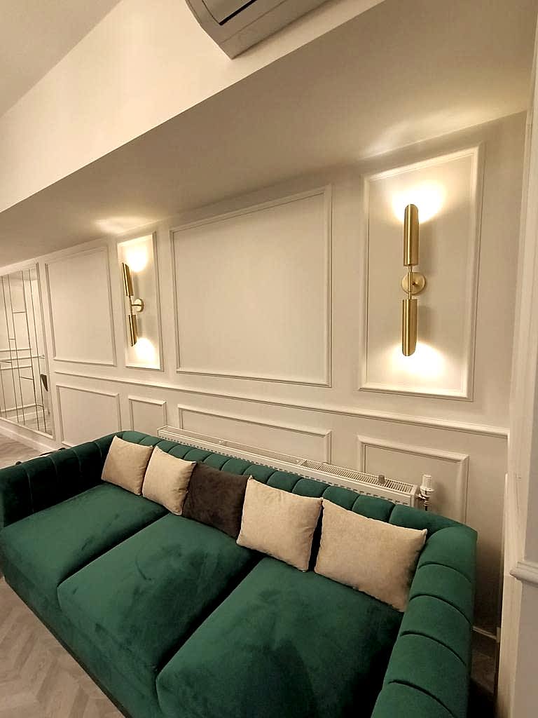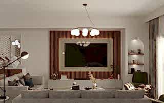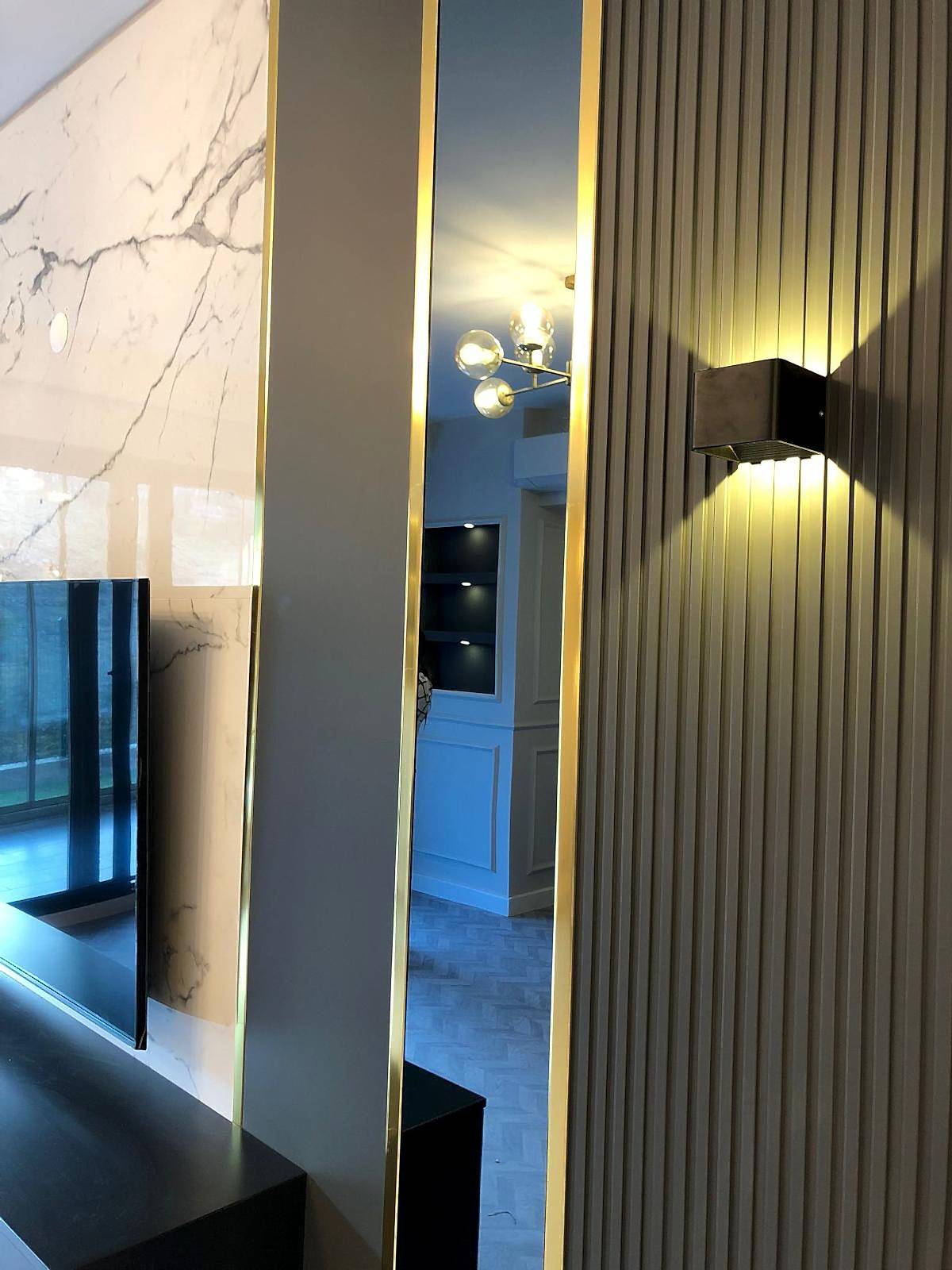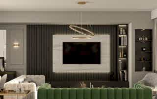 Salon tasarımında, TV duvarı için seramik malzeme ve duvar paneli bir arada kullanılarak, girişteki dresuar ile uyumlu bir TV konsolu tasarlandı. Salonun duvarlarında çıtalama çalışması yapıldı ve çıta içlerine aplikler eklenerek alan daha dinamik hale getirildi. Bu detaylar, mekanın şıklığını ve fonksiyonelliğini artırarak, her açıdan dengeli bir tasarım sundu.