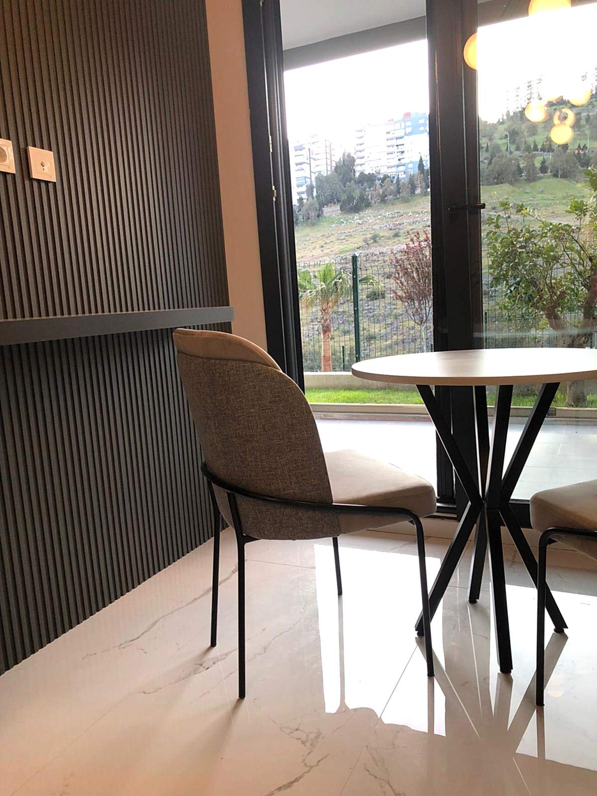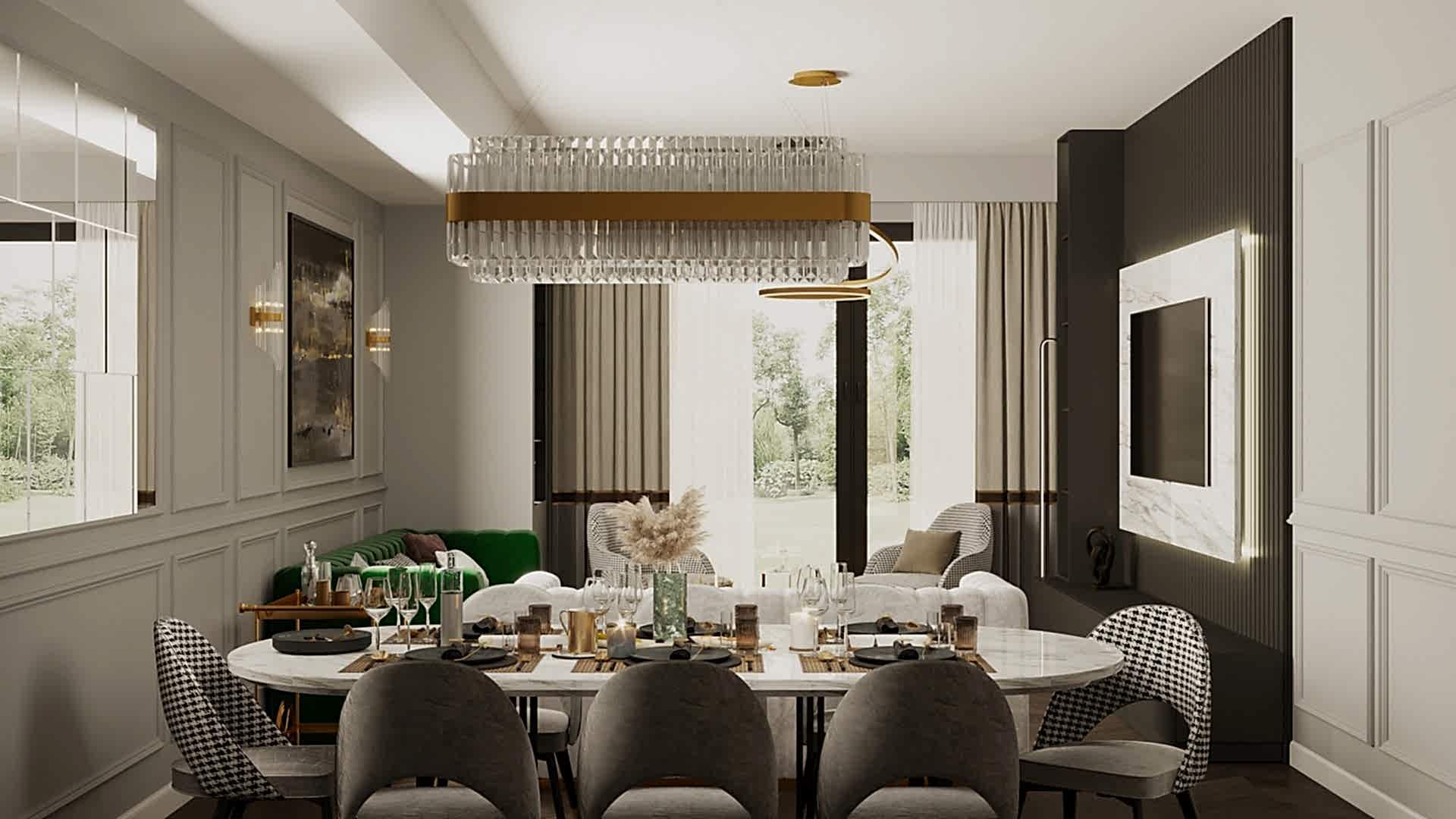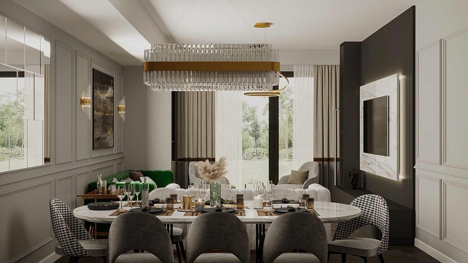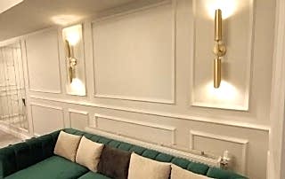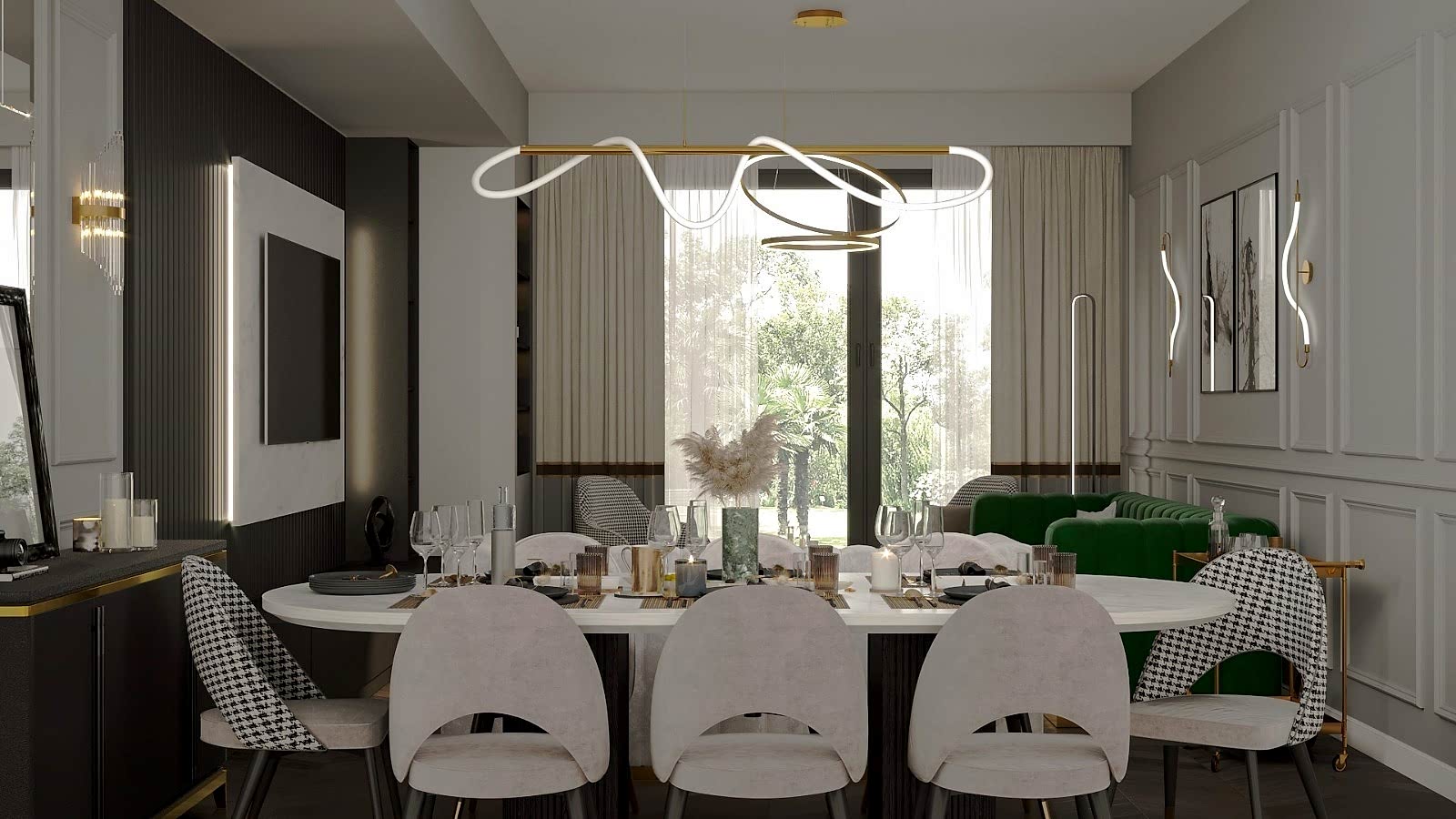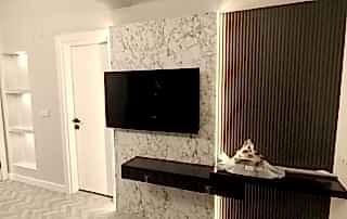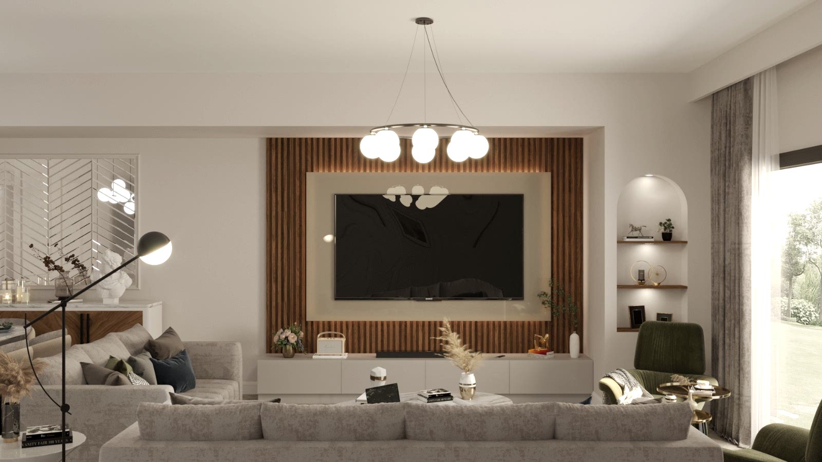 Salon tasarımında, TV duvarı için seramik malzeme ve duvar paneli bir arada kullanılarak, girişteki dresuar ile uyumlu bir TV konsolu tasarlandı. Salonun duvarlarında çıtalama çalışması yapıldı ve çıta içlerine aplikler eklenerek alan daha dinamik hale getirildi. Bu detaylar, mekanın şıklığını ve fonksiyonelliğini artırarak, her açıdan dengeli bir tasarım sundu.