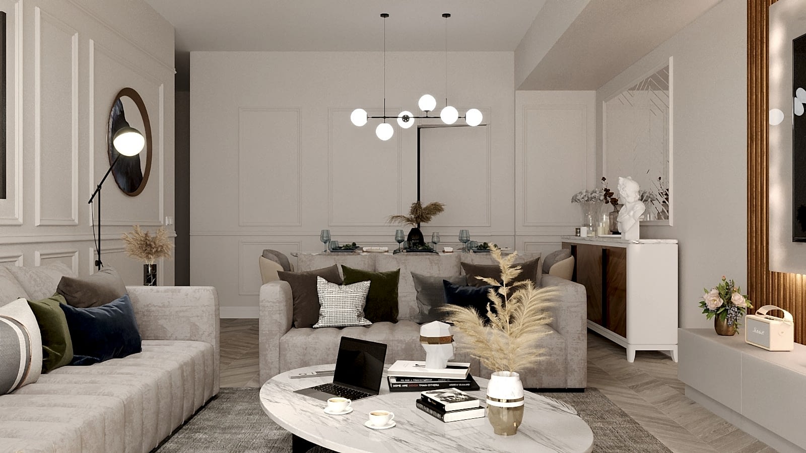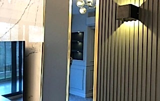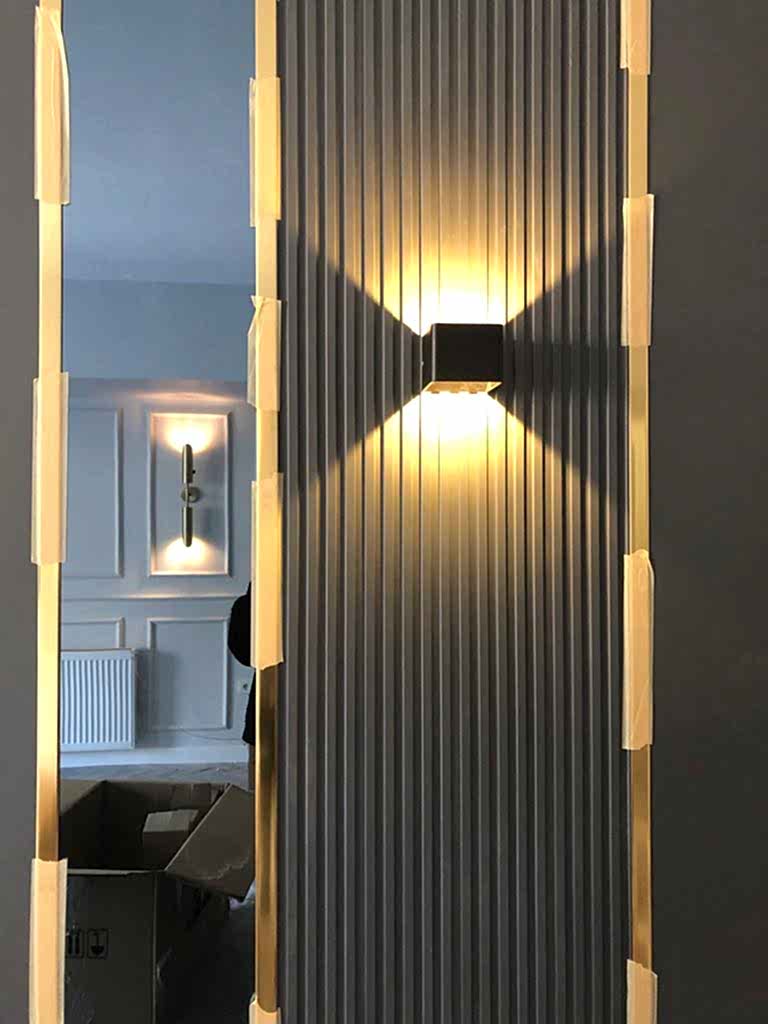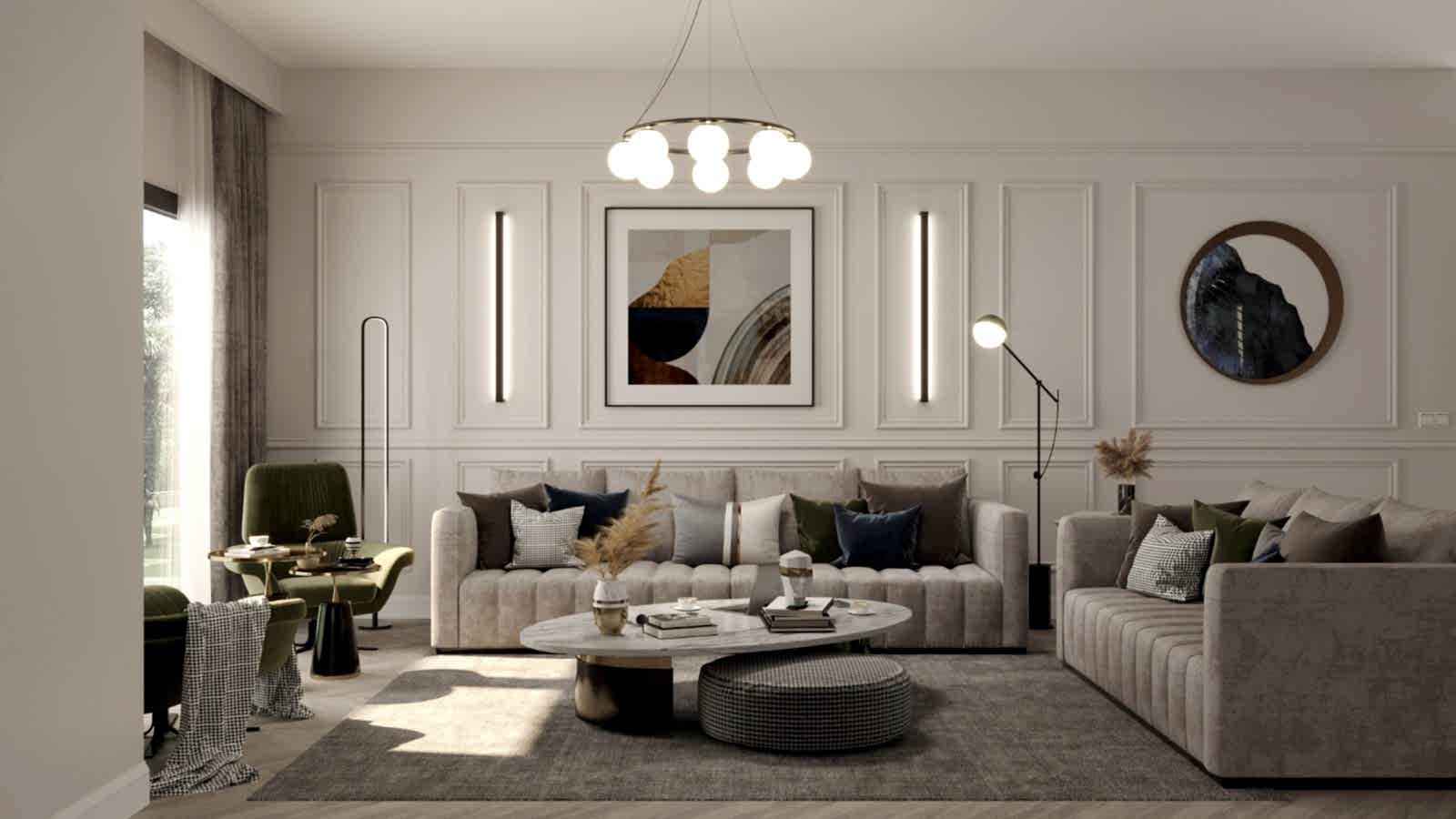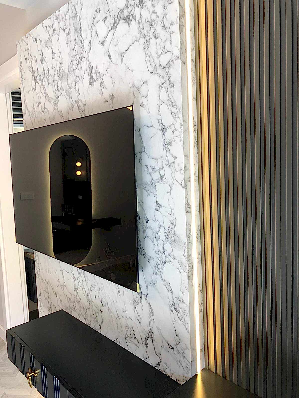 Salon tasarımında, TV duvarı için seramik malzeme ve duvar paneli bir arada kullanılarak, girişteki dresuar ile uyumlu bir TV konsolu tasarlandı. Salonun duvarlarında çıtalama çalışması yapıldı ve çıta içlerine aplikler eklenerek alan daha dinamik hale getirildi. Bu detaylar, mekanın şıklığını ve fonksiyonelliğini artırarak, her açıdan dengeli bir tasarım sundu.