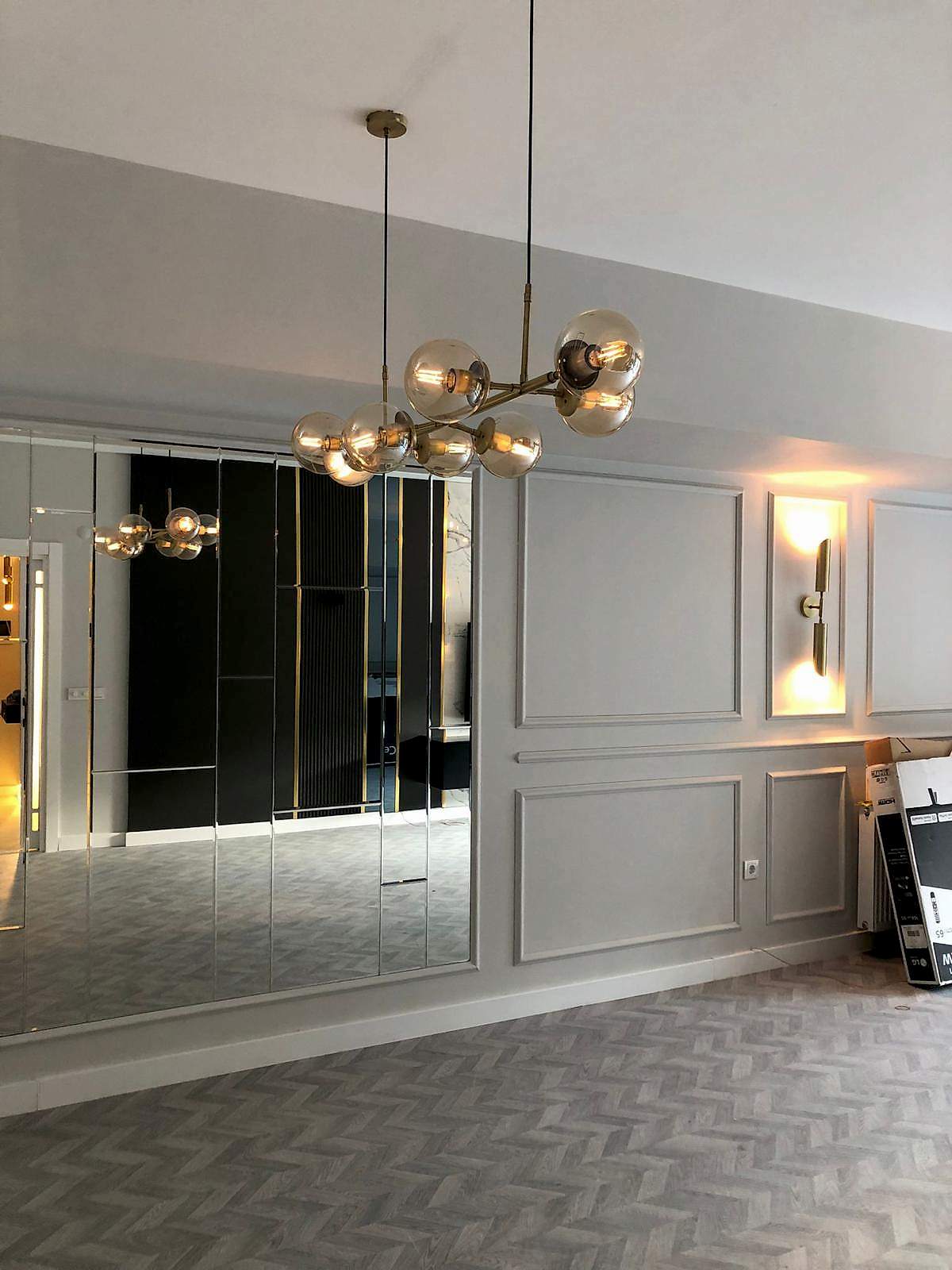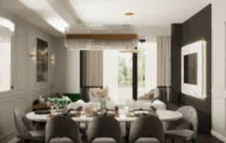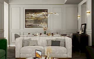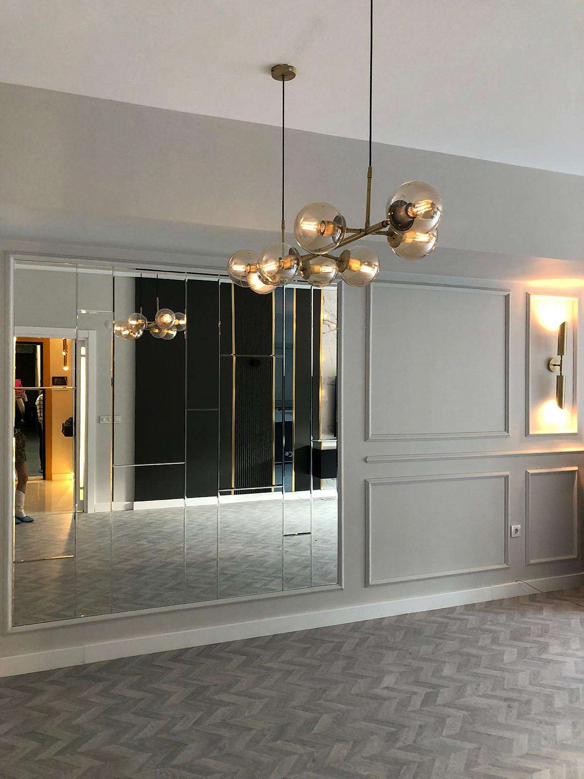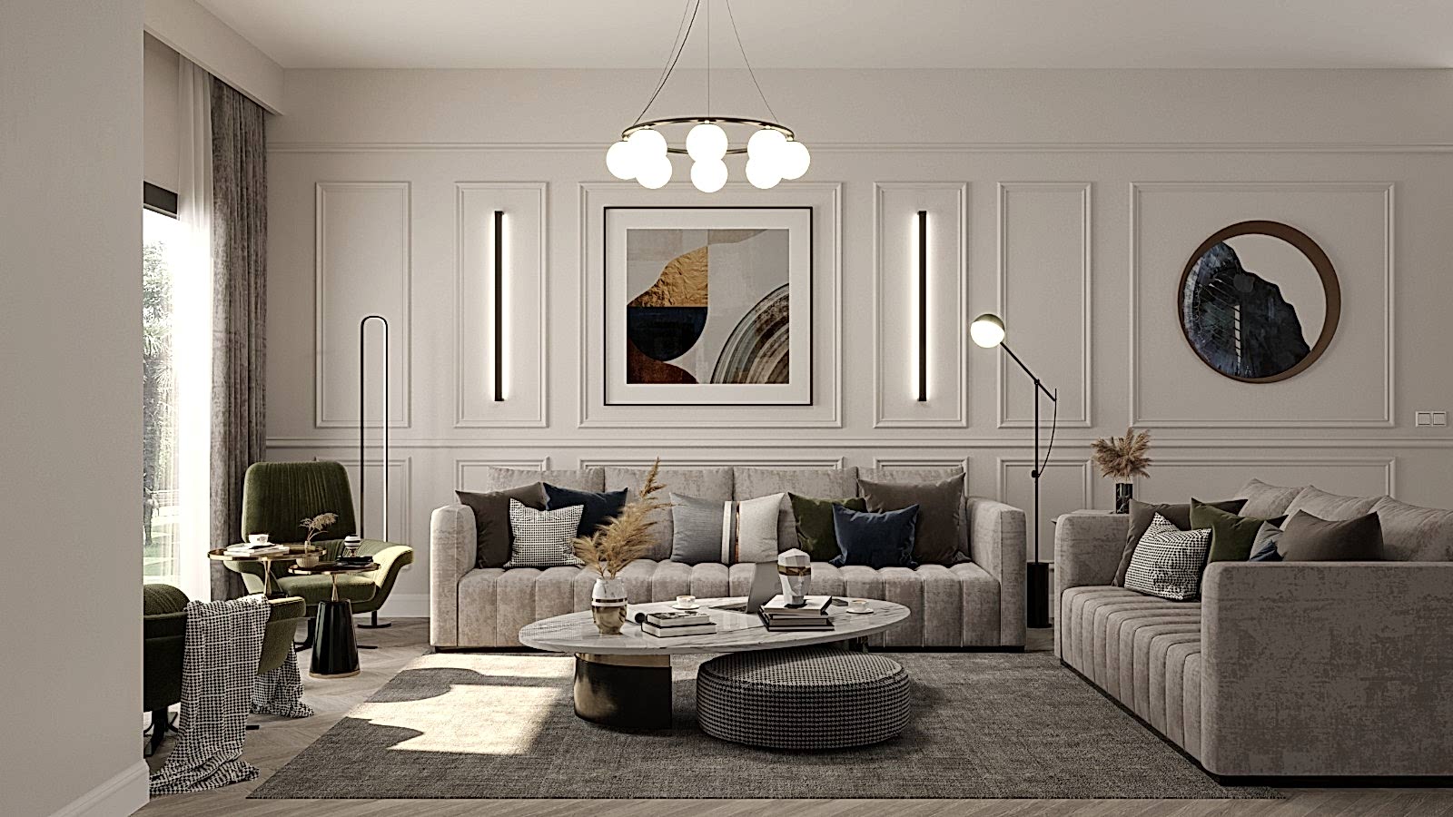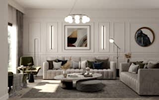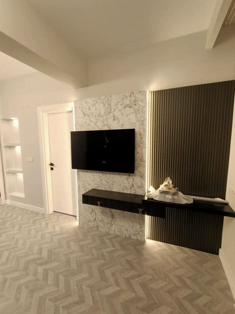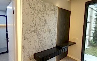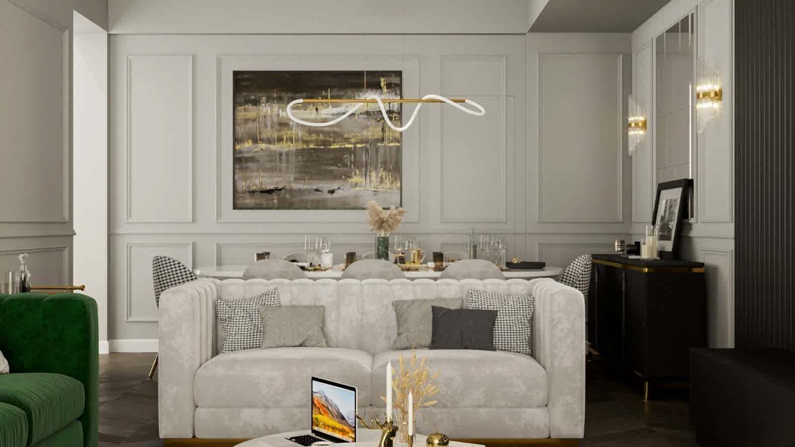 Salon tasarımında, TV duvarı için seramik malzeme ve duvar paneli bir arada kullanılarak, girişteki dresuar ile uyumlu bir TV konsolu tasarlandı. Salonun duvarlarında çıtalama çalışması yapıldı ve çıta içlerine aplikler eklenerek alan daha dinamik hale getirildi. Bu detaylar, mekanın şıklığını ve fonksiyonelliğini artırarak, her açıdan dengeli bir tasarım sundu.