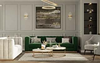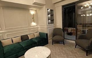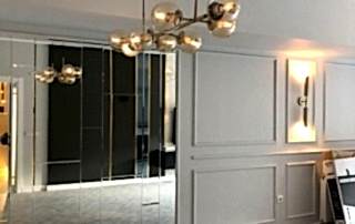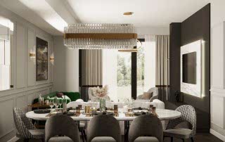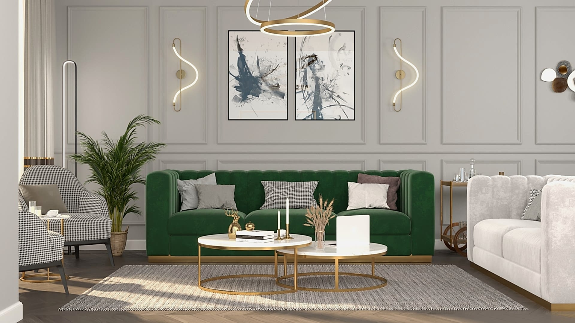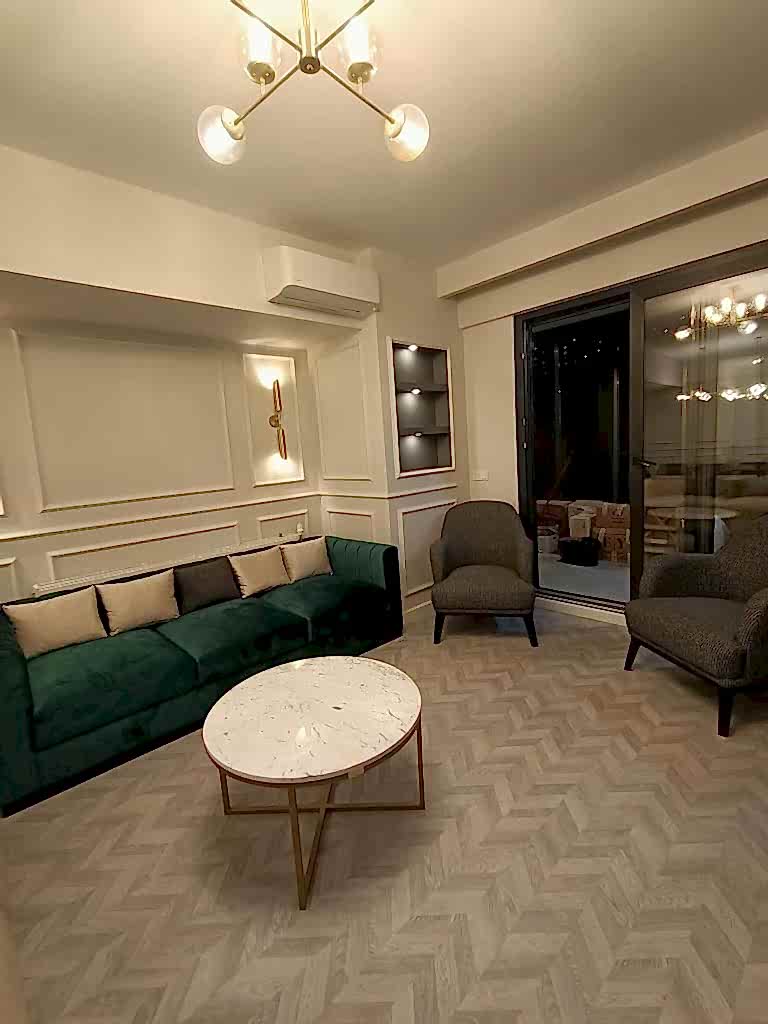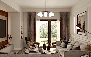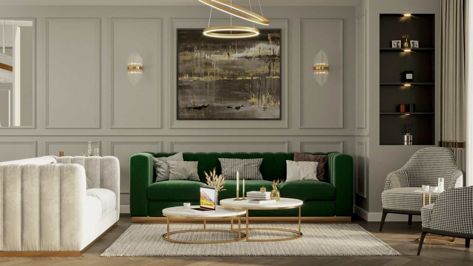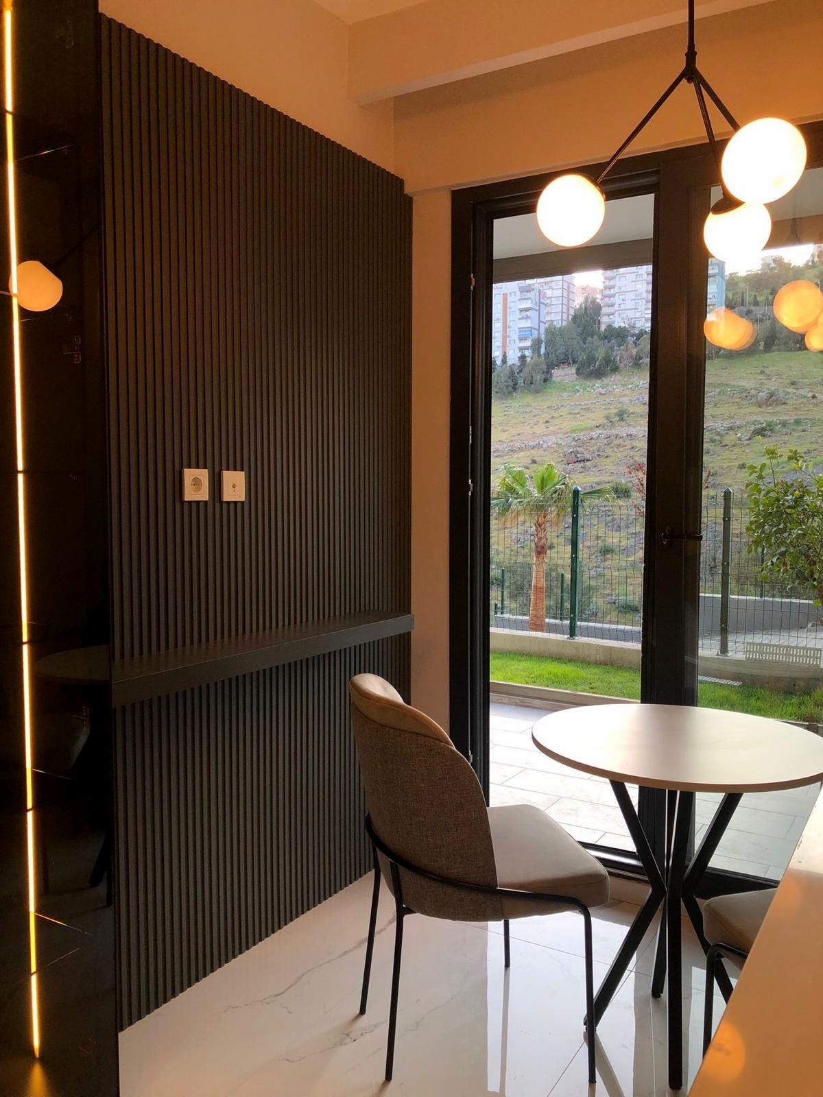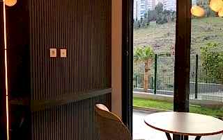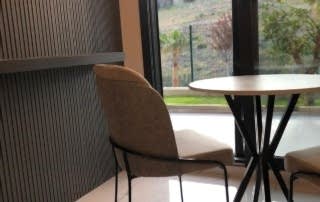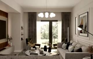 Salon tasarımında, TV duvarı için seramik malzeme ve duvar paneli bir arada kullanılarak, girişteki dresuar ile uyumlu bir TV konsolu tasarlandı. Salonun duvarlarında çıtalama çalışması yapıldı ve çıta içlerine aplikler eklenerek alan daha dinamik hale getirildi. Bu detaylar, mekanın şıklığını ve fonksiyonelliğini artırarak, her açıdan dengeli bir tasarım sundu.