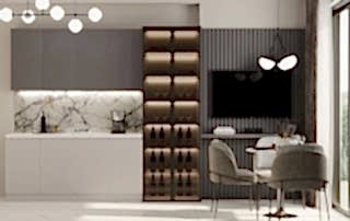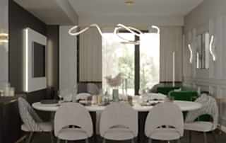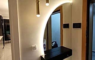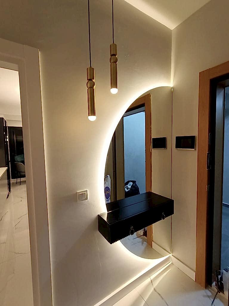Park Yaşam Projesi, modern çizgileri ve fonksiyonel detaylarıyla dikkat çeken zarif bir yaşam alanı sunuyor. Giriş mahallinde, mekan hacmi göz önünde bulundurularak minimal ayaksız, duvara monte edilmiş bir dresuar tasarlandı. Bu dresuarın arkasında, led aydınlatmalı yarım daire bir ayna kullanıldı ve sarkıt aydınlatmalarla tasarım bütünlüğü sağlandı. Böylece giriş alanı, hem görsel olarak ferah hem de modern bir atmosfer kazandı.