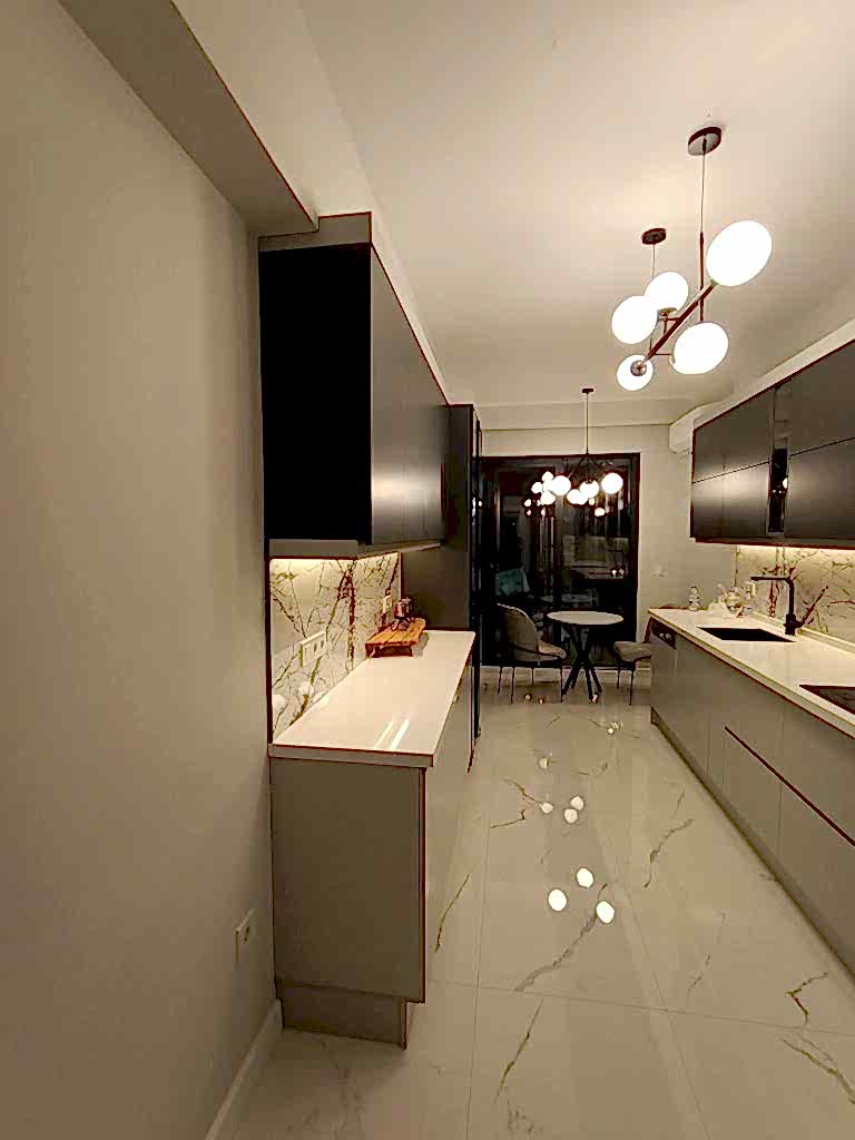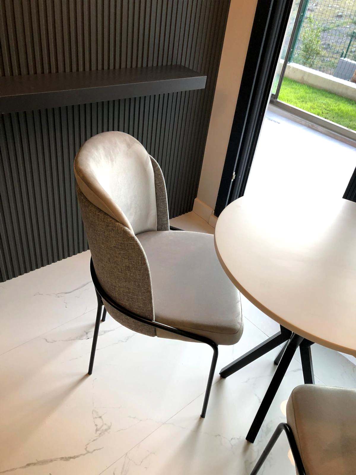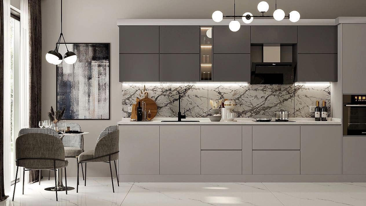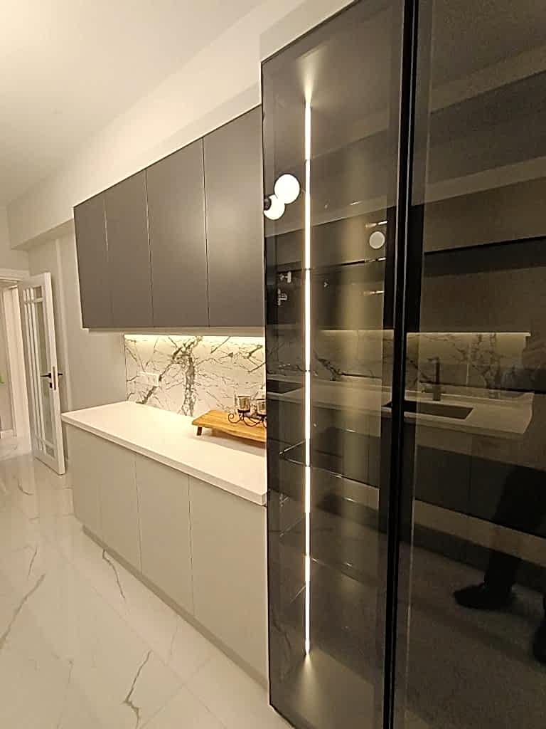 Mutfakta, gri renk paleti tercih edilerek, pişirme ve hazırlık amaçlarının ötesinde, tasarımı duvar panelleriyle desteklenmiş bir yemek yeme alanı oluşturuldu. Bu, mutfağa modern bir dokunuş eklerken aynı zamanda mekanın kullanımını daha rahat hale getirdi.