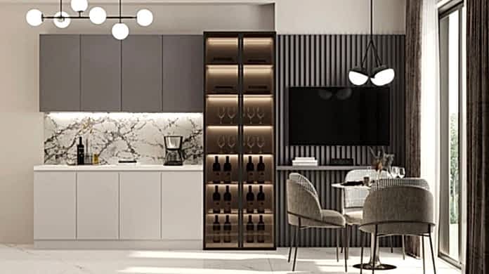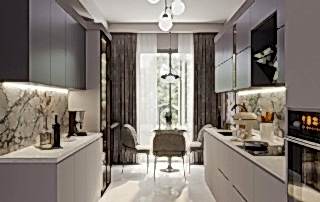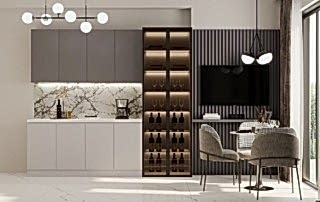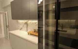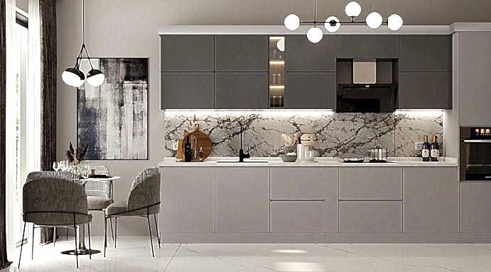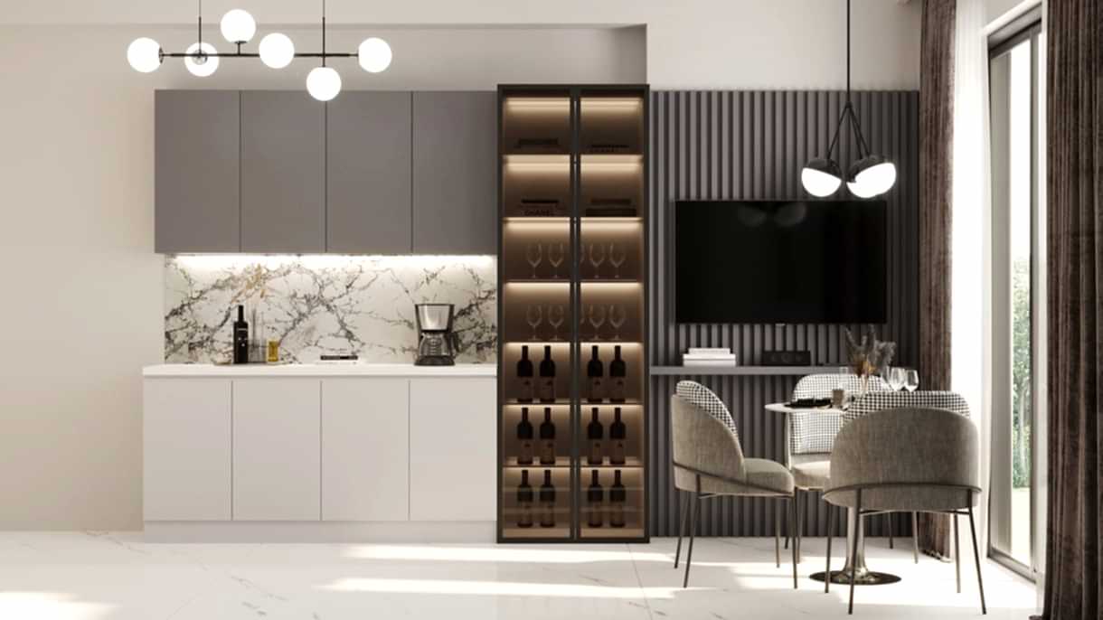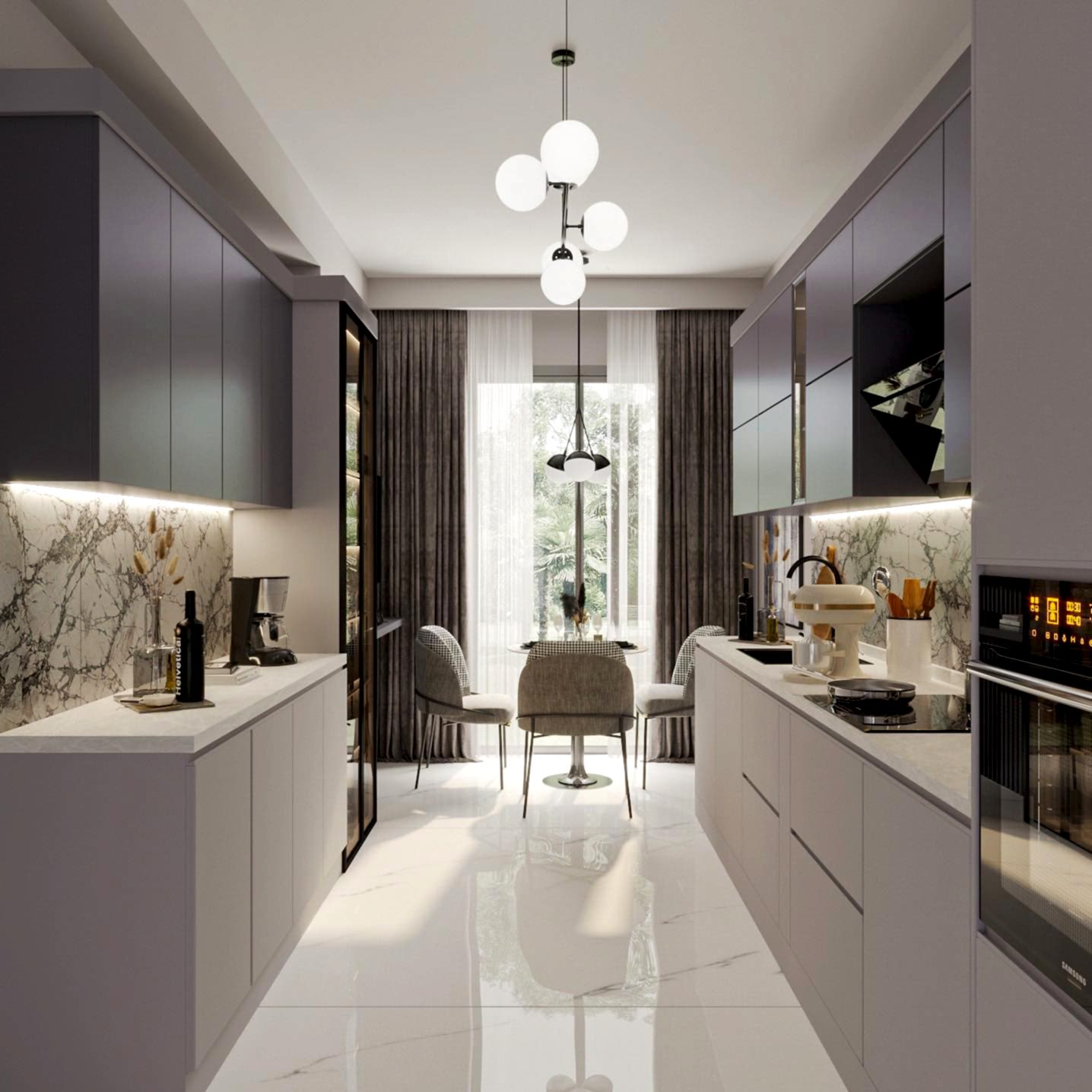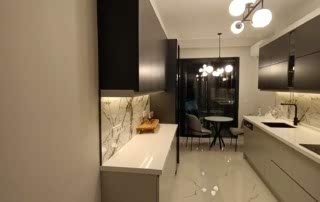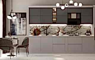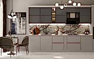 Mutfakta, gri renk paleti tercih edilerek, pişirme ve hazırlık amaçlarının ötesinde, tasarımı duvar panelleriyle desteklenmiş bir yemek yeme alanı oluşturuldu. Bu, mutfağa modern bir dokunuş eklerken aynı zamanda mekanın kullanımını daha rahat hale getirdi.