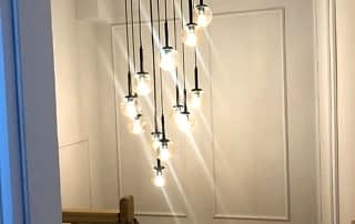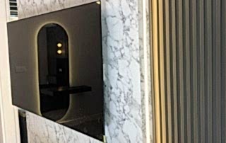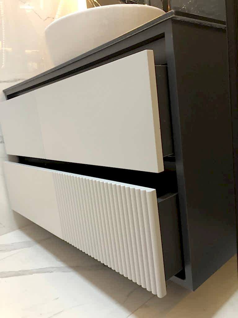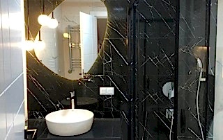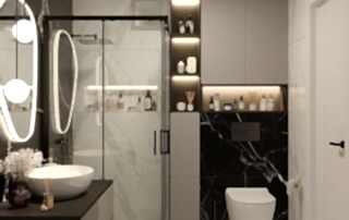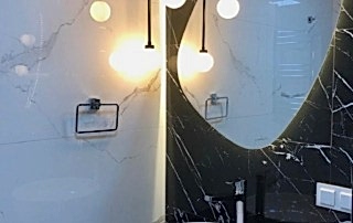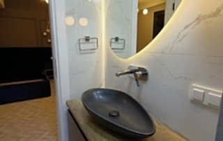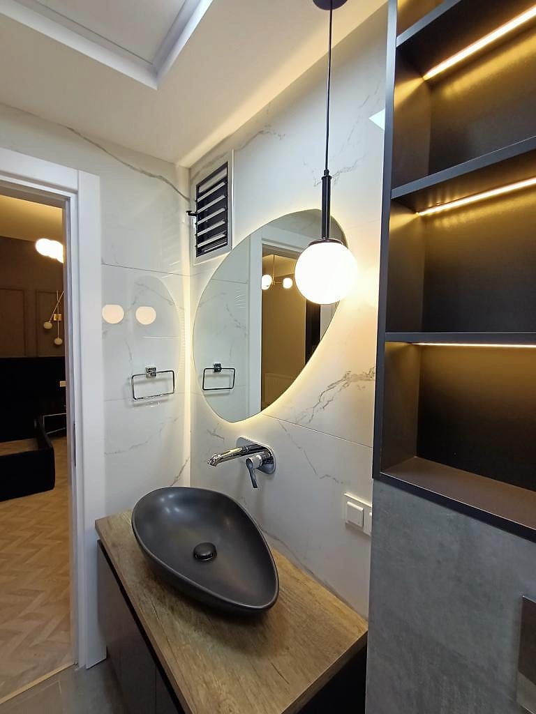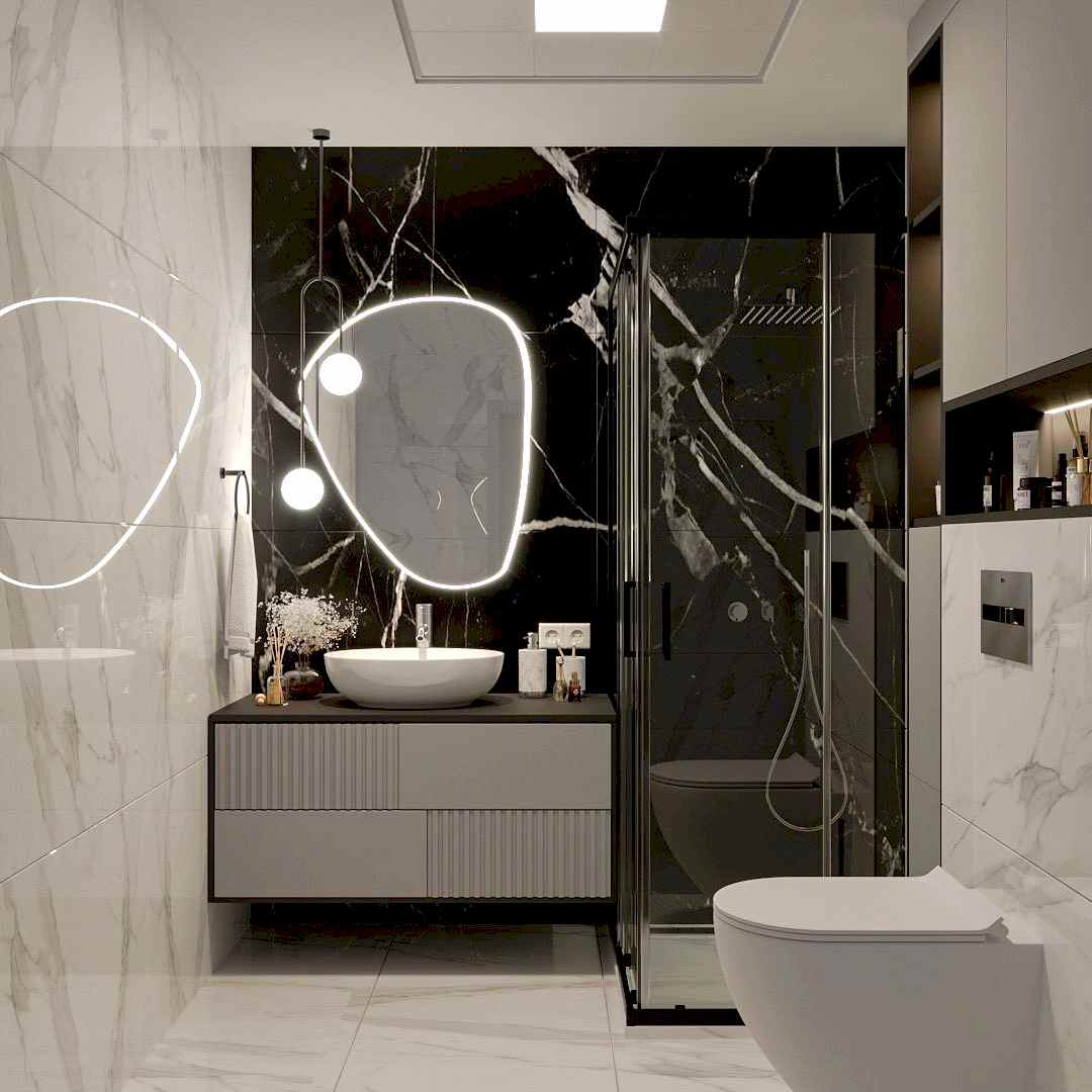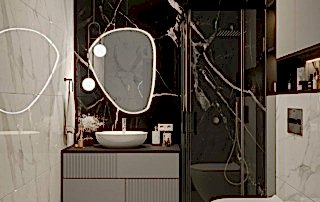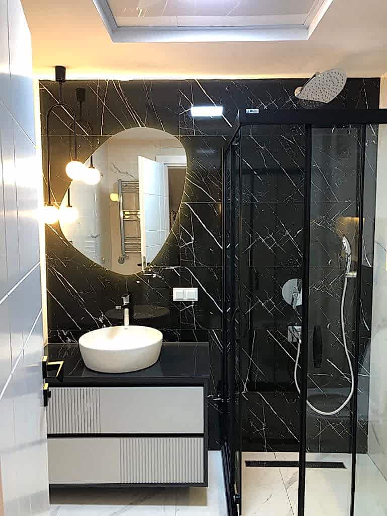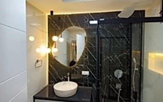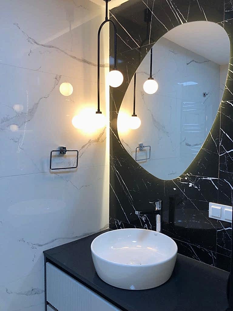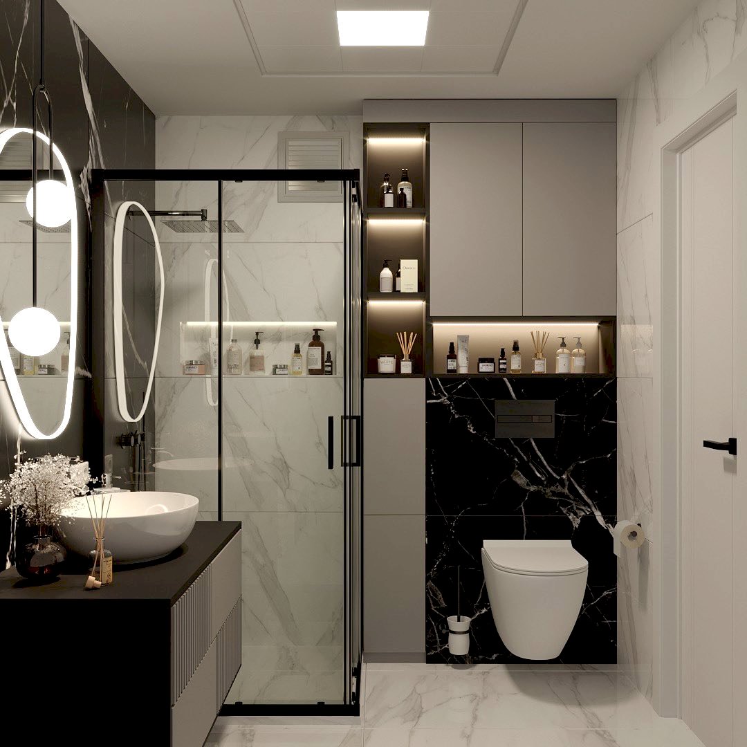Banyoda, modern çizgilere sadık kalınarak malzeme seçimleri yapıldı. Hilton dolaplar üzerinde kullanılan ledli asimetrik aynalar ve sarkıt aydınlatmalar, mekana zarif bir estetik katarken, fugalı çekmece tasarımı ise fonksiyonellik sundu. Hilton duvarı ve duş alanının bir kısmı, farklı renk seramiklerle vurgulanarak, tasarımın görsel zenginliği artırıldı.