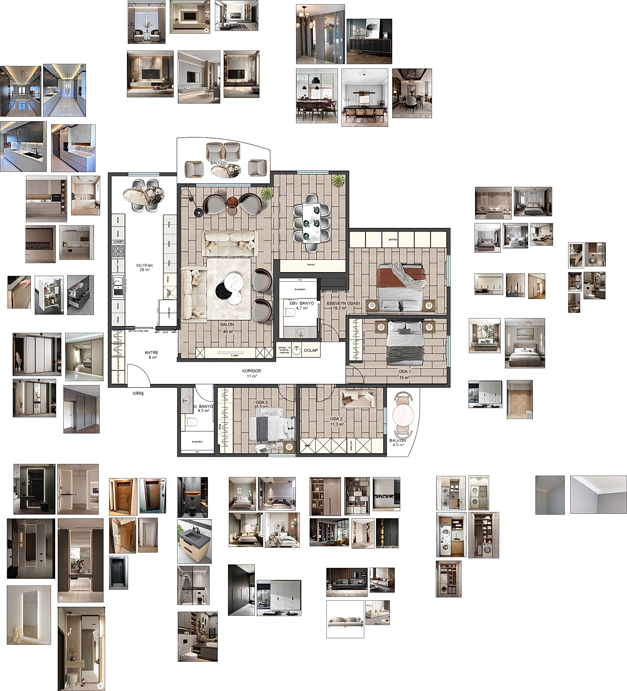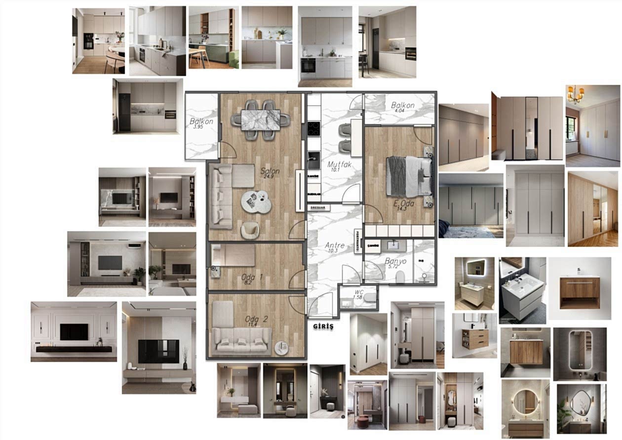 İç mimari hizmetlerimizde sadece estetik kaygıları değil, aynı zamanda mekânların kullanım ihtiyaçlarını da gözetiyoruz. TV alanı, oturma ve yemek bölümleri gibi fonksiyonel alanların tasarımında dengeli yerleşim planları oluşturuyoruz. Ekstra olarak okuma köşeleri, şömine alanları ve depolama çözümleri ile mekânlara kişiselleştirilmiş dokunuşlar katıyoruz.