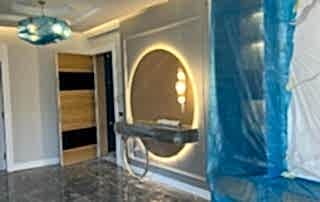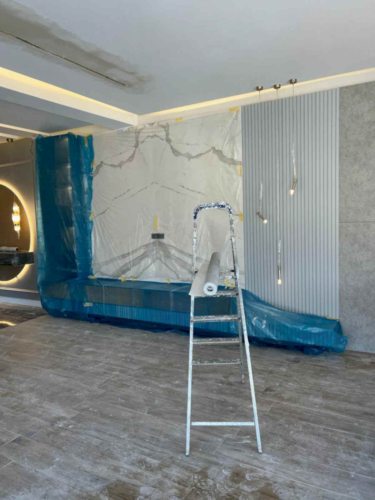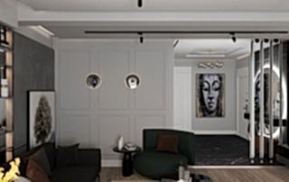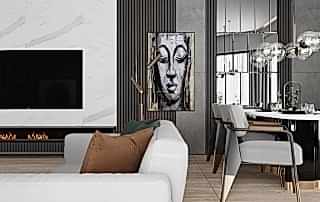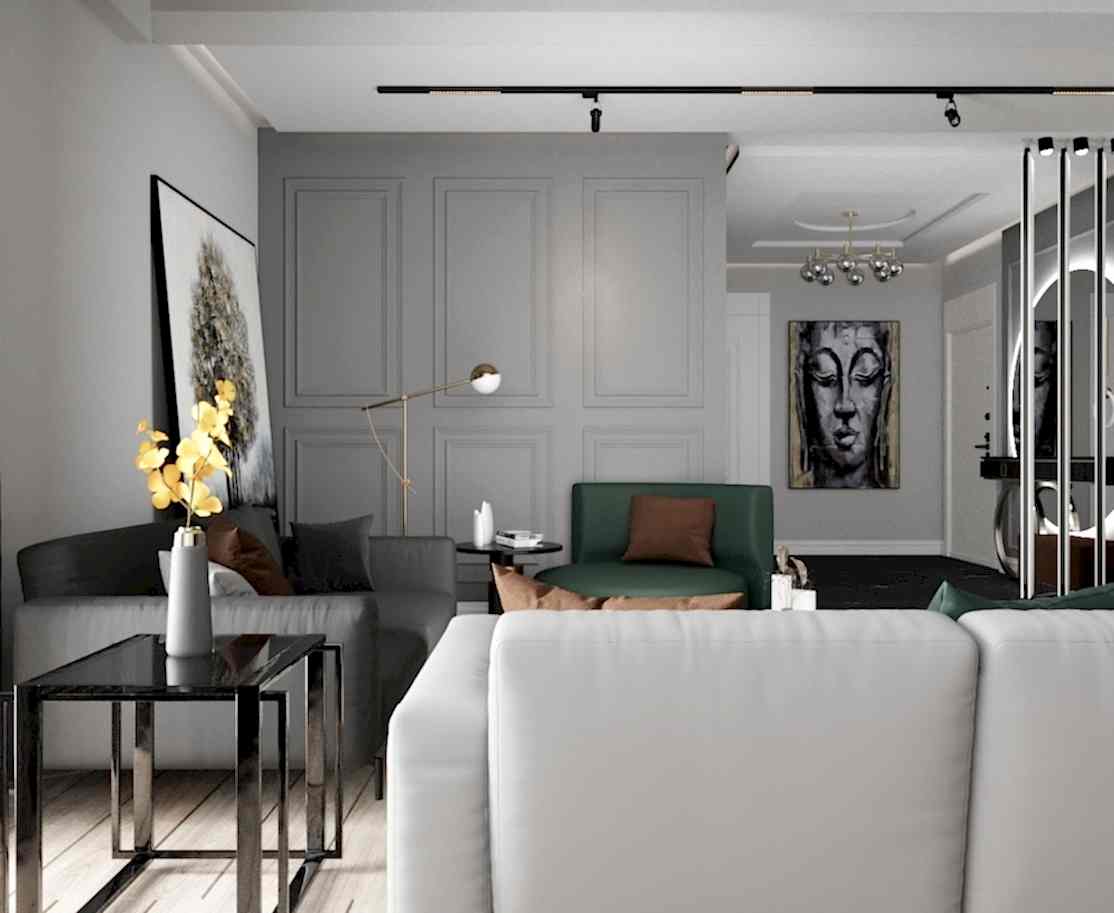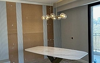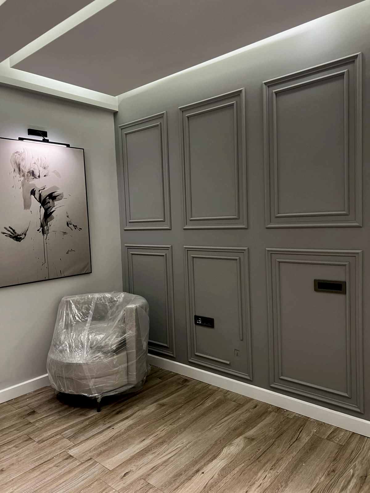 Girişteki çıtalama çalışmaları, salon alanında da devam ettirilerek mekânın görsel uyumunu artırıyor. Bu çalışmalara, tablolar ve tablo aydınlatmaları eklenerek salonun dekorasyonu zenginleştirilmiş. Tablolar, duvarın şıklığını pekiştirirken, aydınlatmalar da sanat eserlerini ön plana çıkarıyor.
