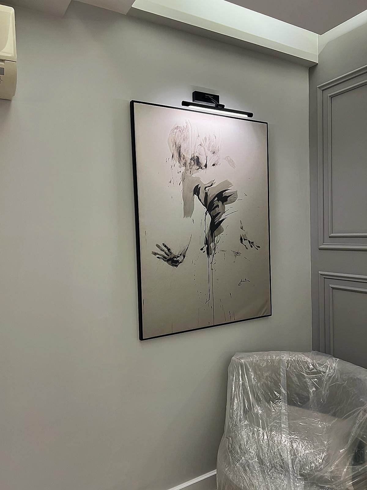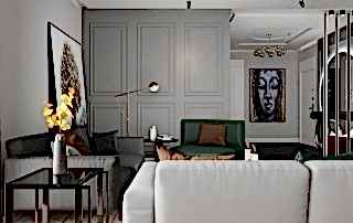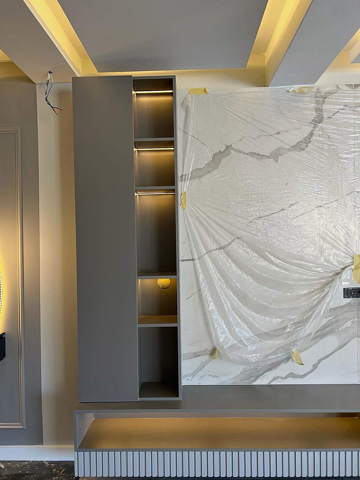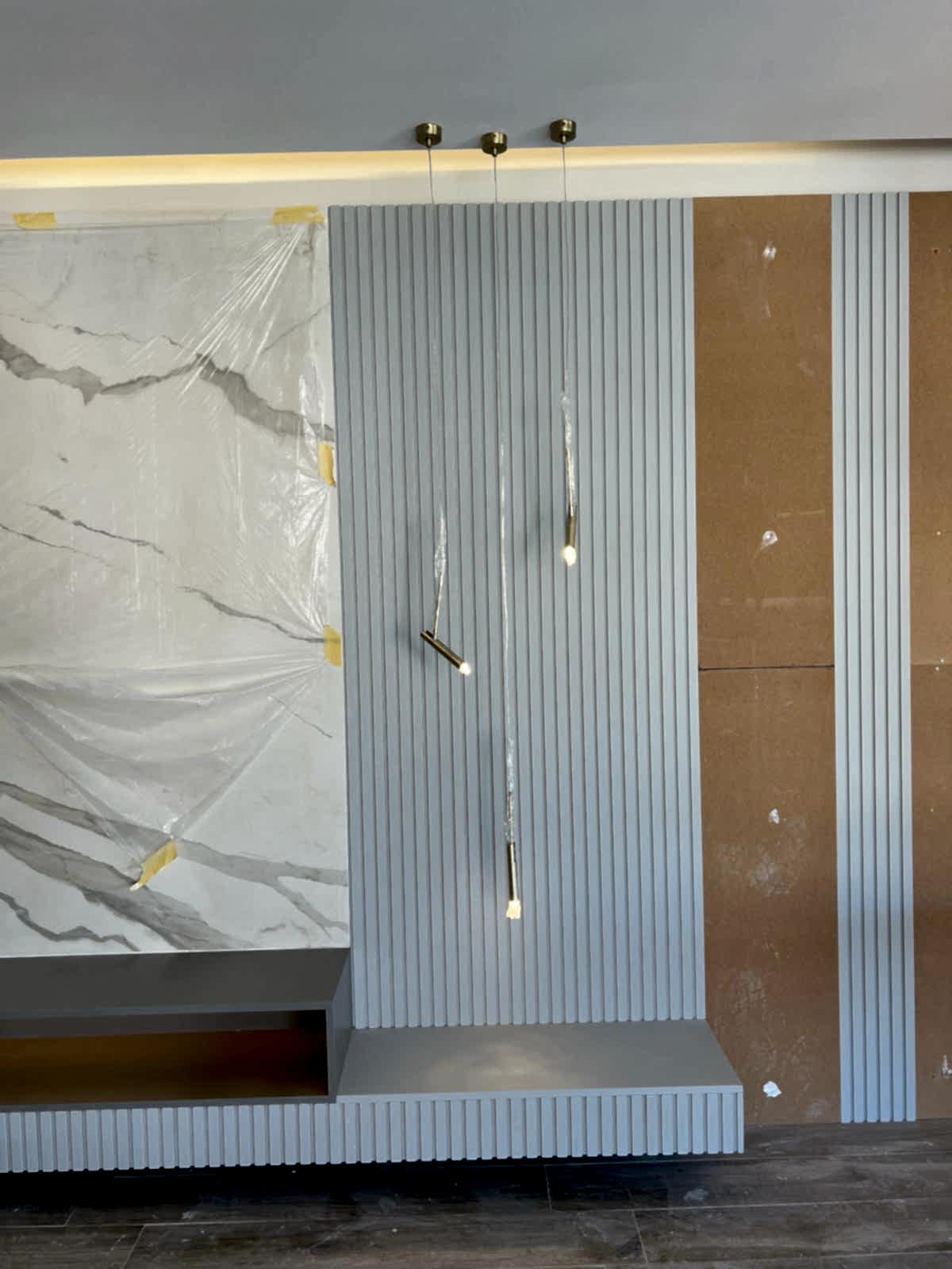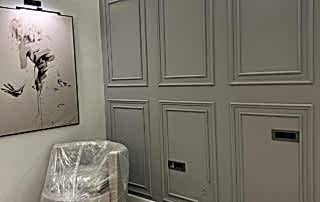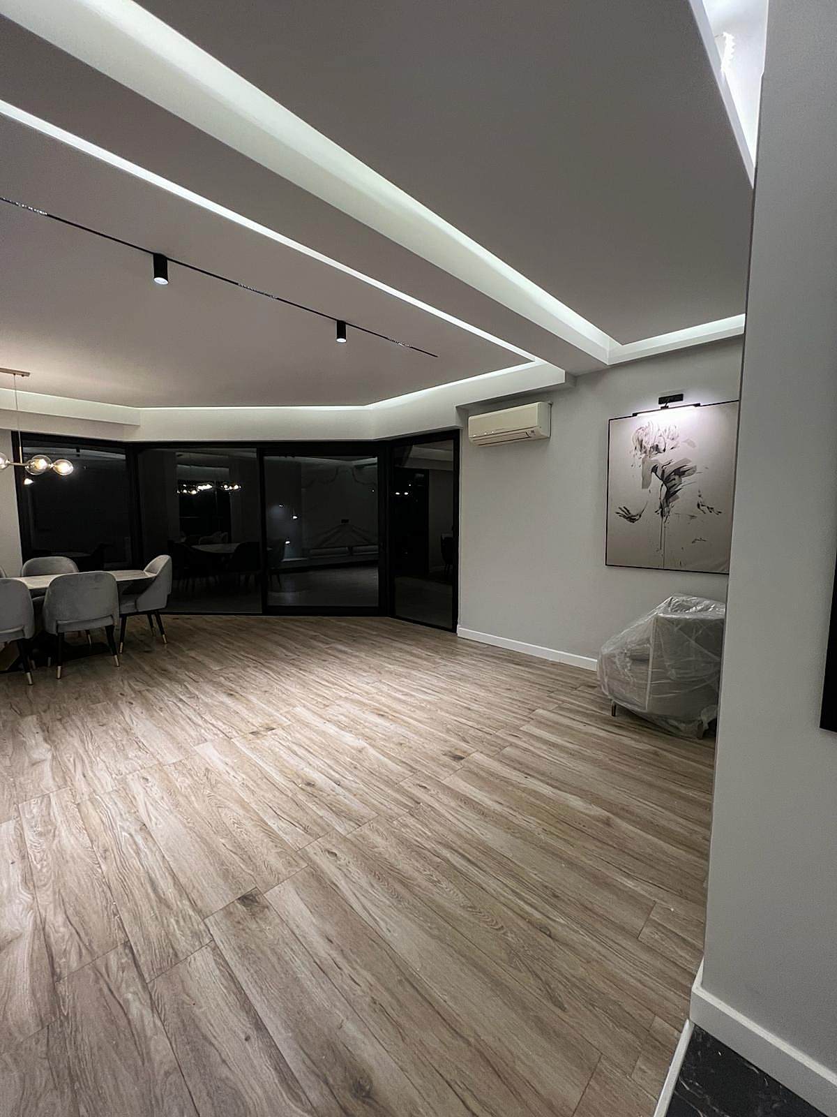 Girişteki çıtalama çalışmaları, salon alanında da devam ettirilerek mekânın görsel uyumunu artırıyor. Bu çalışmalara, tablolar ve tablo aydınlatmaları eklenerek salonun dekorasyonu zenginleştirilmiş. Tablolar, duvarın şıklığını pekiştirirken, aydınlatmalar da sanat eserlerini ön plana çıkarıyor.