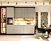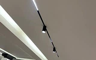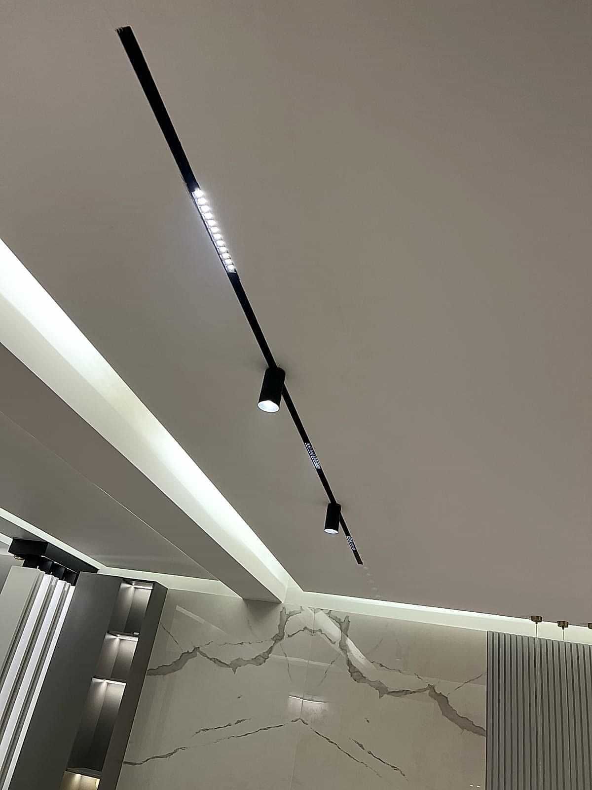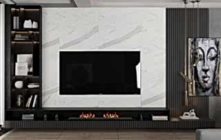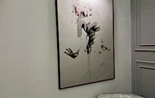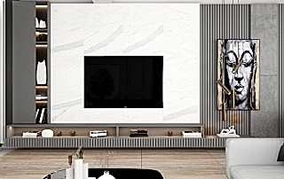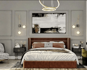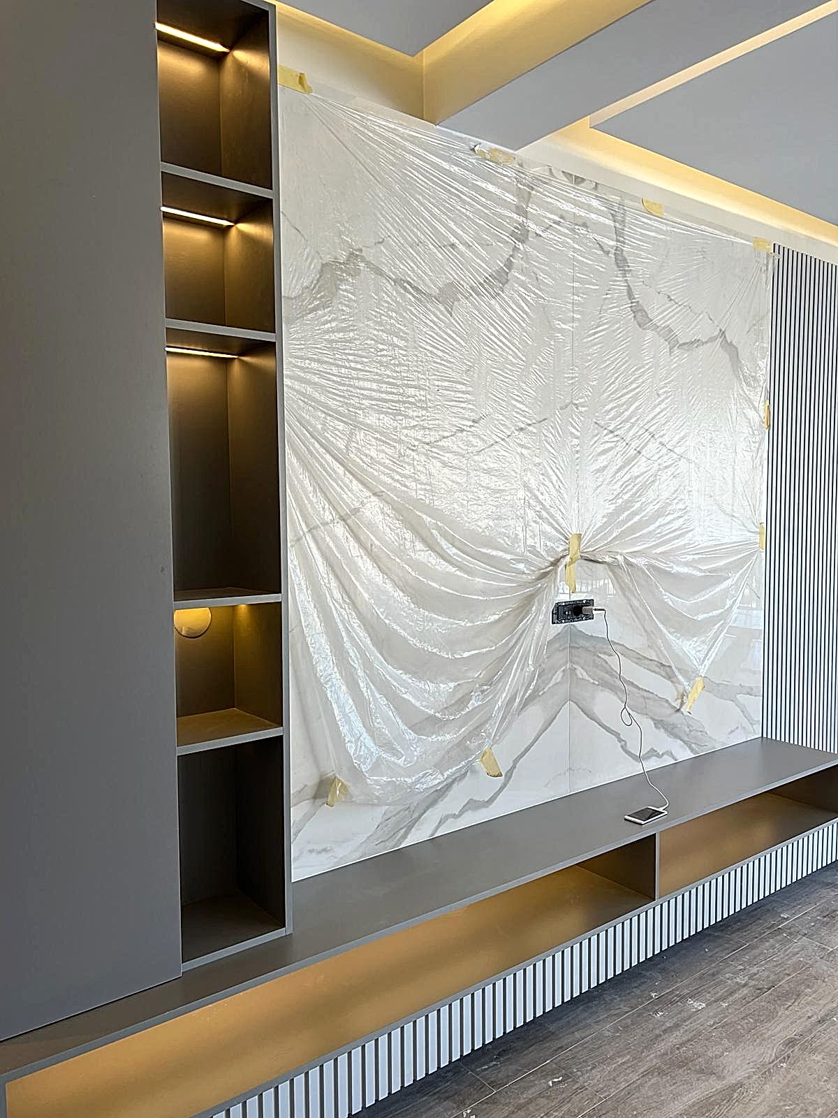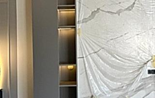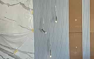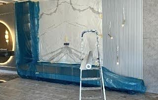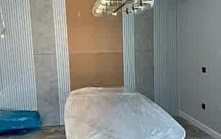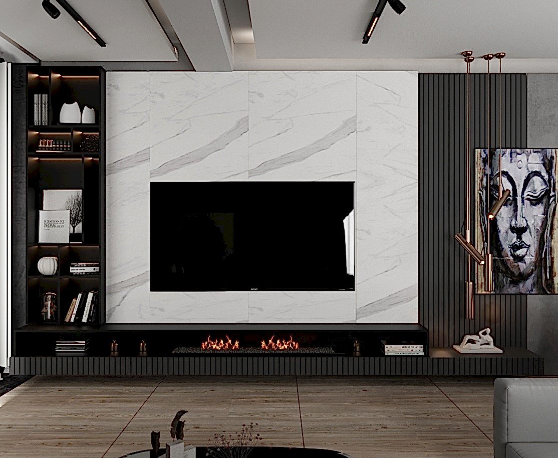 Girişteki çıtalama çalışmaları, salon alanında da devam ettirilerek mekânın görsel uyumunu artırıyor. Bu çalışmalara, tablolar ve tablo aydınlatmaları eklenerek salonun dekorasyonu zenginleştirilmiş. Tablolar, duvarın şıklığını pekiştirirken, aydınlatmalar da sanat eserlerini ön plana çıkarıyor.