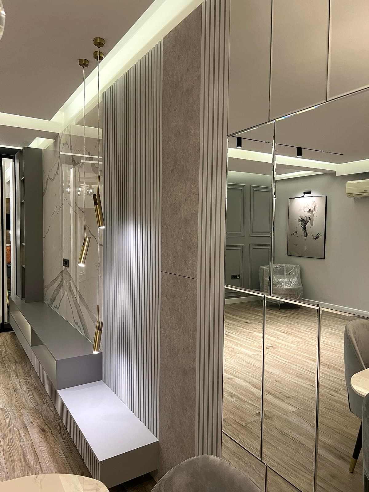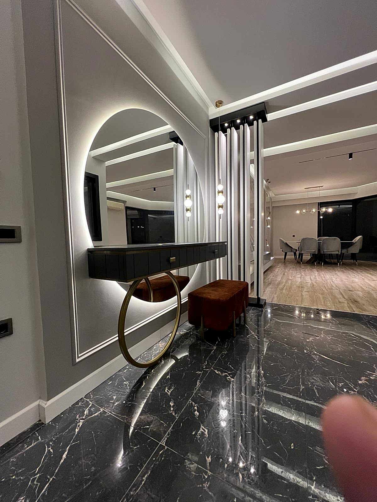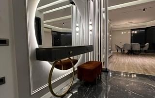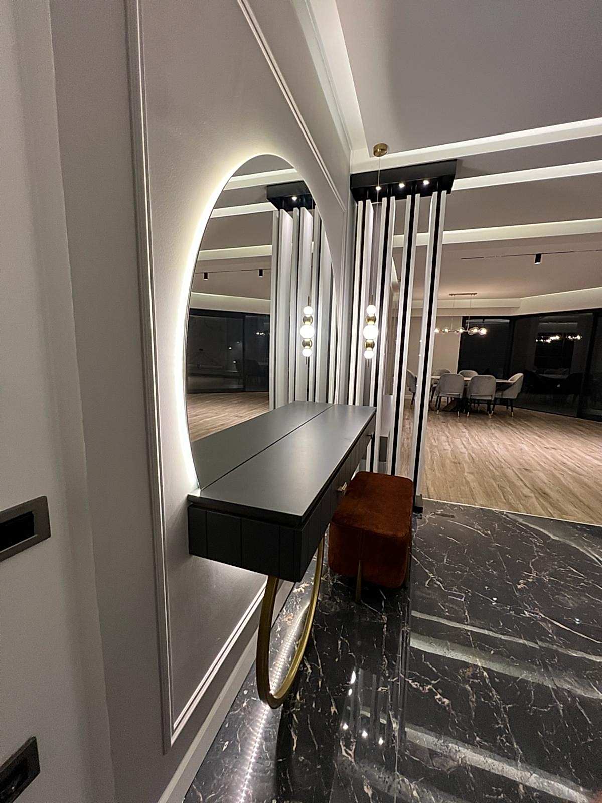 Giriş alanında, çember metal ayaklı dresuar, şıklığı ve modernliğiyle mekânın odak noktalarından biri haline geliyor. Dresuarın arkasındaki ayna, aynı formda tasarlanarak dresuar ile mükemmel bir uyum yakalıyor ve böylece bir bütünlük sağlanıyor. Ayrıca, bu alanda kullanılan şık aydınlatma, girişin atmosferini tamamlayarak modern tasarım anlayışını pekiştiriyor. Çıtalama çalışması ise tasarımdaki bütünlüğü ve şıklığı destekliyor, mekâna sıcak ve zarif bir hava katıyor.