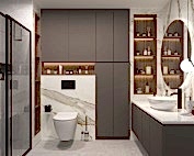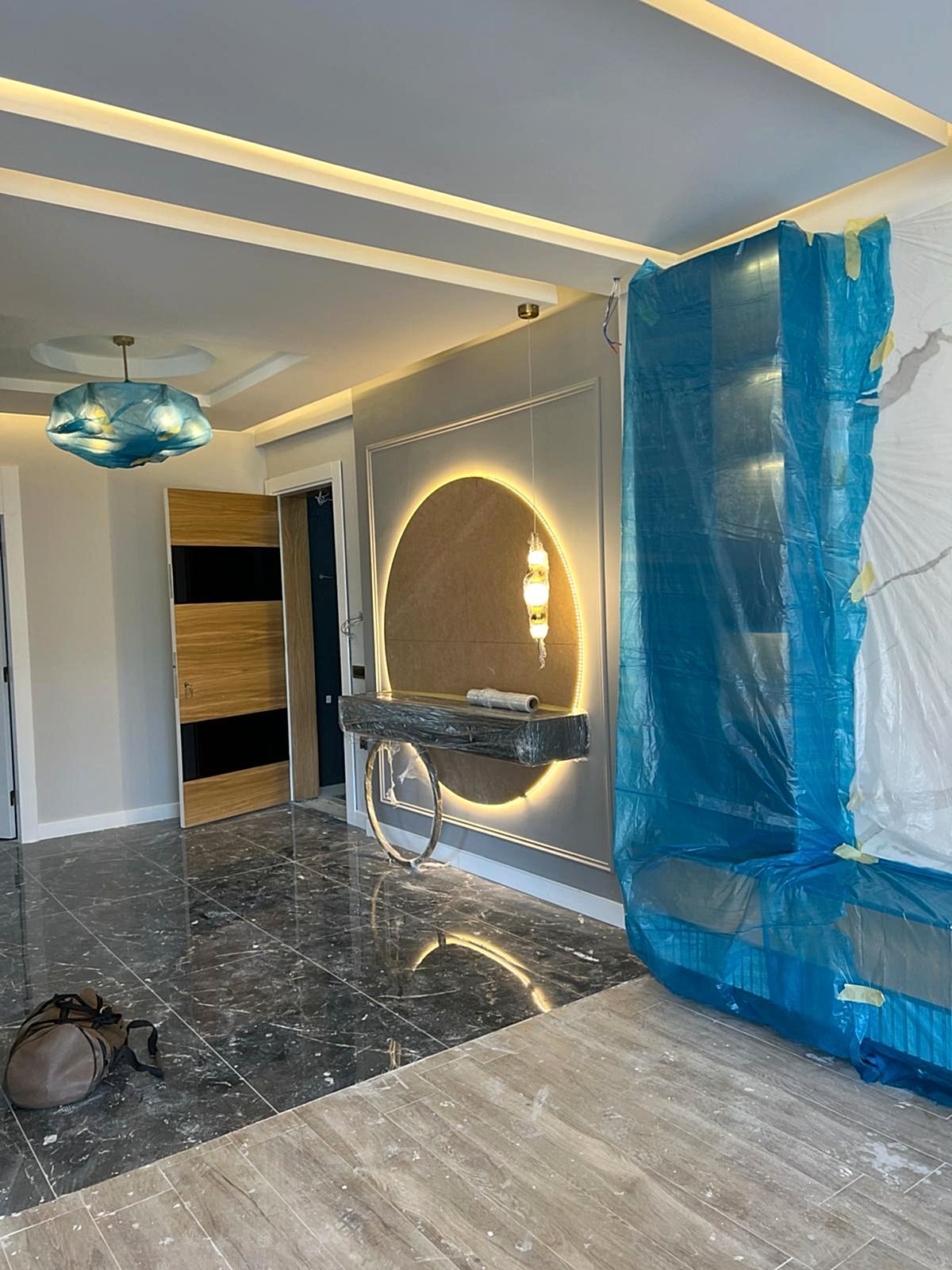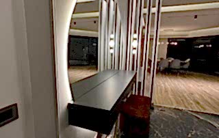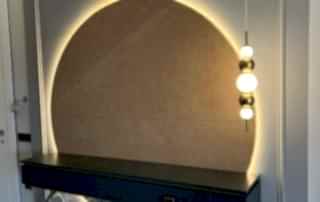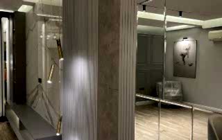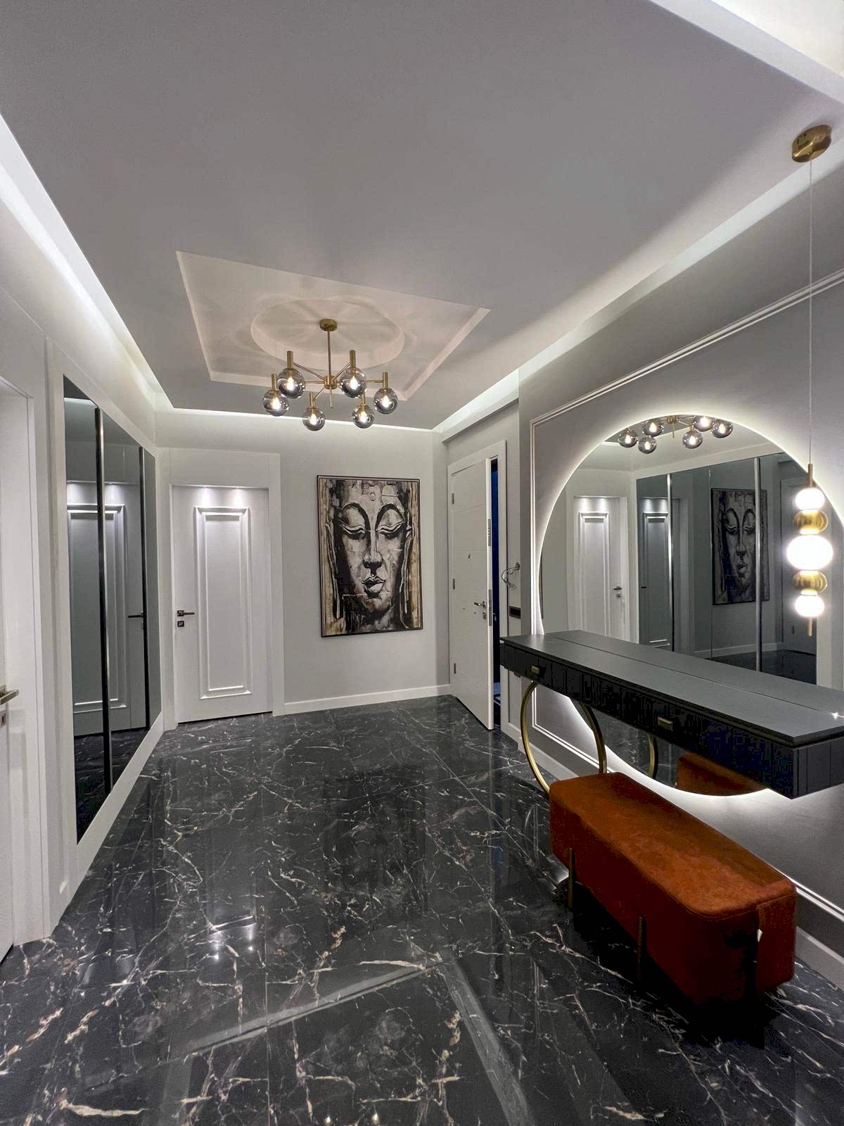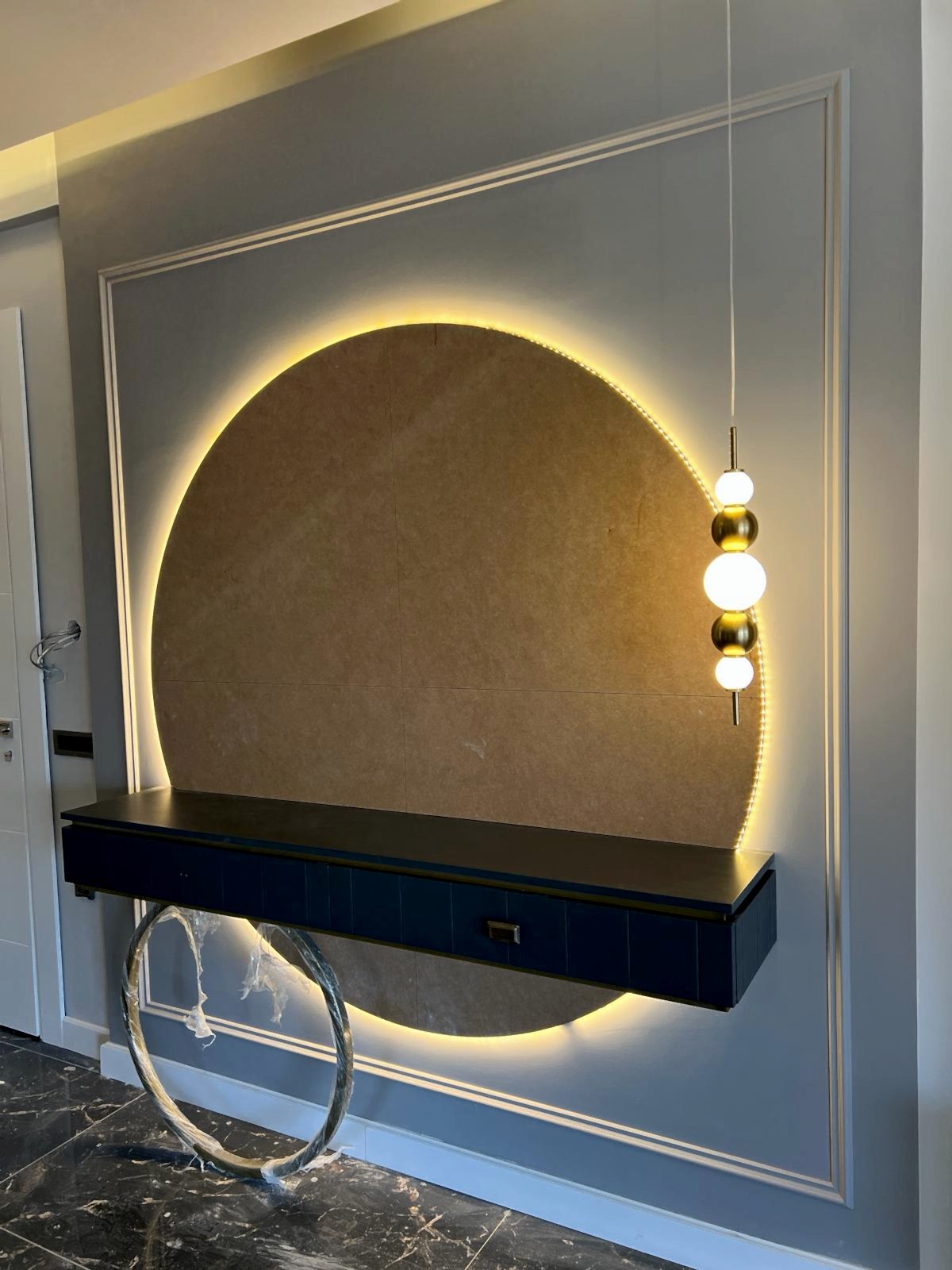 Giriş alanında, çember metal ayaklı dresuar, şıklığı ve modernliğiyle mekânın odak noktalarından biri haline geliyor. Dresuarın arkasındaki ayna, aynı formda tasarlanarak dresuar ile mükemmel bir uyum yakalıyor ve böylece bir bütünlük sağlanıyor. Ayrıca, bu alanda kullanılan şık aydınlatma, girişin atmosferini tamamlayarak modern tasarım anlayışını pekiştiriyor. Çıtalama çalışması ise tasarımdaki bütünlüğü ve şıklığı destekliyor, mekâna sıcak ve zarif bir hava katıyor.