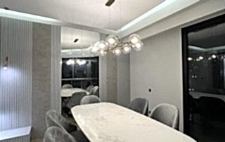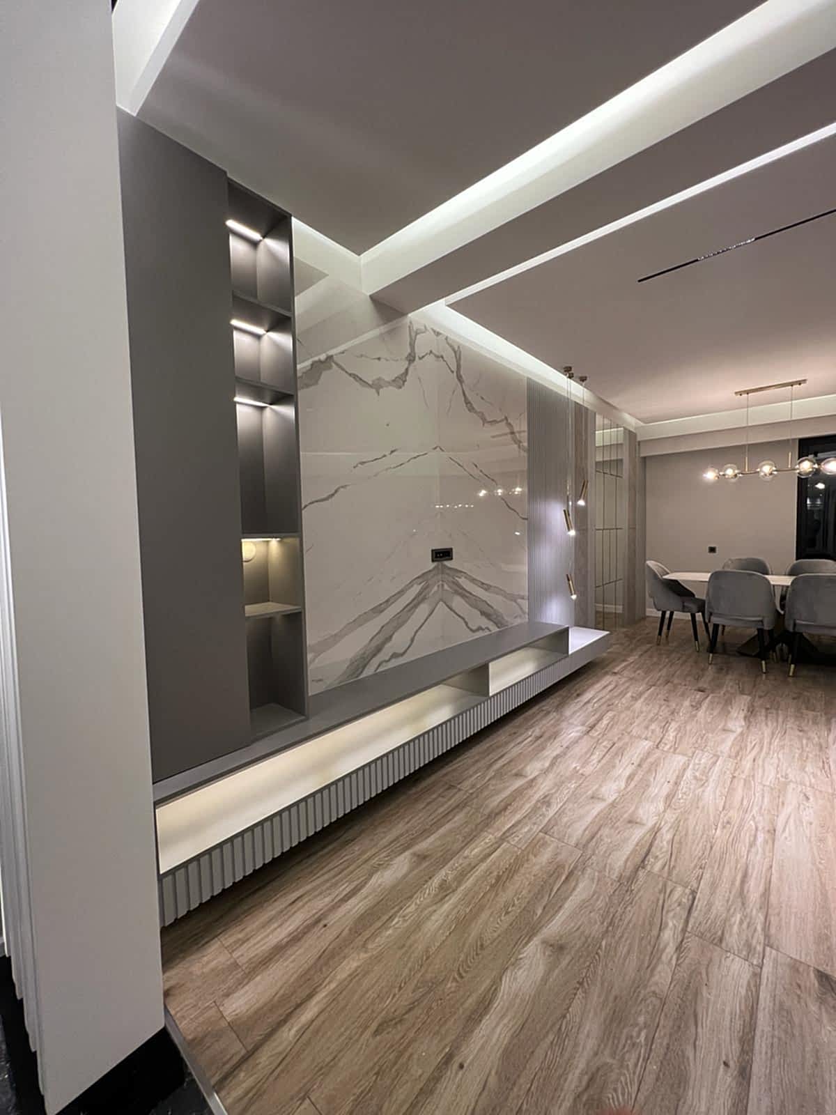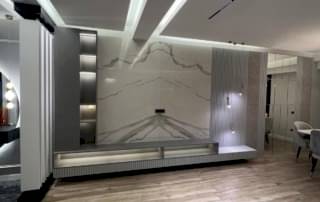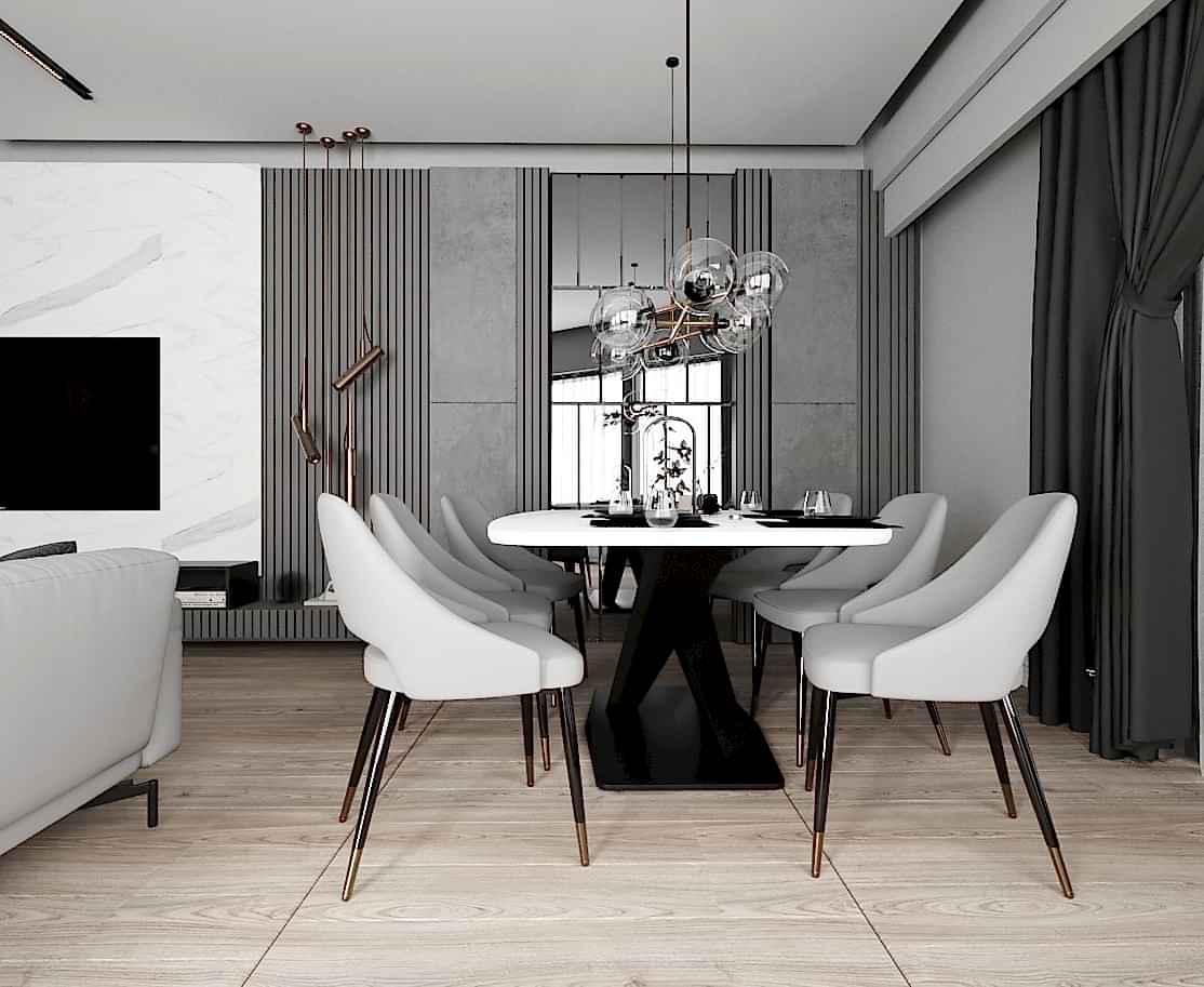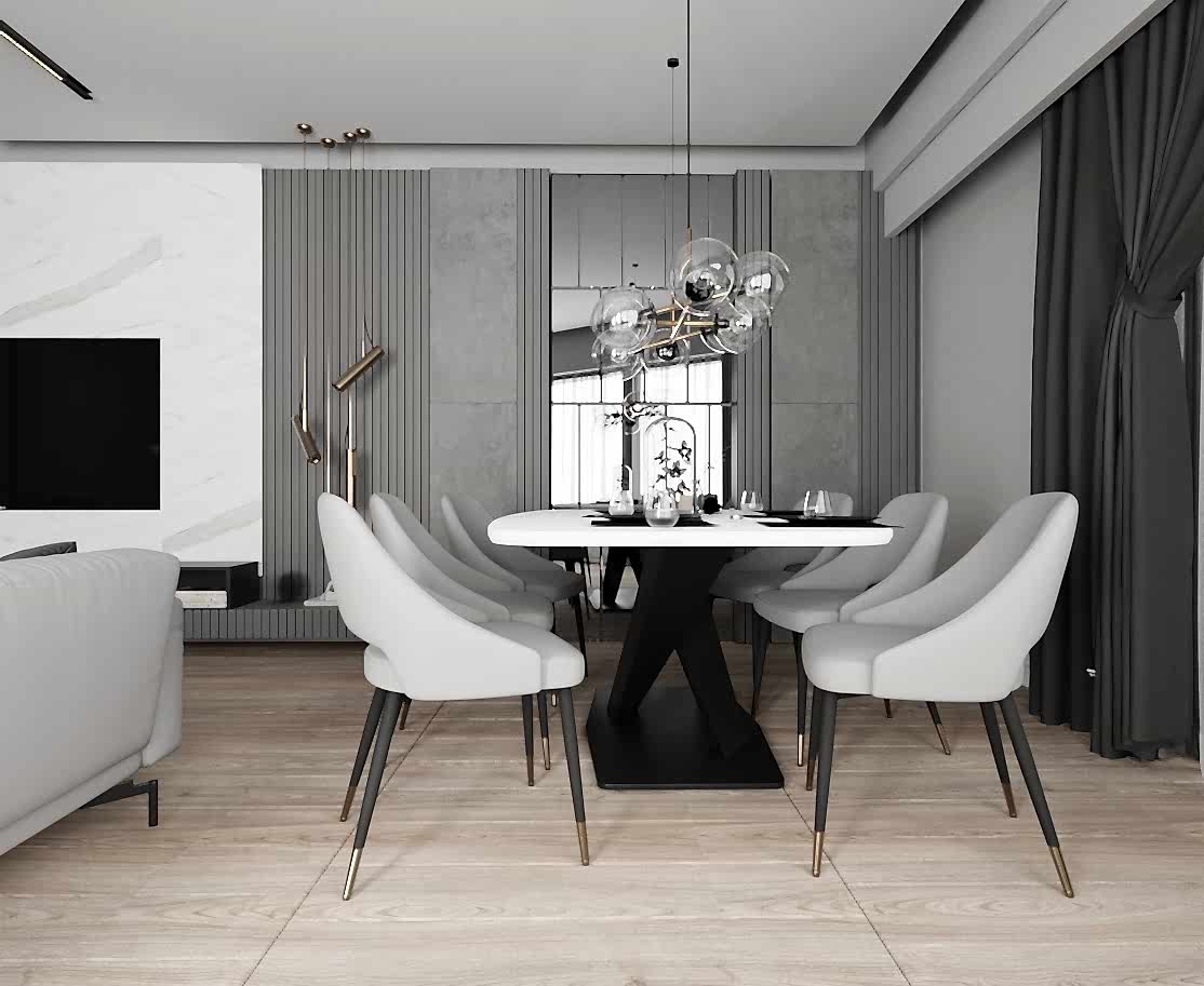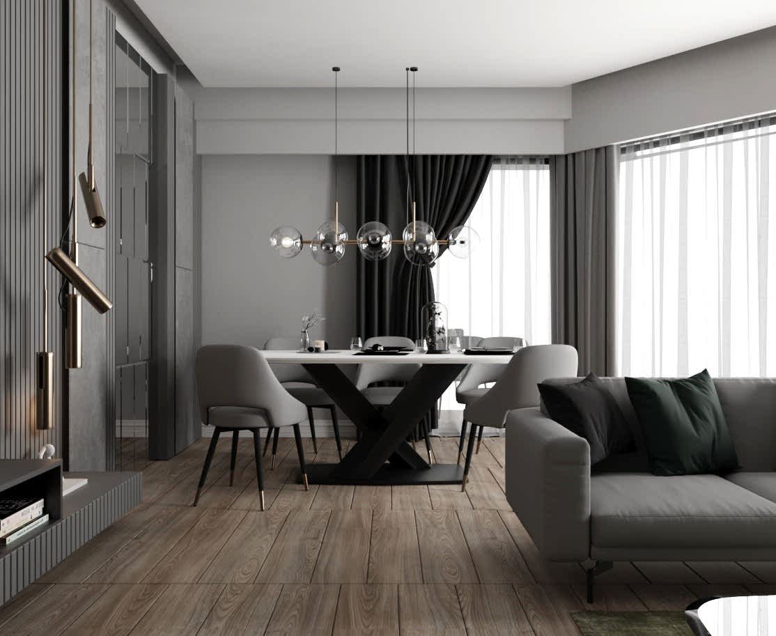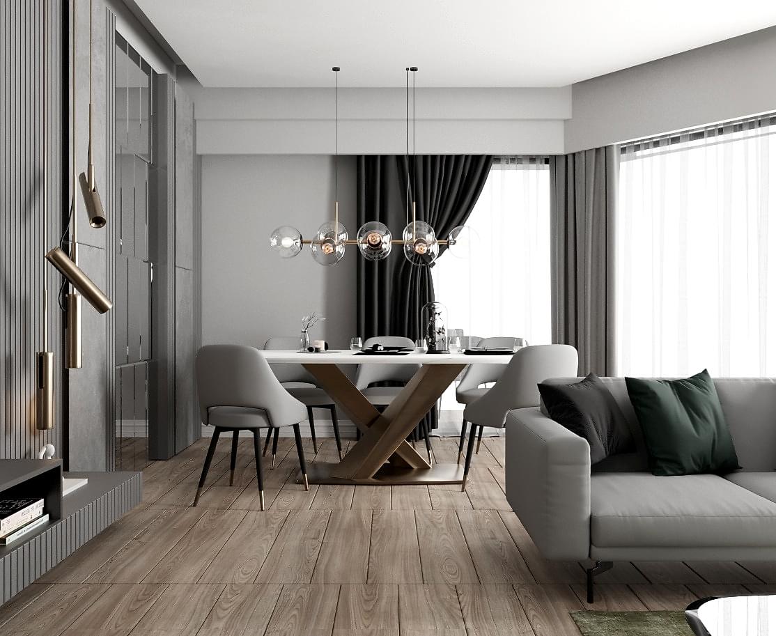 Salon alanında, TV alanı öne çıkıyor. Bu alanda, ayna duvar paneli ve seramik kullanımı ile modern bir tasarım oluşturulmuş. Boru sarkıt aydınlatma ise bu alanın tasarımını destekliyor ve mekânın estetik bütünlüğünü artırıyor. Ayrıca, parçalı asimetrik ayna, yemek alanının arkasında devam ederek TV duvarı tasarımıyla uyum içinde tamamlanıyor. Bu detaylar, salonu hem görsel olarak zenginleştiriyor hem de işlevsel bir tasarım sunuyor.