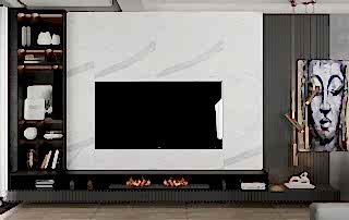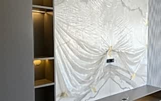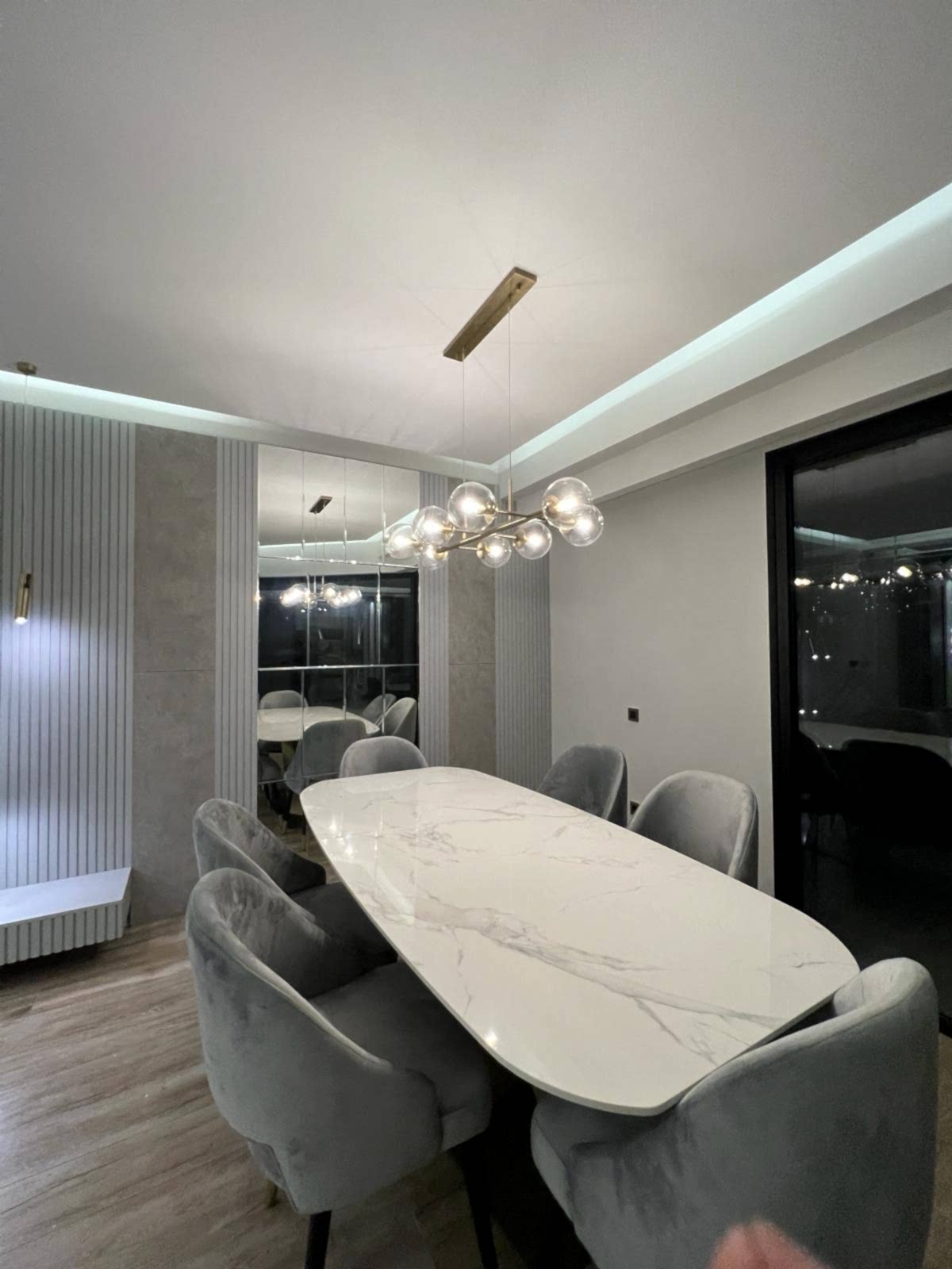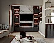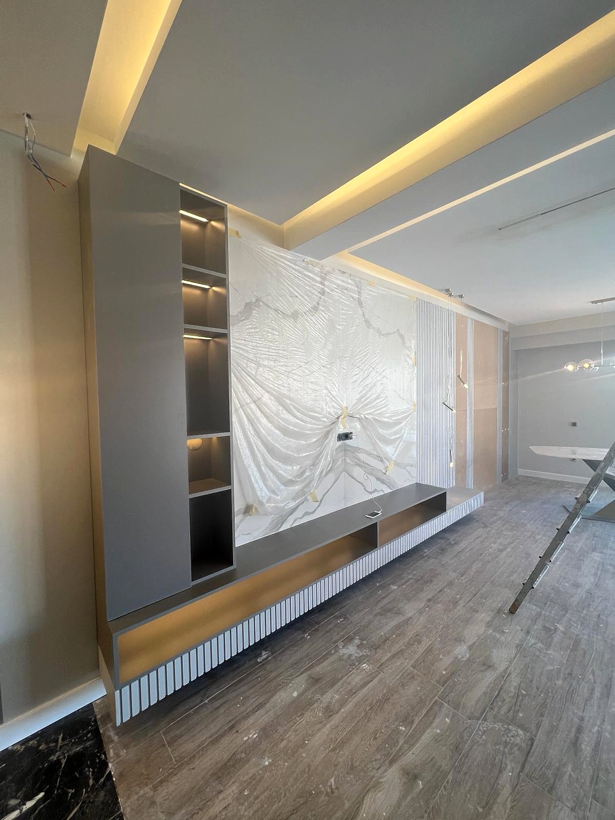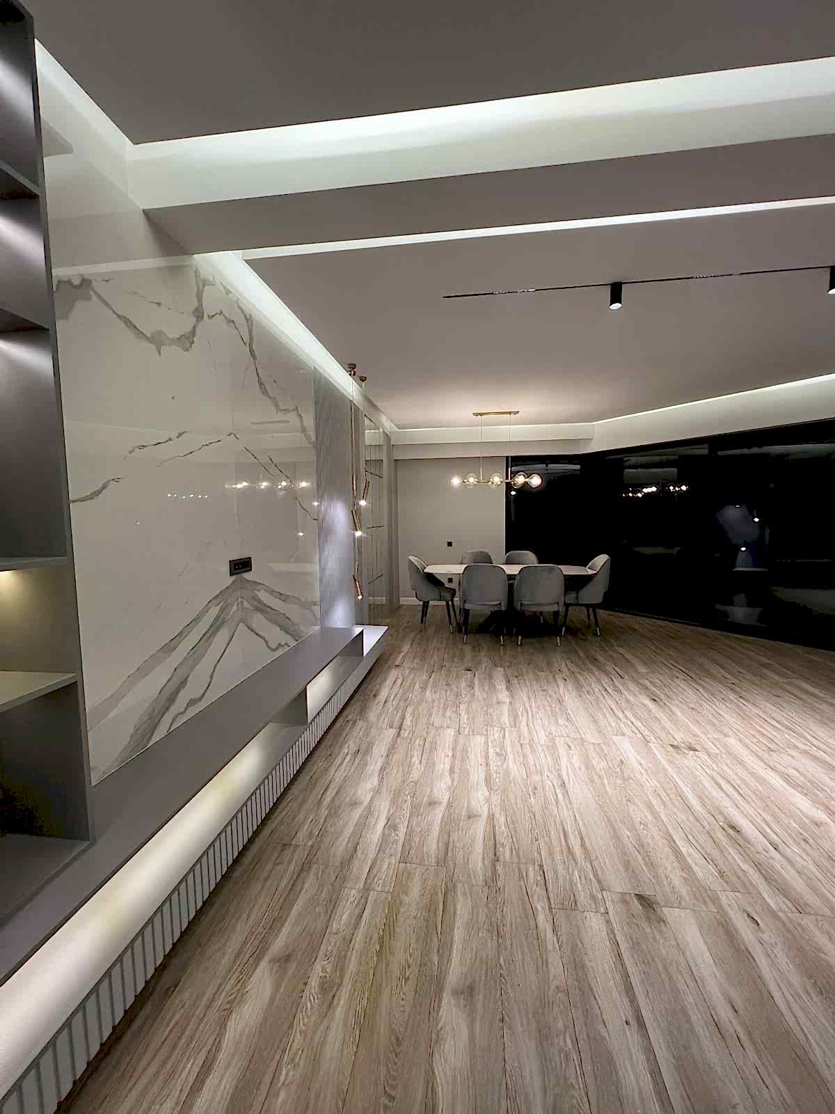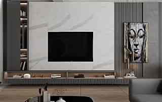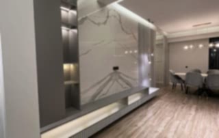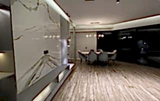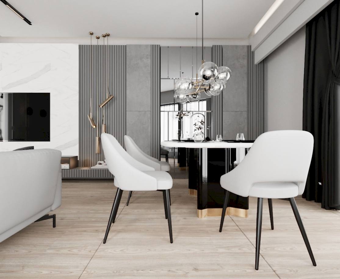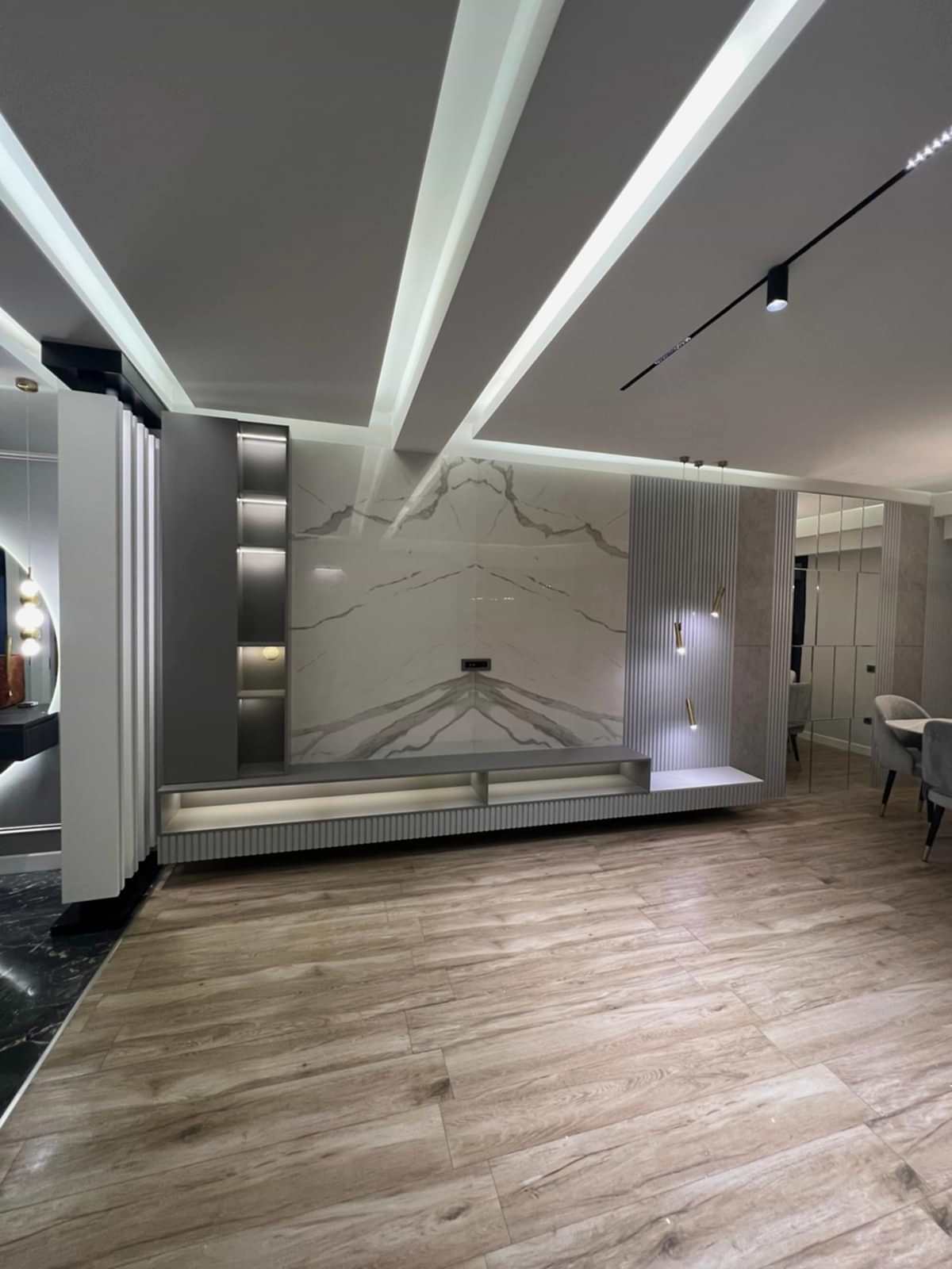 Salon alanında, TV alanı öne çıkıyor. Bu alanda, ayna duvar paneli ve seramik kullanımı ile modern bir tasarım oluşturulmuş. Boru sarkıt aydınlatma ise bu alanın tasarımını destekliyor ve mekânın estetik bütünlüğünü artırıyor. Ayrıca, parçalı asimetrik ayna, yemek alanının arkasında devam ederek TV duvarı tasarımıyla uyum içinde tamamlanıyor. Bu detaylar, salonu hem görsel olarak zenginleştiriyor hem de işlevsel bir tasarım sunuyor.