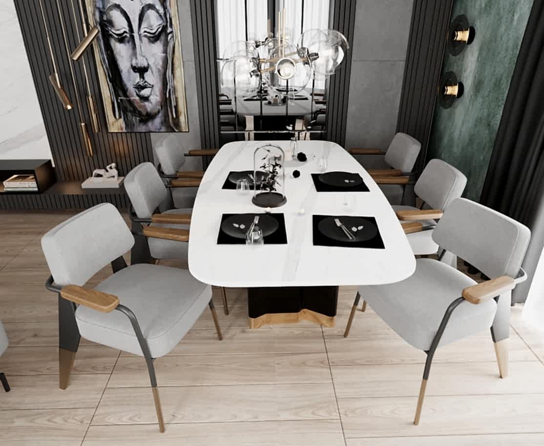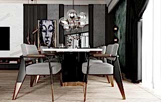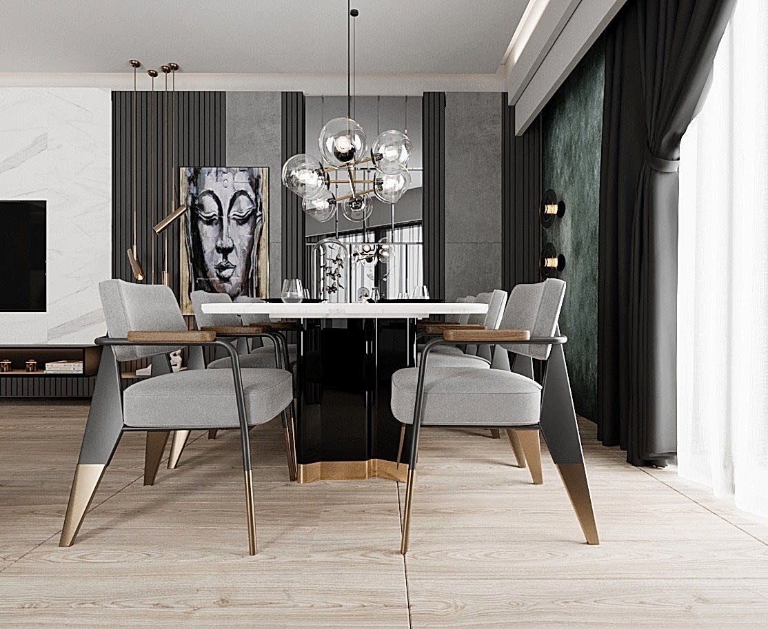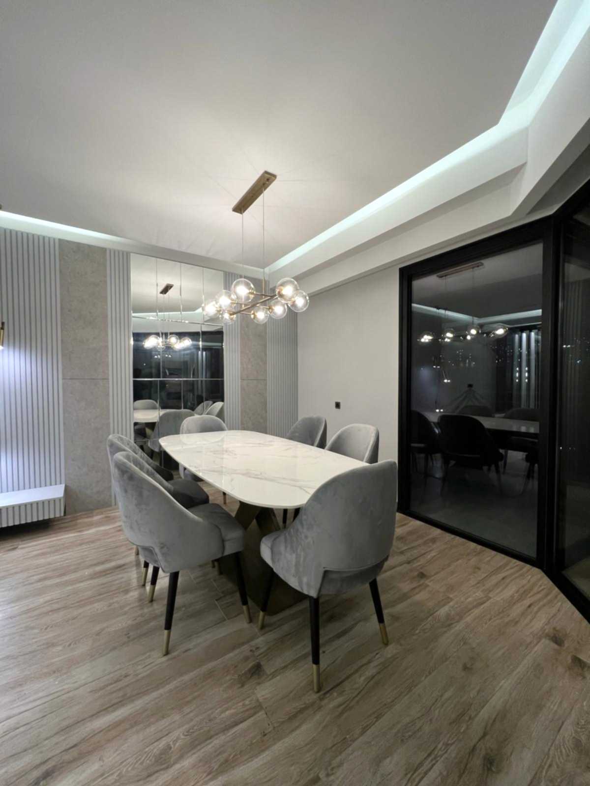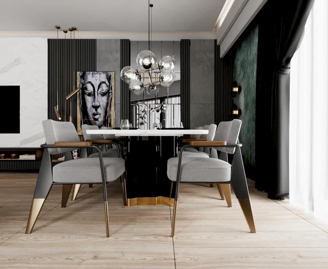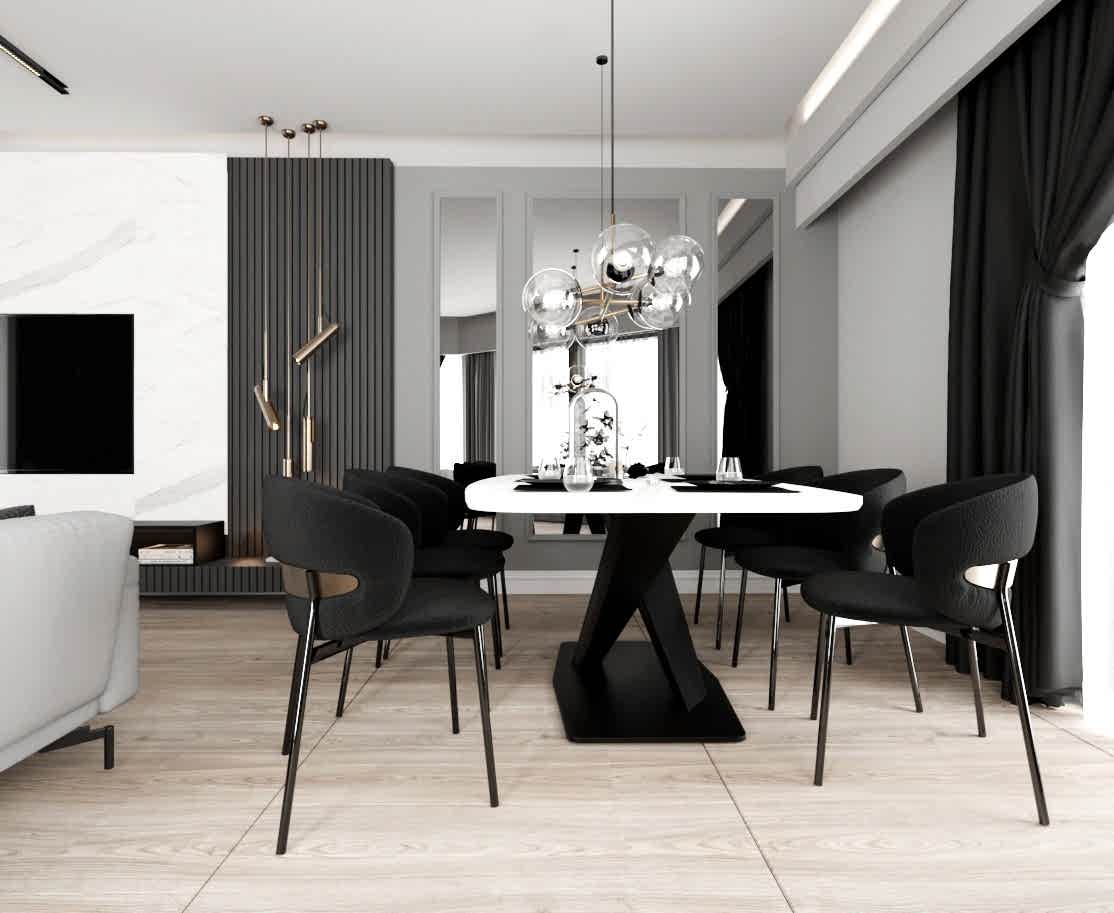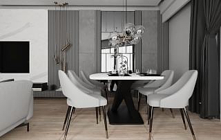 Yemek alanında ise, eskitme renkli yemek masası ayağı, girişteki dresuar ayağıyla uyumlu bir şekilde kombine edilmiş. Bu tasarım detayı, mekânda bütünlük oluştururken, aynı zamanda şıklığı artırıyor. Sarkıt aydınlatma, yemek alanındaki tasarımı destekliyor ve yemek yemek için rahat bir ortam sağlıyor.