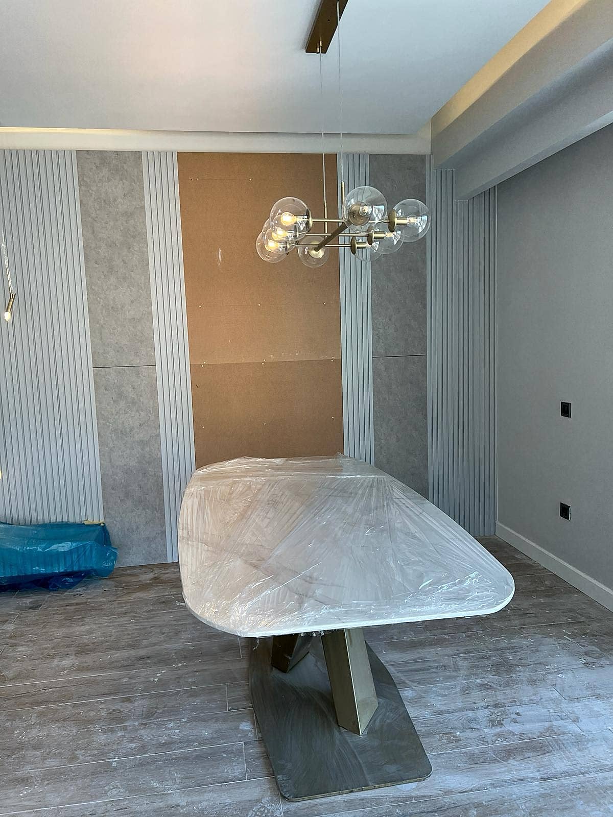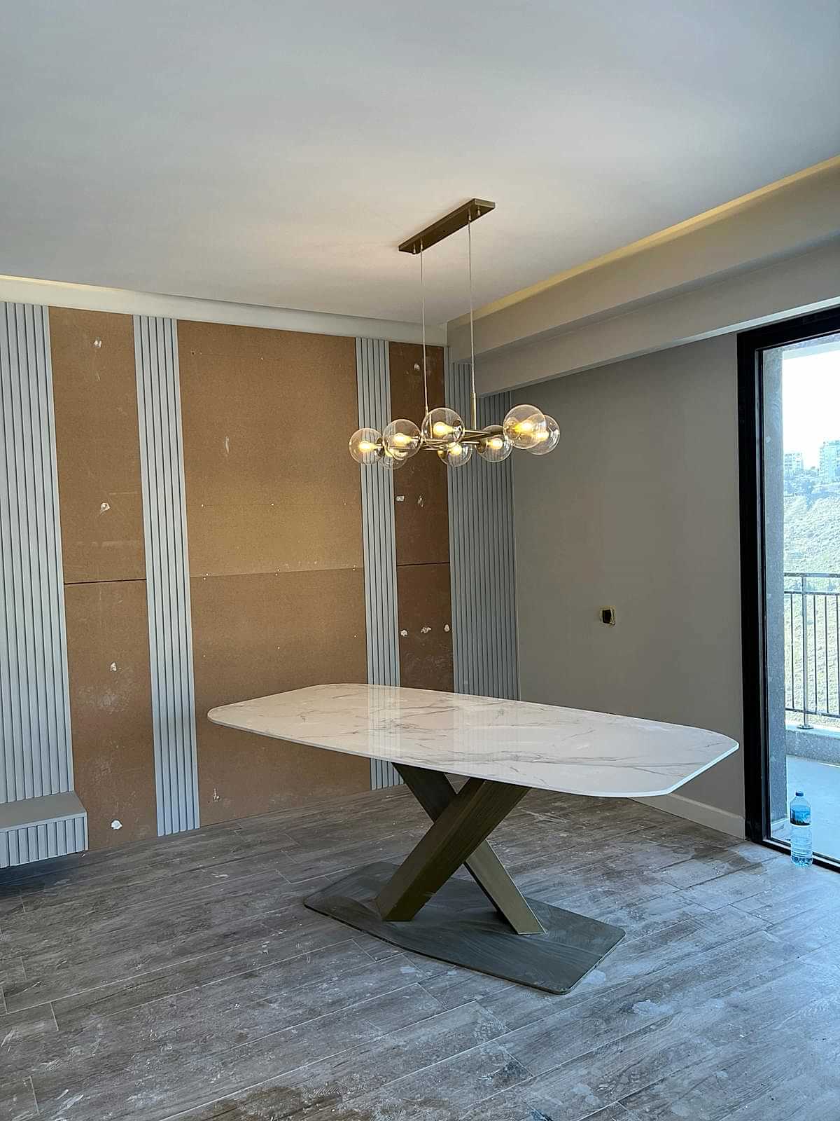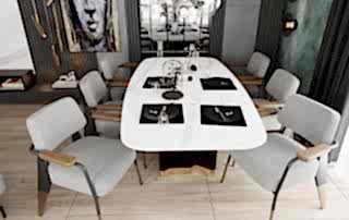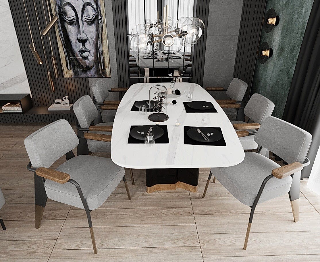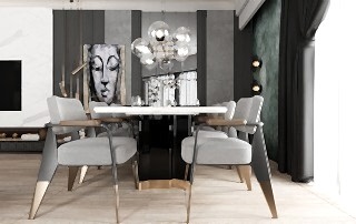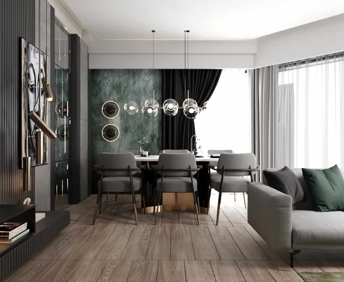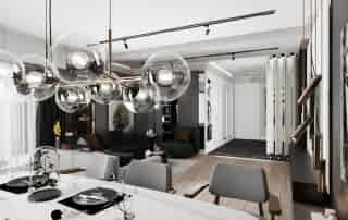 Yemek alanında ise, eskitme renkli yemek masası ayağı, girişteki dresuar ayağıyla uyumlu bir şekilde kombine edilmiş. Bu tasarım detayı, mekânda bütünlük oluştururken, aynı zamanda şıklığı artırıyor. Sarkıt aydınlatma, yemek alanındaki tasarımı destekliyor ve yemek yemek için rahat bir ortam sağlıyor.