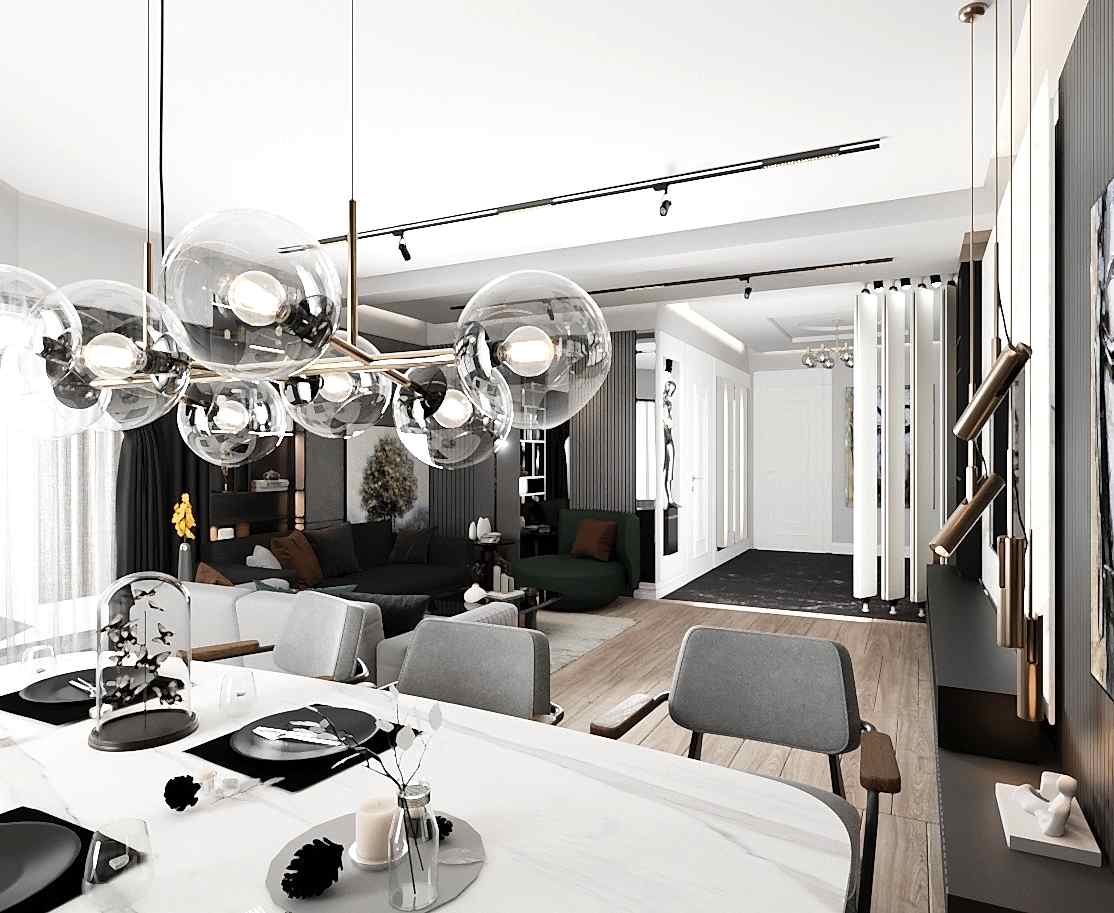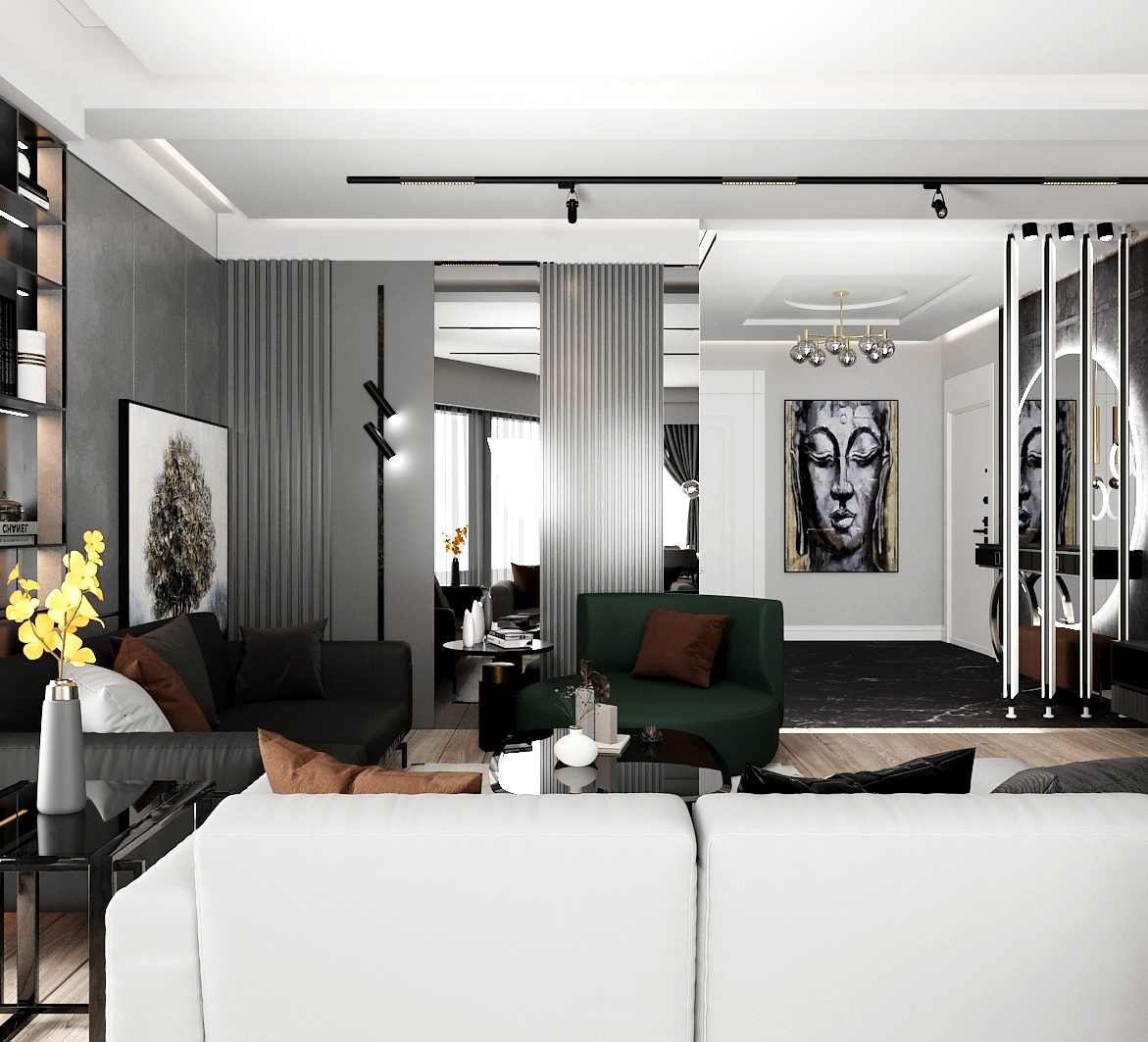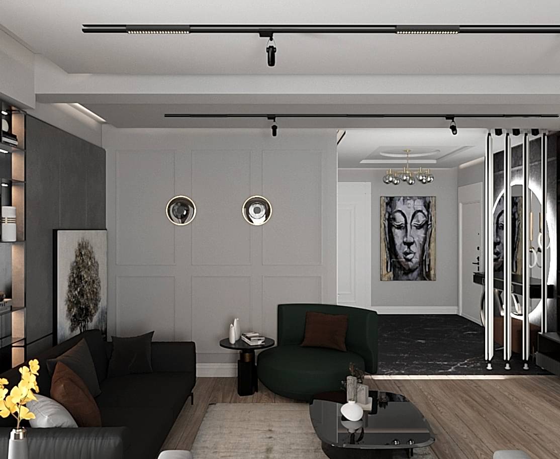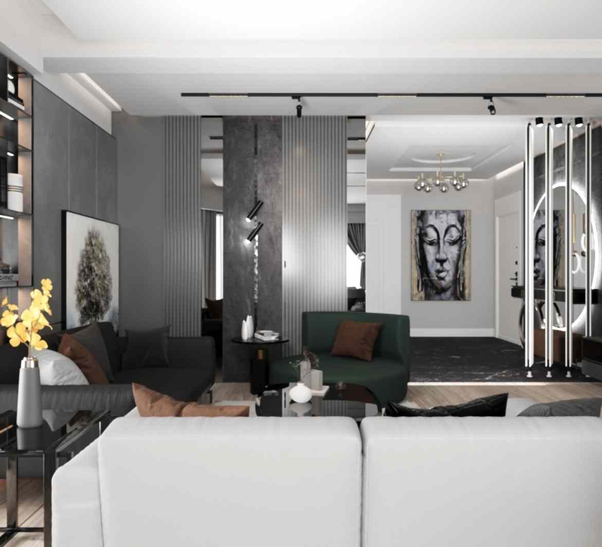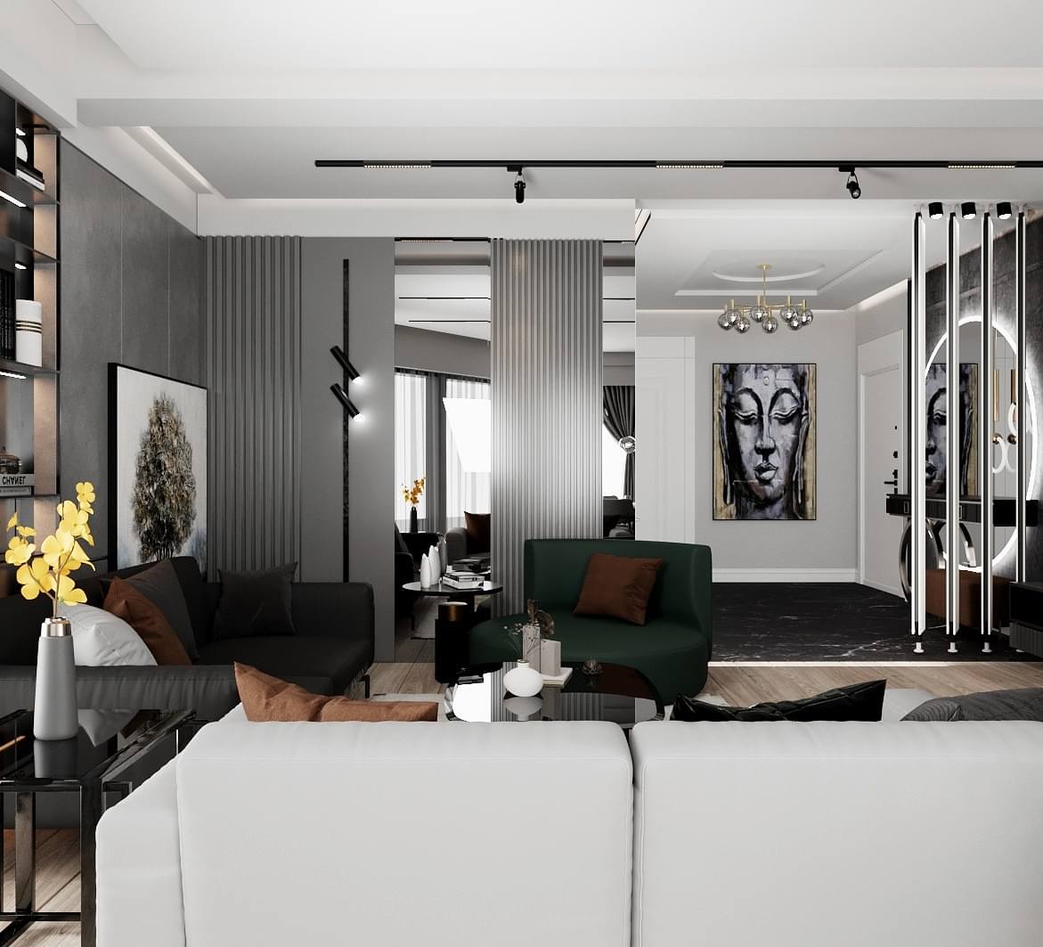 Çiğli Sirius Projesi, modern tasarım anlayışını fonksiyonellik ve şıklıkla birleştirerek zarif bir yaşam alanı sunuyor. Projede yer alan giriş ve salon tasarımı, kullanılan estetik detaylarla mekânları hem işlevsel hem de görsel açıdan etkileyici hale getiriyor. Giriş alanının hacmi büyük olduğu için tasarım açısından oldukça elverişli bir alan yaratılmış ve her detay özenle düşünülerek projeye dahil edilmiştir.